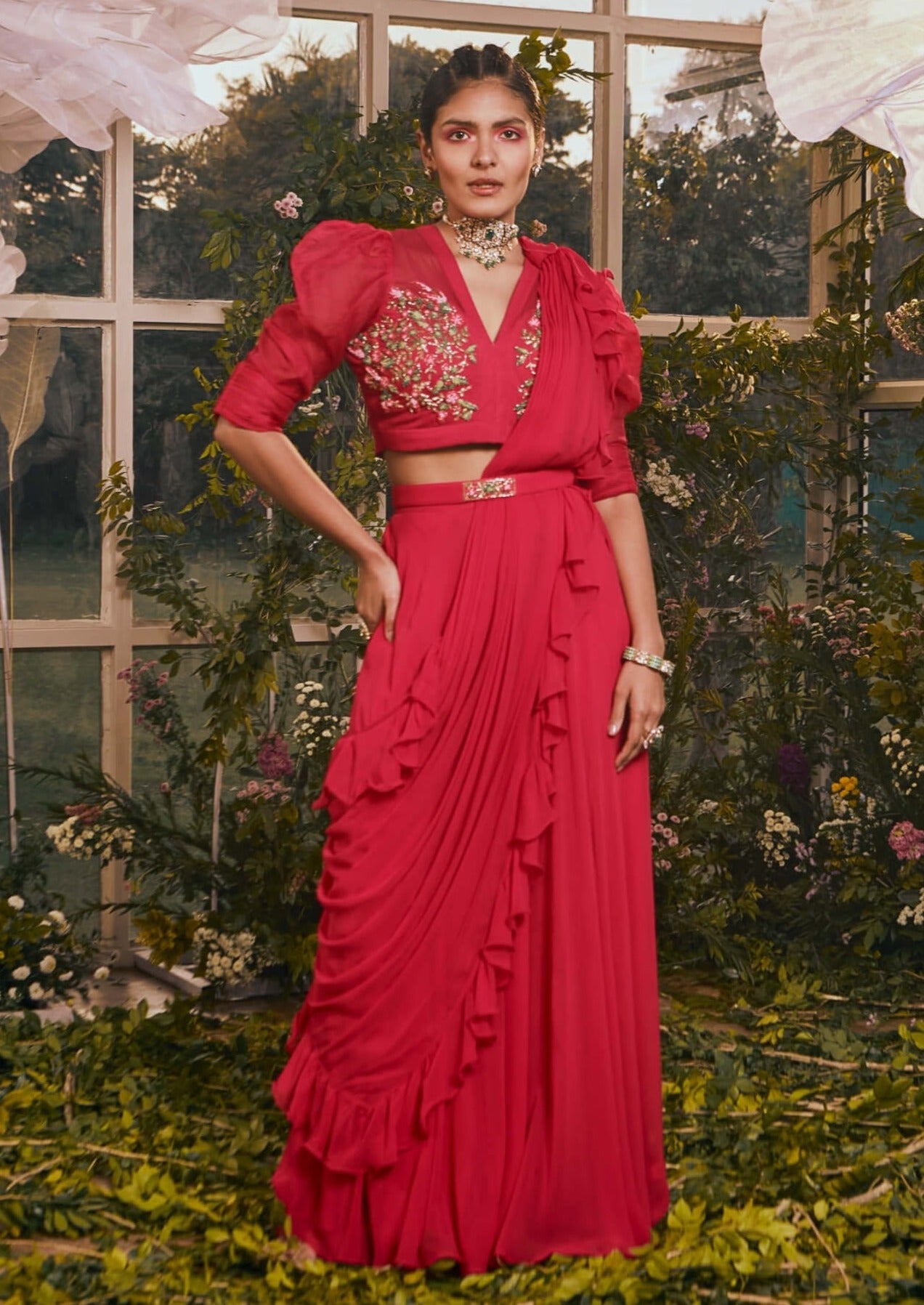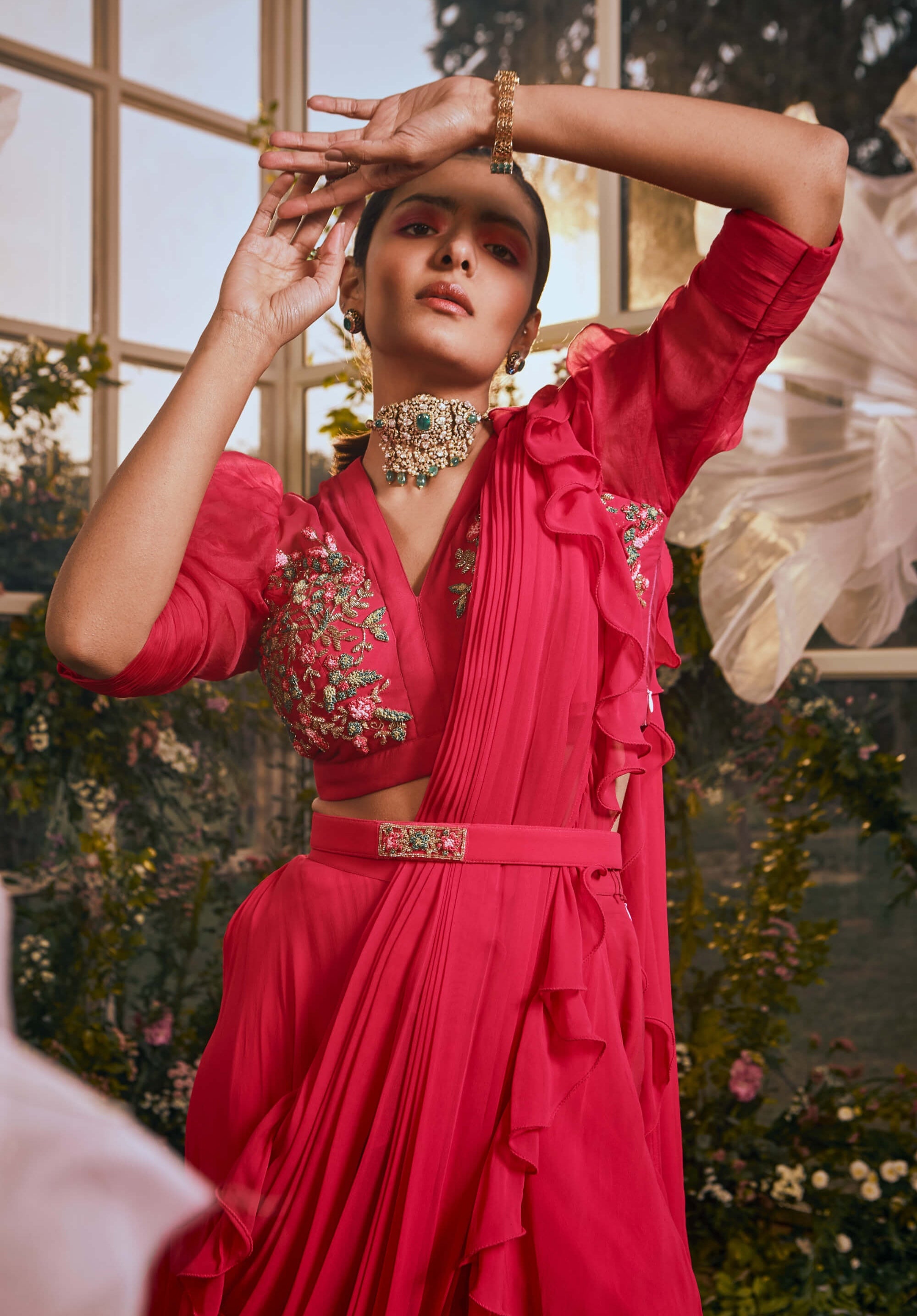 An attached drape cascades gracefully from the waist, creating a dynamic, ethereal effect, while the coordinating belt cinches the waist for a flattering fit. Crafted from a blend of georgette, net, and organza, this set provides a luxurious feel and a refined look. Perfect for evening events, parties, and festive occasions, this ensemble ensures you stand out with its vivid hue and delicate detailing.