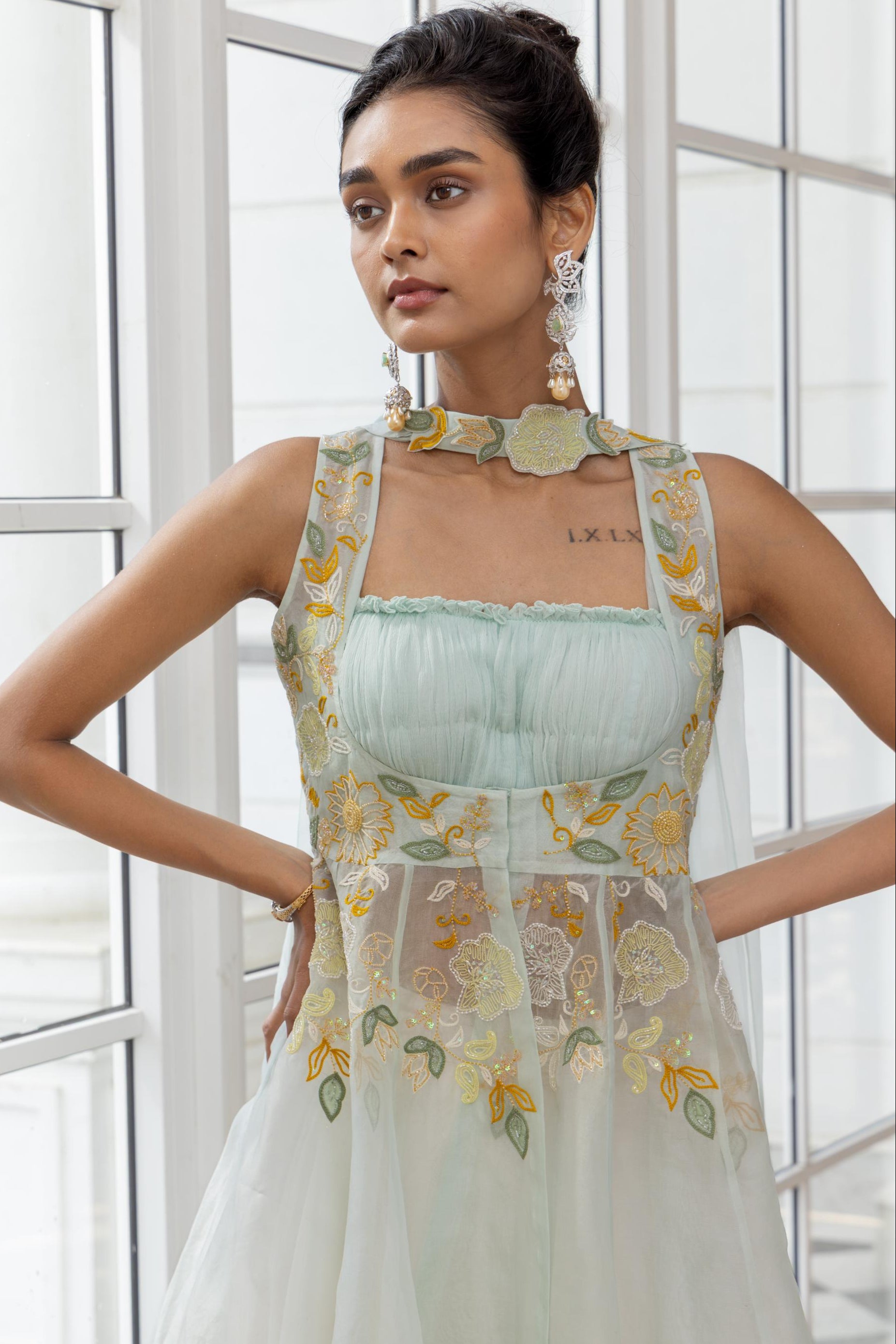 The Alarice Paint Me Floral peplum jacket set by House of Armuse features intricate embroidery layered with hand-painted floral detailing. The peplum jacket adds definition to the silhouette, while the coordinated set ensures ease of styling. Perfect for cocktail nights, sangeet functions, or destination weddings, this outfit delivers statement elegance with refined craftsmanship and modern appeal.