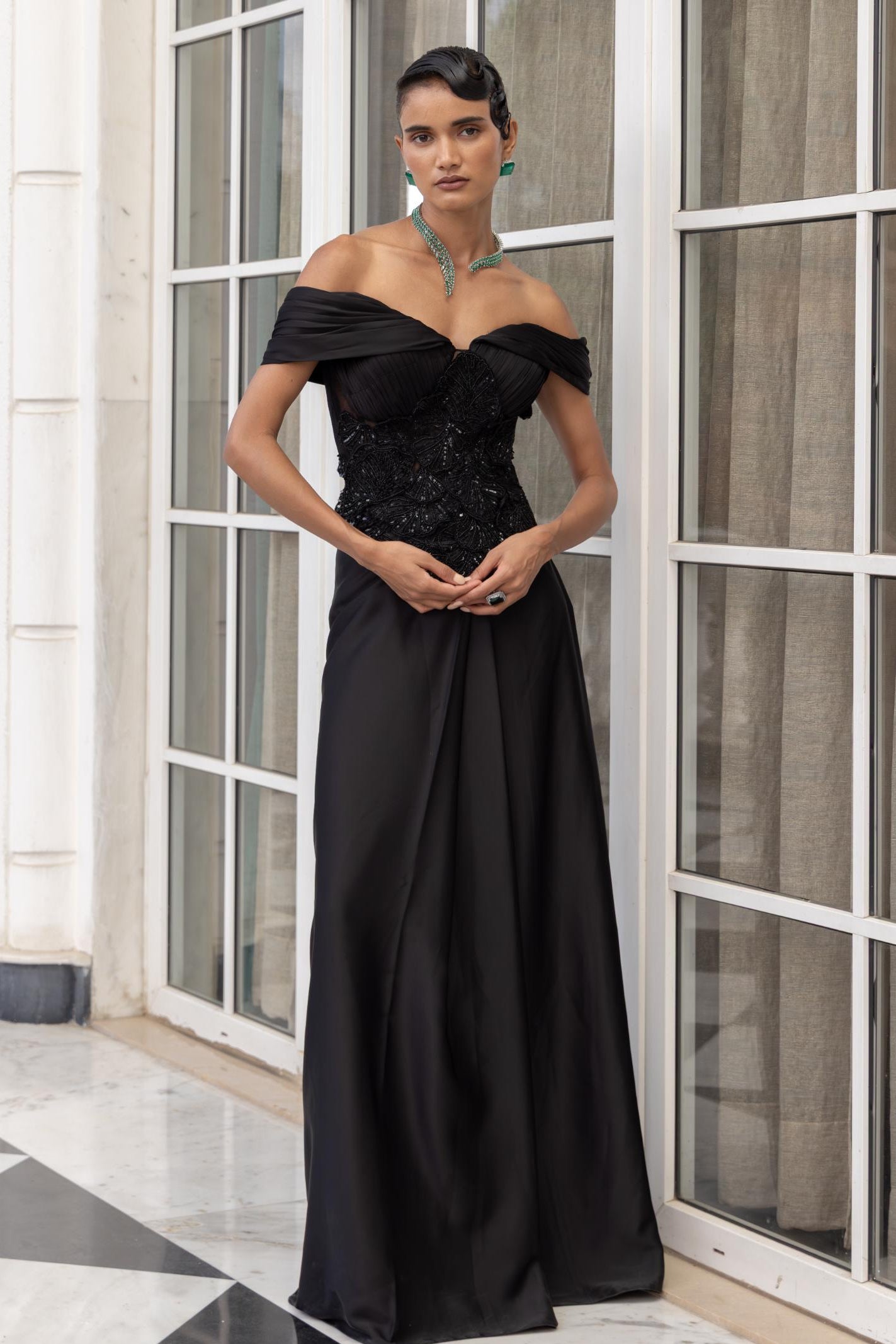 Dramatic and refined, this gown blends deep black tones with shimmering stardust. Ideal for receptions or formal evenings, the gown exudes sophistication. The structured yet fluid silhouette ensures the gown moves beautifully. Lightweight construction keeps the gown comfortable through long events. A modern classic, this gown enhances upscale celebrations. A striking ensemble, this gown defines contemporary evening wear.