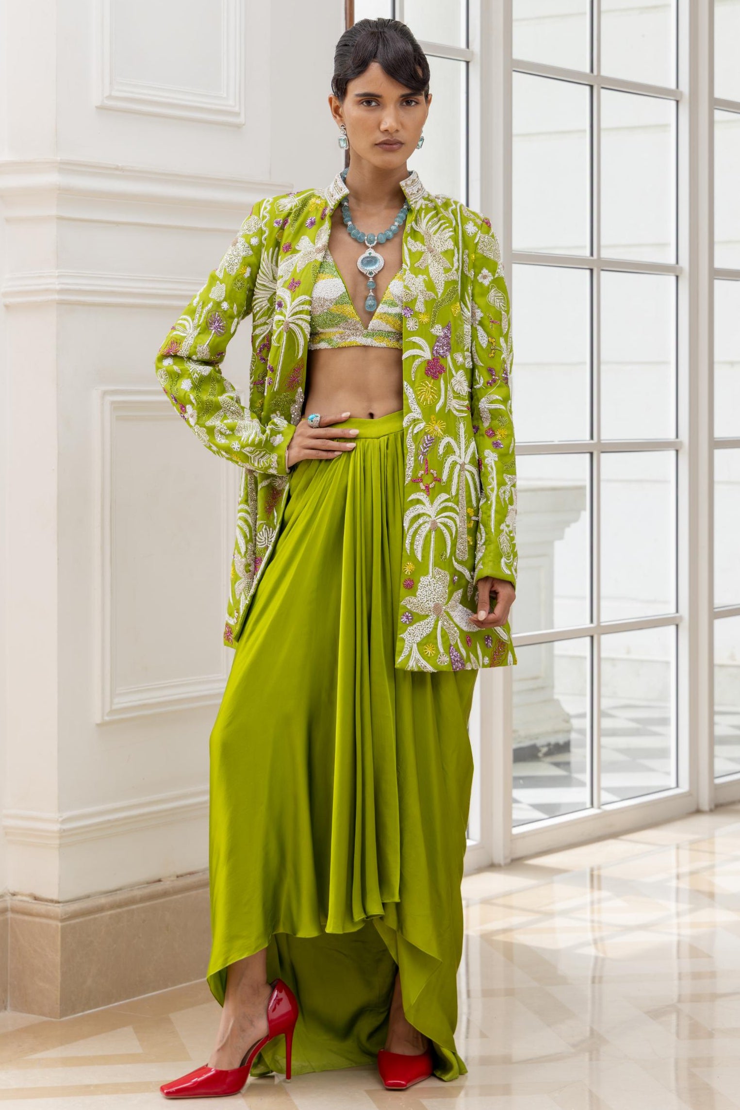 Bright and festive, this skirt set blends parrot green tones with fluid draping. Lightweight flow keeps the skirt set comfortable. Floral accents elevate the skirt set beautifully. Ideal for haldi and mehendi, this skirt set pairs with floral jewellery. A lively ensemble, this skirt set flatters all silhouettes. Elegant and youthful, this skirt set enhances every celebration.
