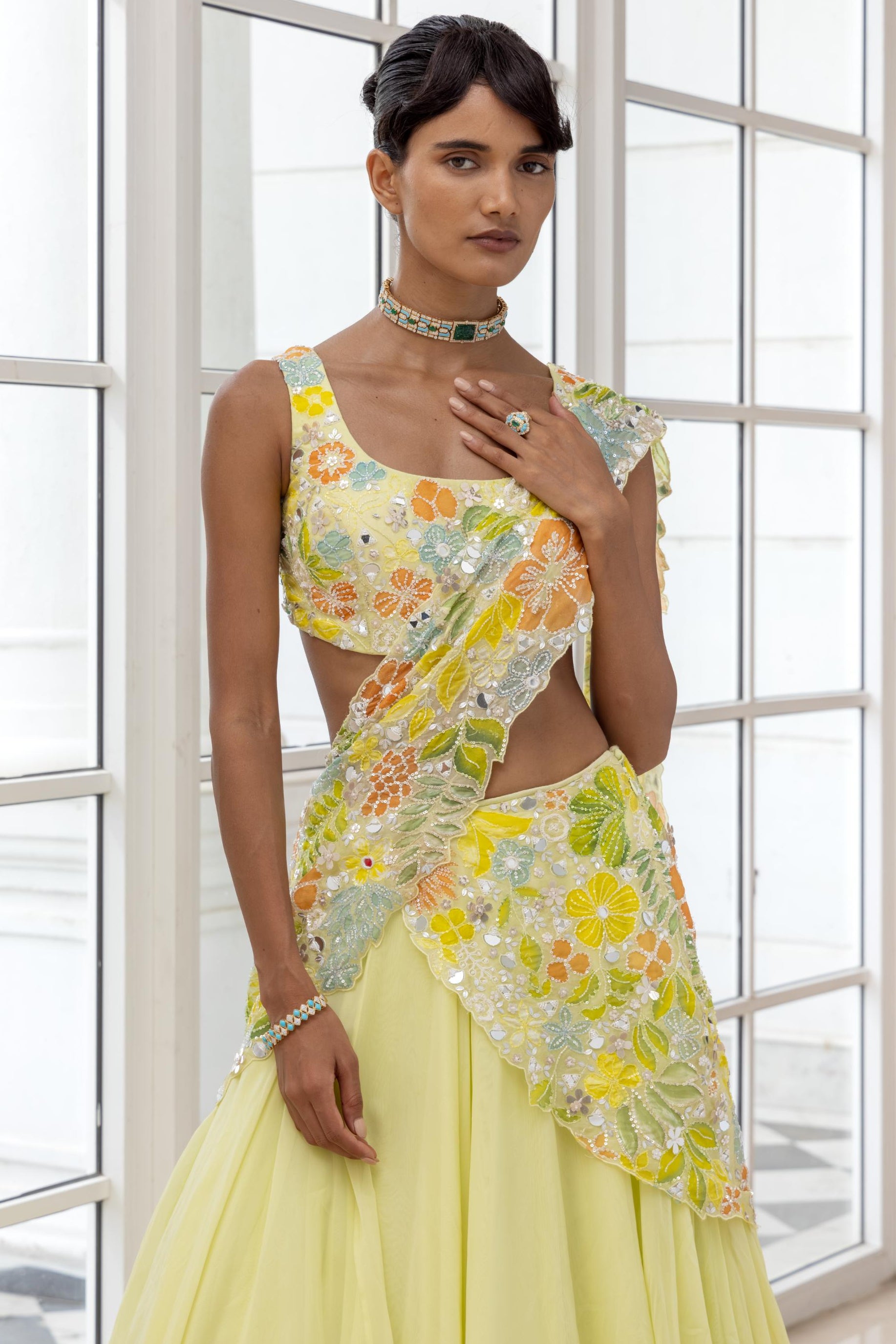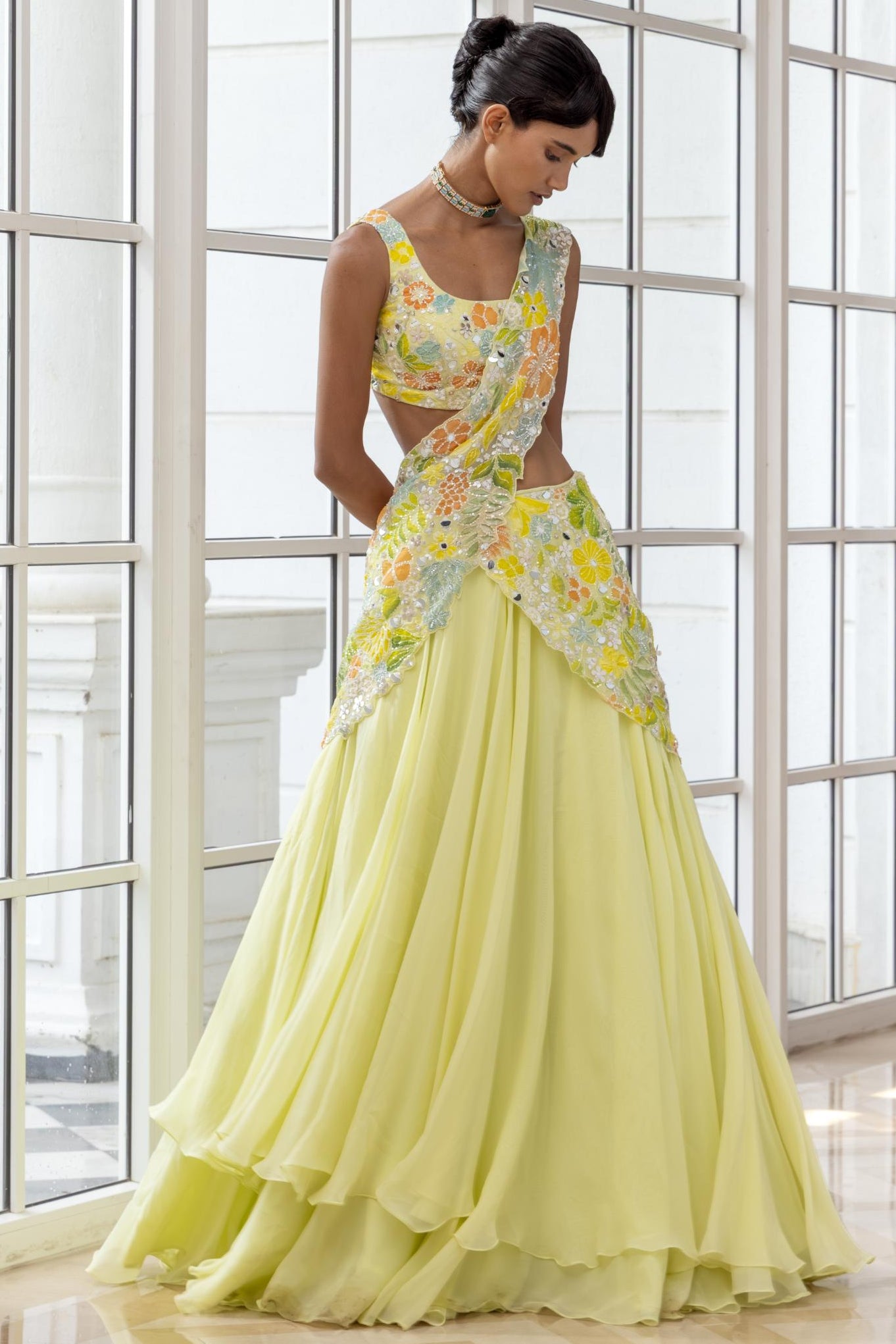 This Mirelle floral lehenga set blends elegance with soft movement. Perfect for weddings, festive evenings, and sangeet celebrations, the floral detailing brings feminine charm with a modern edge.
