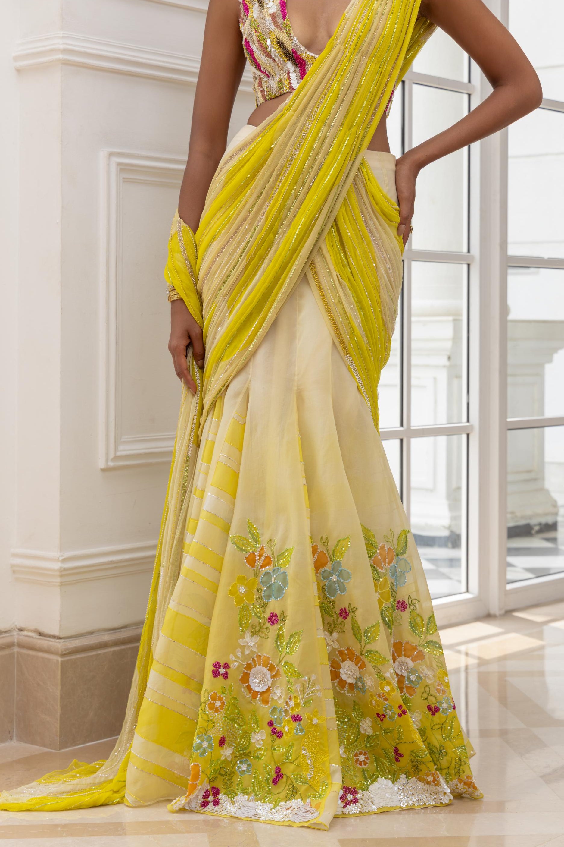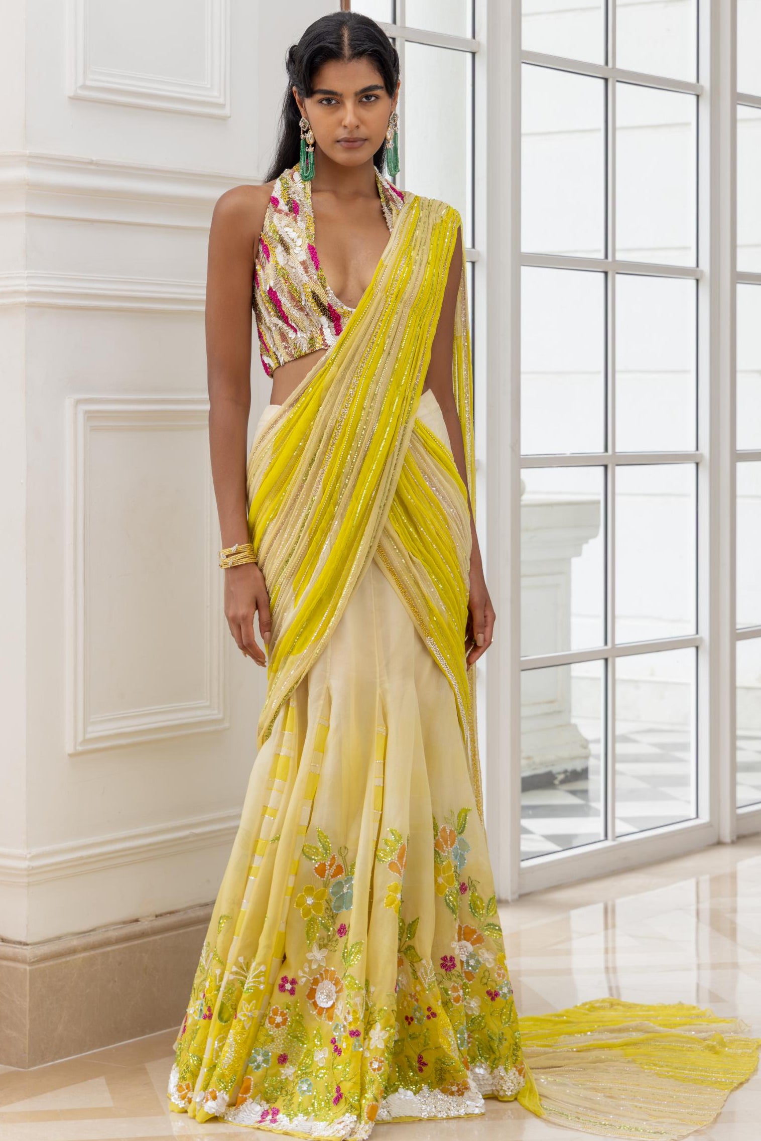 Elegant and fluid, this draped saree blends floral detailing with airy movement. Godet kali construction enhances the draped saree, adding dynamic flow. Lightweight fabric keeps the draped saree comfortable for long celebrations. Perfect for sangeets, this draped saree pairs beautifully with pastel accessories. Modern in finish, this draped saree flatters effortlessly. A refined ensemble, this draped saree brightens festive dressing.