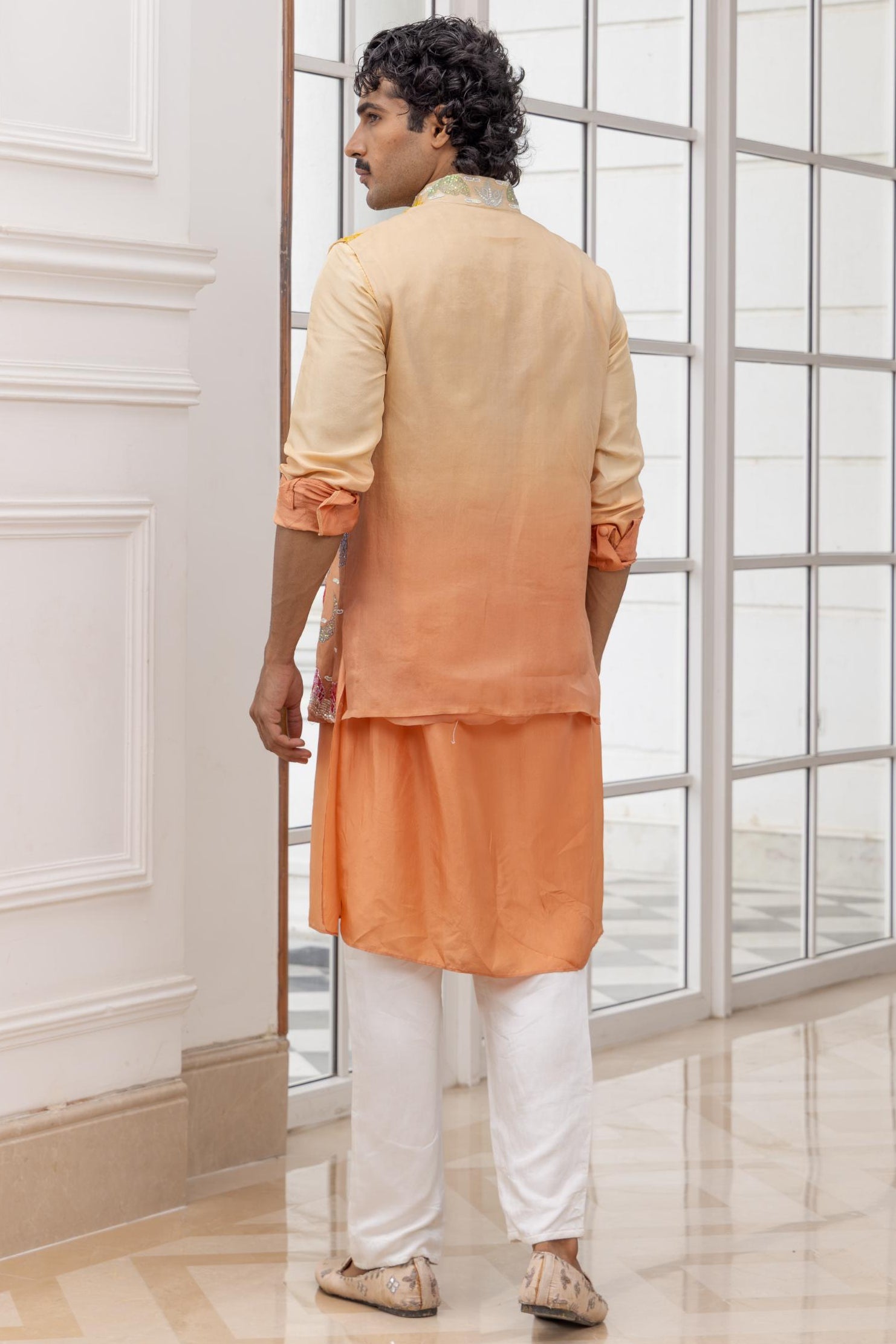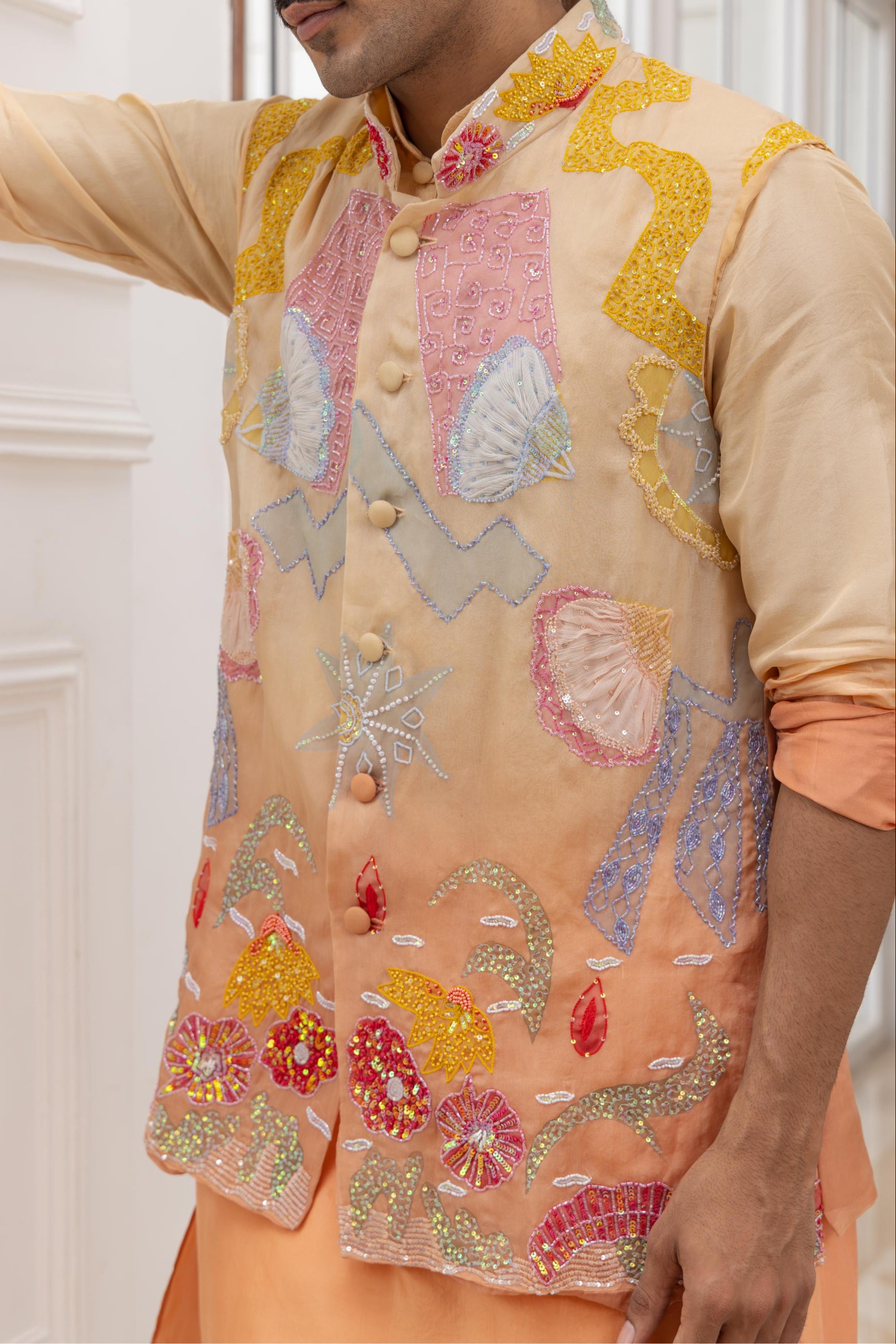 Crafted for modern grooms and wedding attendees, this peach ombre Paint Me Floral bundi set by House of Armuse blends artisanal painting with refined embroidery. The bundi showcases floral artistry layered over a fluid colour gradient, offering a sophisticated yet expressive look. Ideal for mehendi functions, destination weddings, or festive evenings, this ensemble balances traditional craftsmanship with contemporary appeal.