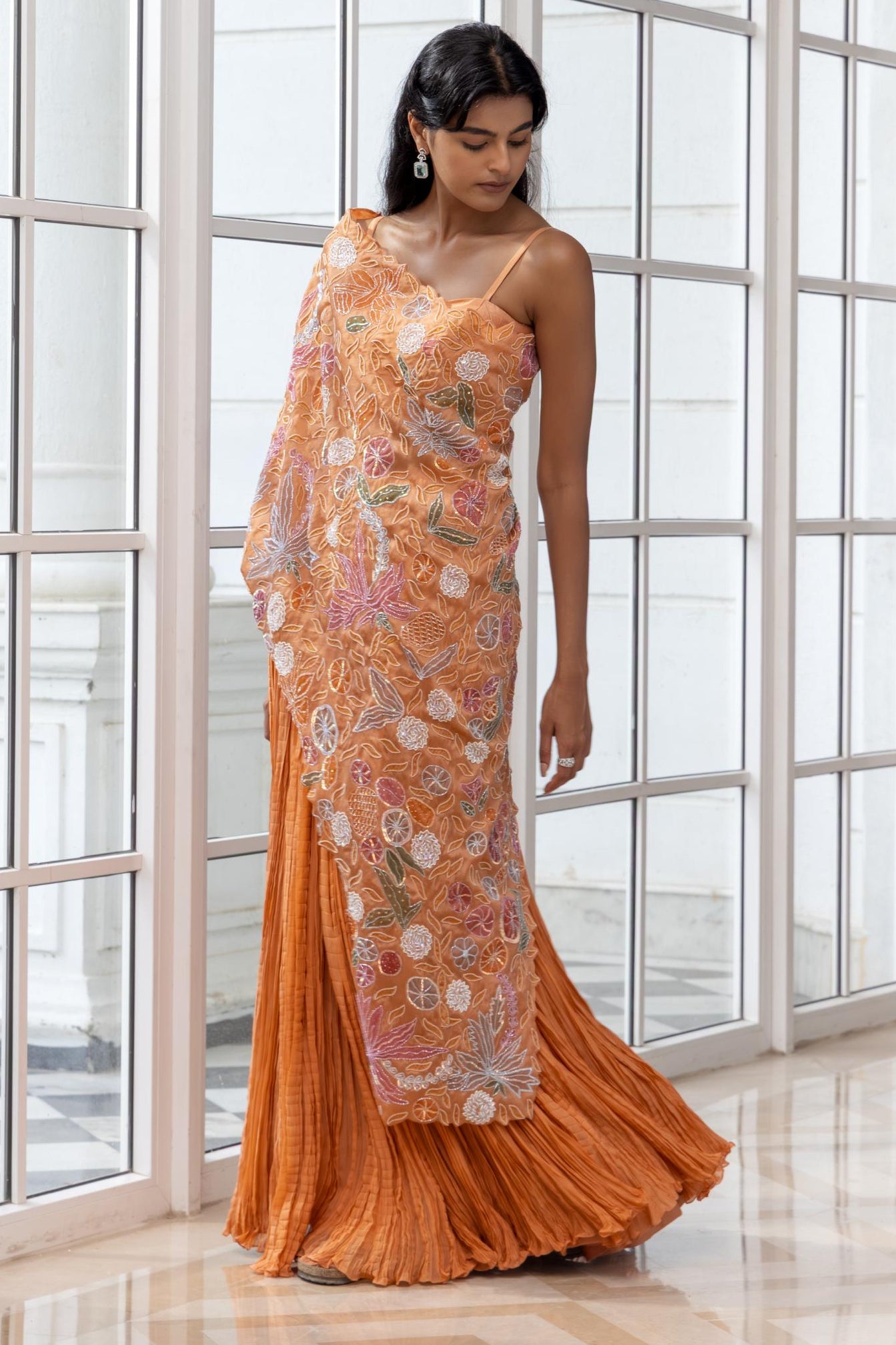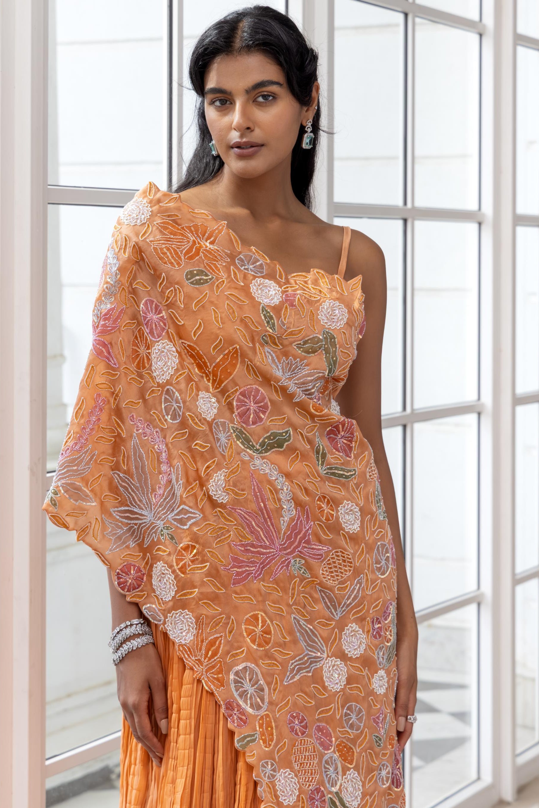 Zinnia by House of Armuse is a vibrant expression of movement and colour. The orange embroidered cape set, accented with hand-painted florals, delivers a dramatic yet wearable silhouette for festive and wedding occasions.