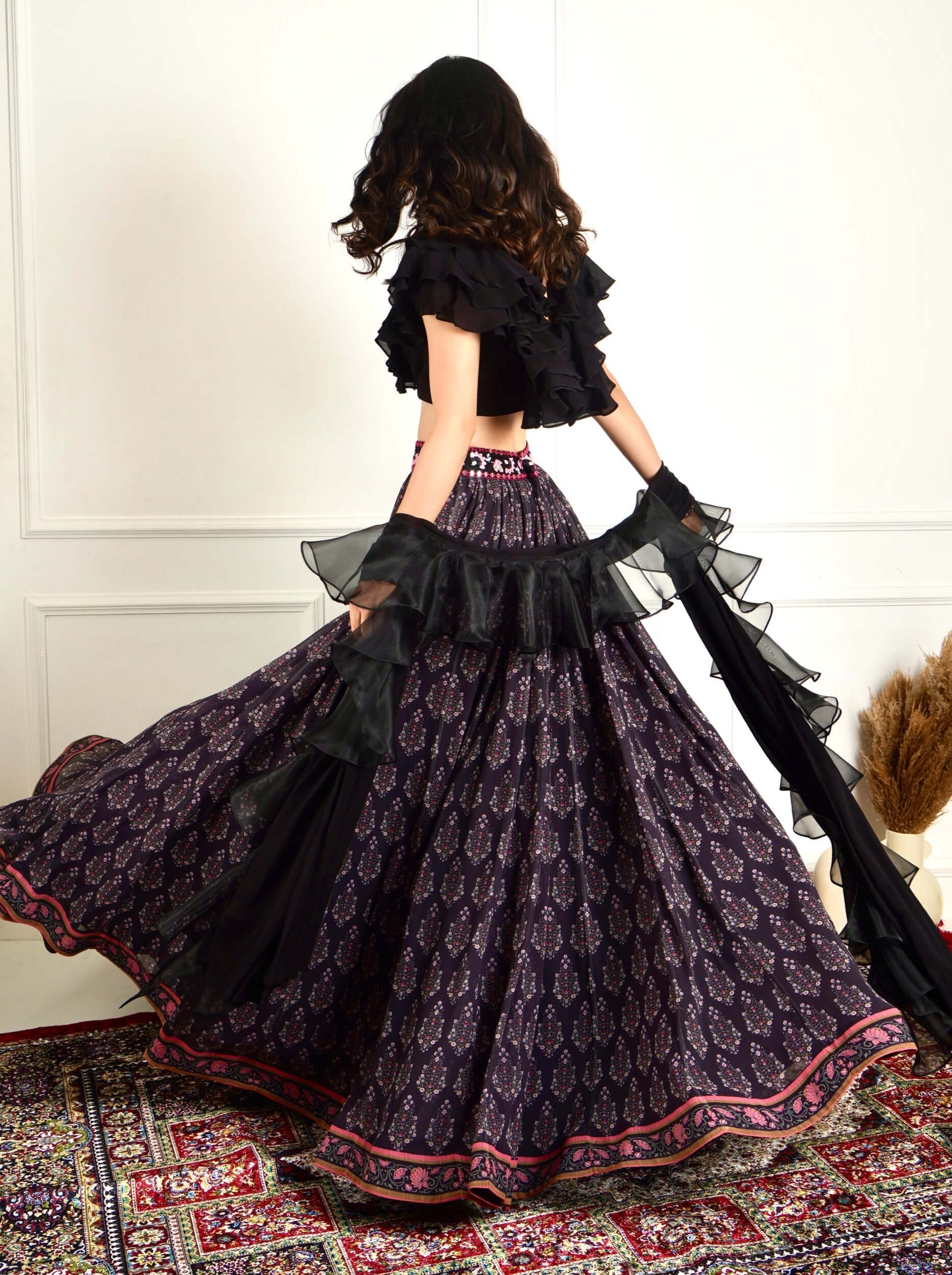 Step into elegance with this captivating ensemble featuring a black chiffon ruffled blouse paired harmoniously with a damask printed chiffon lehenga and complemented by a matching ruffled dupatta. The blouse's delicate ruffles and intricate detailing perfectly complement the rich, textured patterns of the lehenga, creating a look that blends traditional charm with contemporary flair. Ideal for festive gatherings and special occasions, this ensemble promises to make a timeless statement of grace and sophistication.
