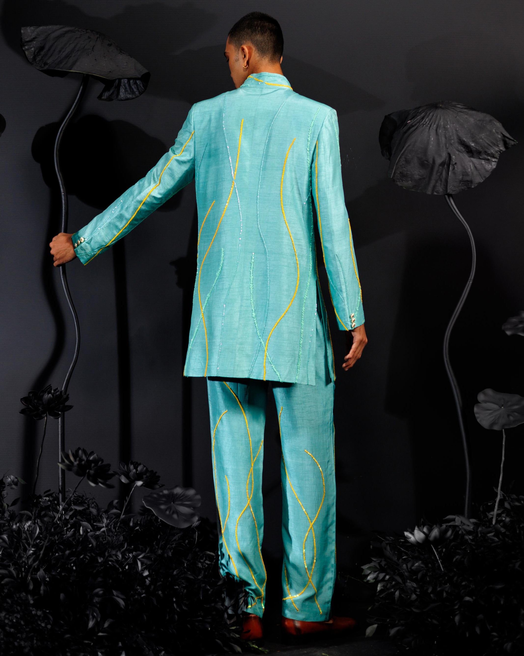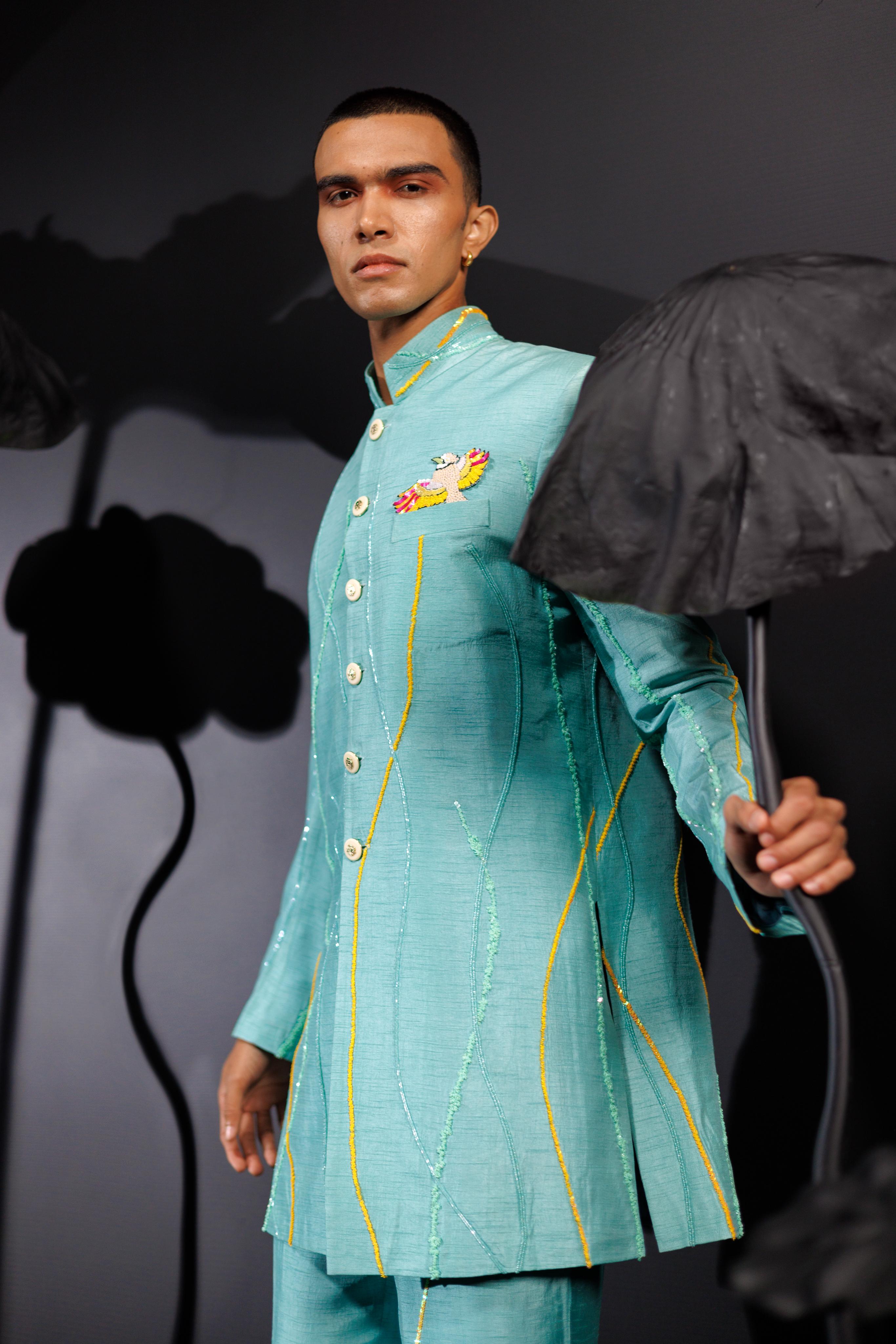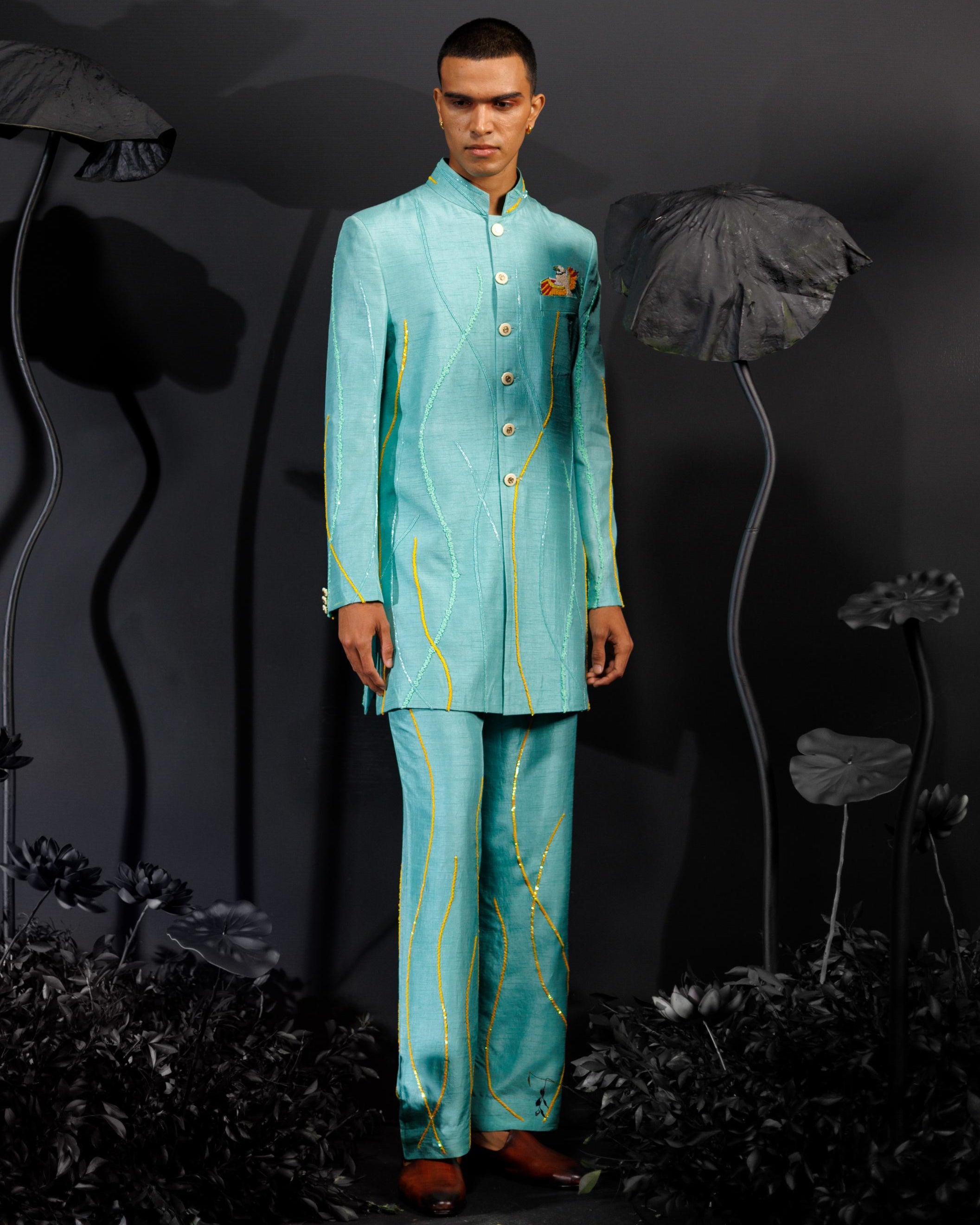 The Island Breeze Indo Western ensemble from Nautanky is a vibrant turquoise suit designed for lively, colorful celebrations. Featuring full sleeves, 3D sequined lines, and tropical bird motifs, it embodies modern flair and joyful elegance. The bold hues and playful patterns make it the perfect choice for festive events that embrace vibrancy, ensuring you stand out with style and confidence.