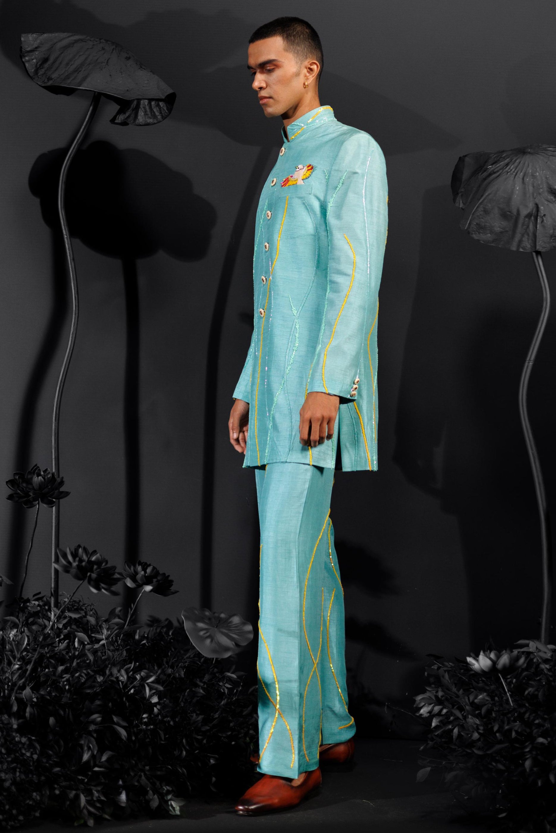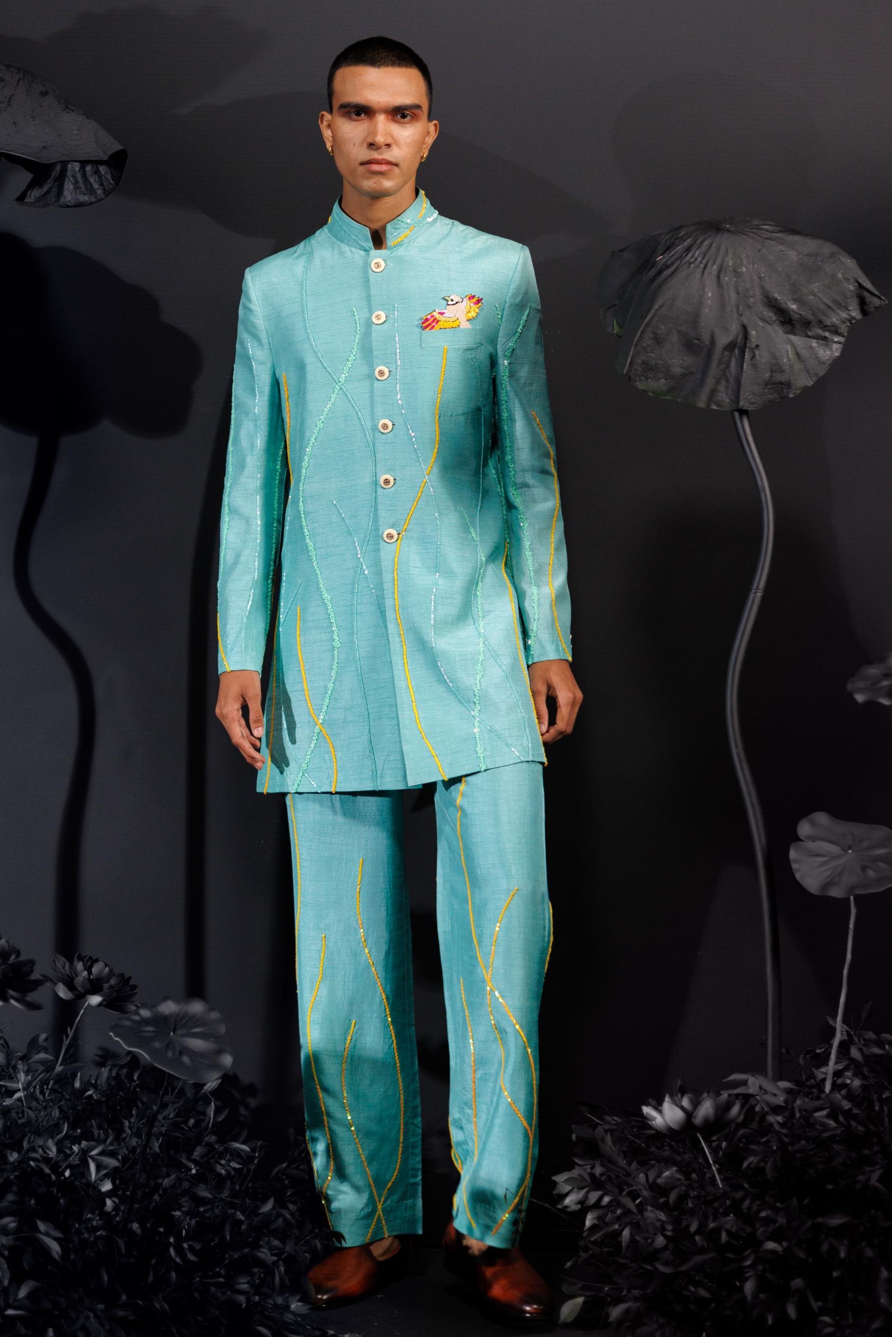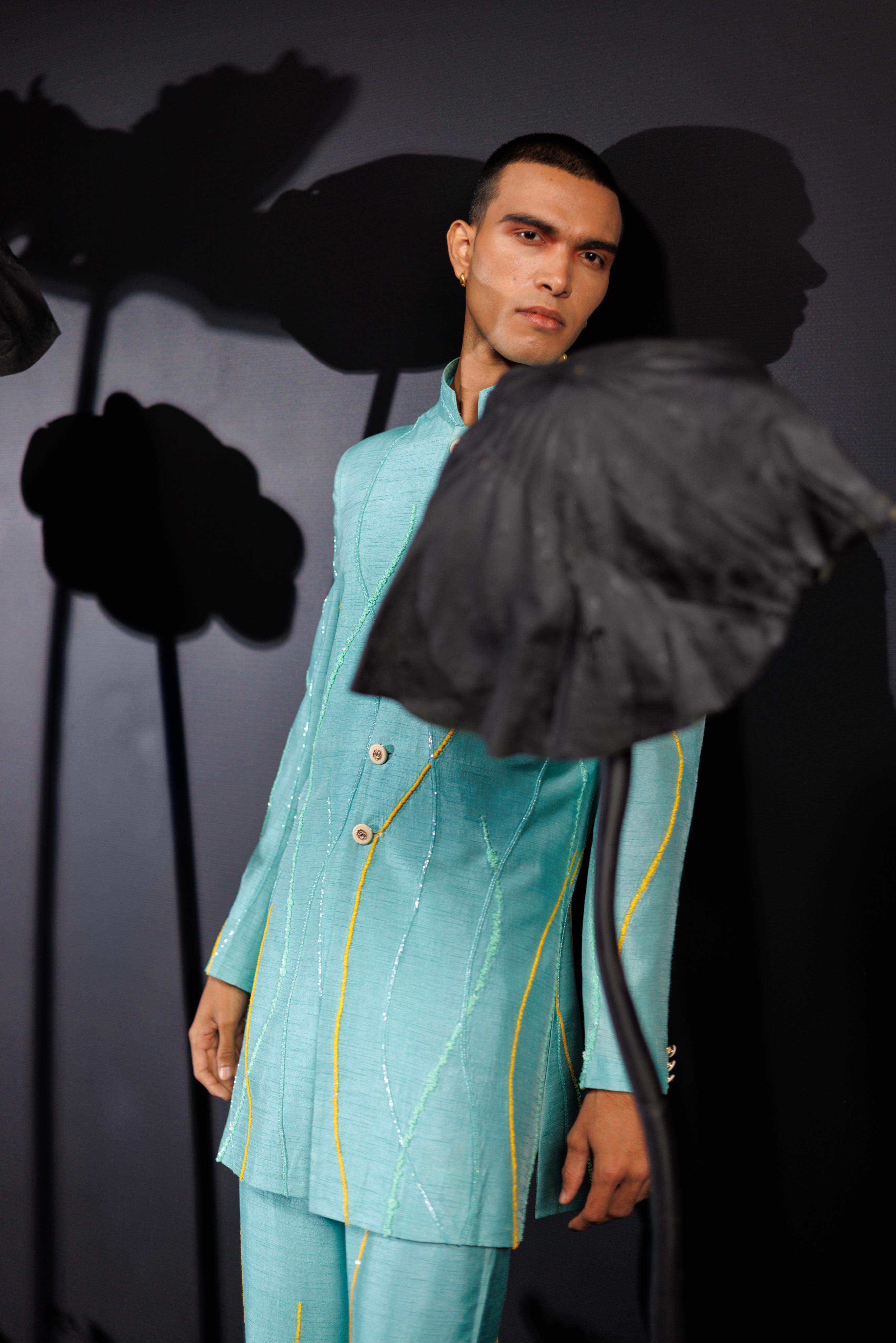 The Island Breeze Indo Western ensemble from Nautanky is a vibrant turquoise suit designed for lively, colorful celebrations. Featuring full sleeves, 3D sequined lines, and tropical bird motifs, it embodies modern flair and joyful elegance. The bold hues and playful patterns make it the perfect choice for festive events that embrace vibrancy, ensuring you stand out with style and confidence.