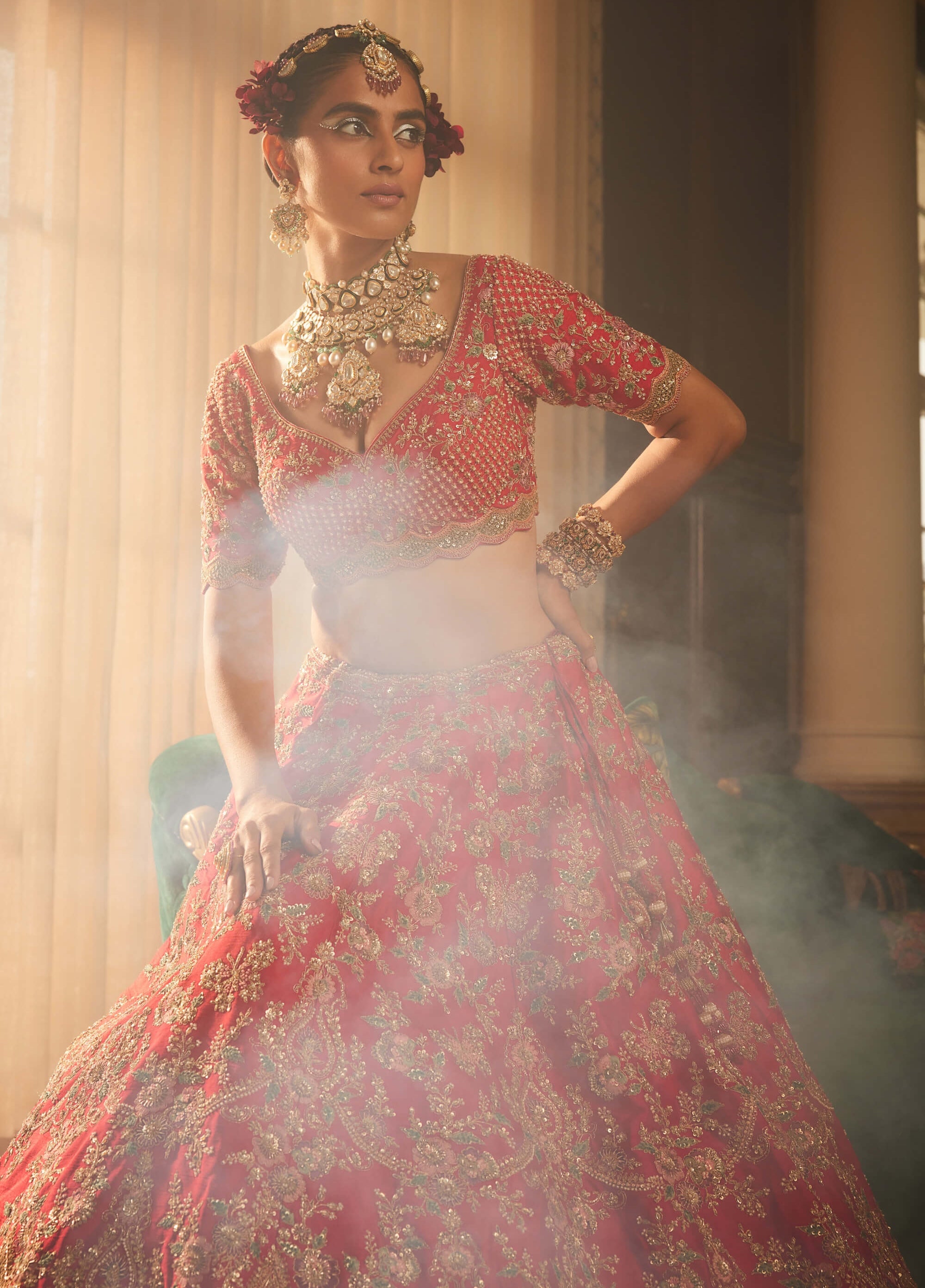 Introducing the isra lehenga, an exquisite masterpiece in vibrant red raw silk that exemplifies timeless elegance and opulence. This stunning lehenga features intricate zardosi and thread hand embroidery meticulously crafted across its entire surface, creating a luxurious and detailed design.