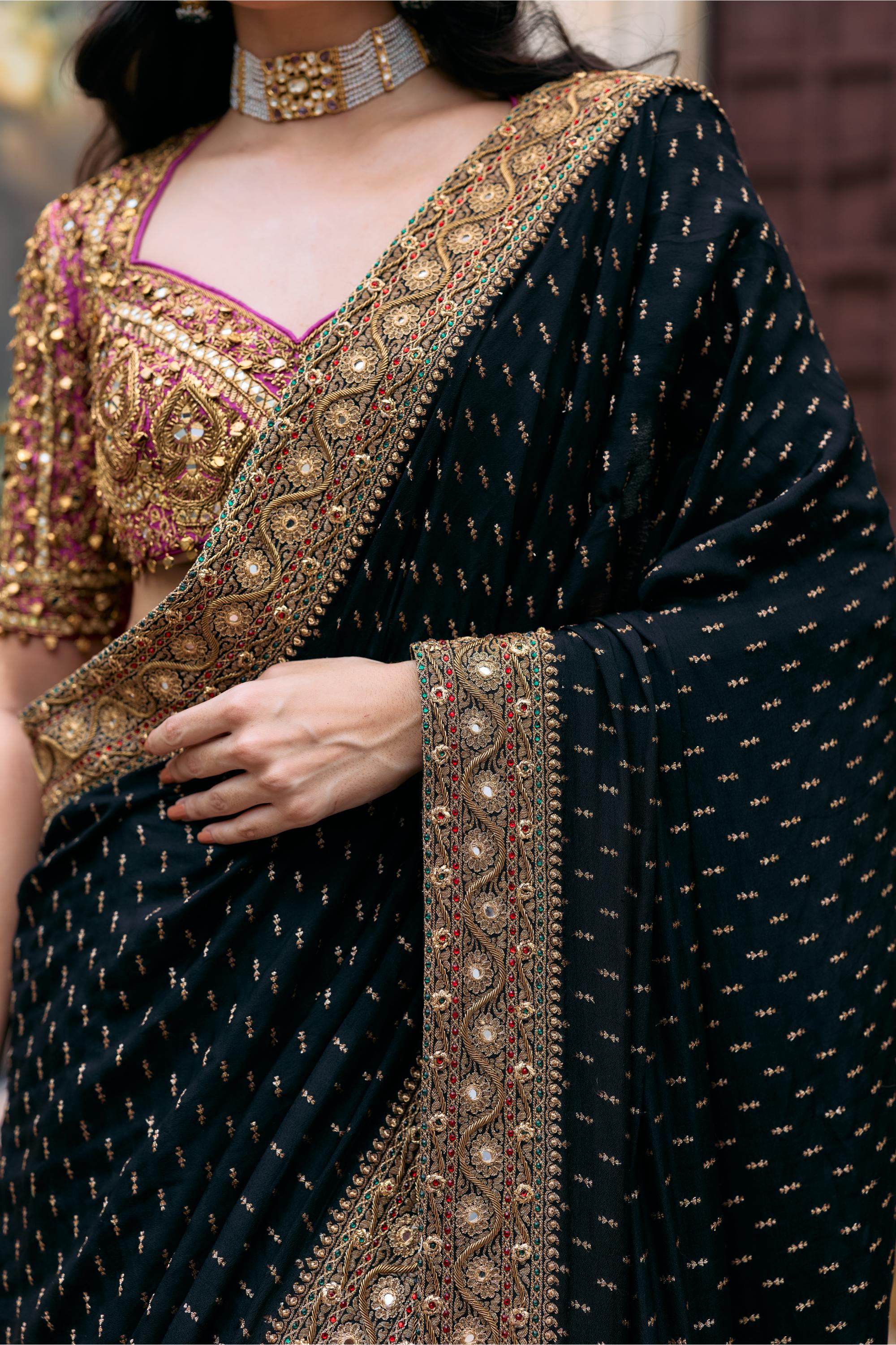 The Black Jadau Chandini Saree Set by Itrh is a striking ensemble that redefines traditional wedding attire with bold elegance. Designed for wedding ceremonies this saree set embraces the timeless sophistication of black while showcasing intricate craftsmanship and jadau finesse. Itrh’s design philosophy is reflected in every detail from the refined drape to the meticulous embellishments. The saree set exudes a contemporary charm while remaining deeply rooted in Indian tradition. Its bold hue makes it ideal for evening wedding ceremonies where it captures attention and creates a statement of grandeur. The Chandini Saree Set is versatile in styling—it pairs beautifully with silver or pearl jewelry for a sophisticated look or with bold gemstone accessories for a dramatic finish. The saree set flows gracefully ensuring both comfort and elegance for long ceremonies. This saree set is perfect for wedding guests or family members seeking an unconventional yet regal option. It represents a fusion of heritage and jadau innovation ensuring that the wearer stands out without compromising on cultural essence. Itrh’s Black Jadau Chandini Saree Set is more than attire; it is a powerful expression of individuality luxury and timeless fashion. With its striking palette and impeccable craftsmanship this saree set becomes a true celebration of wedding elegance.
