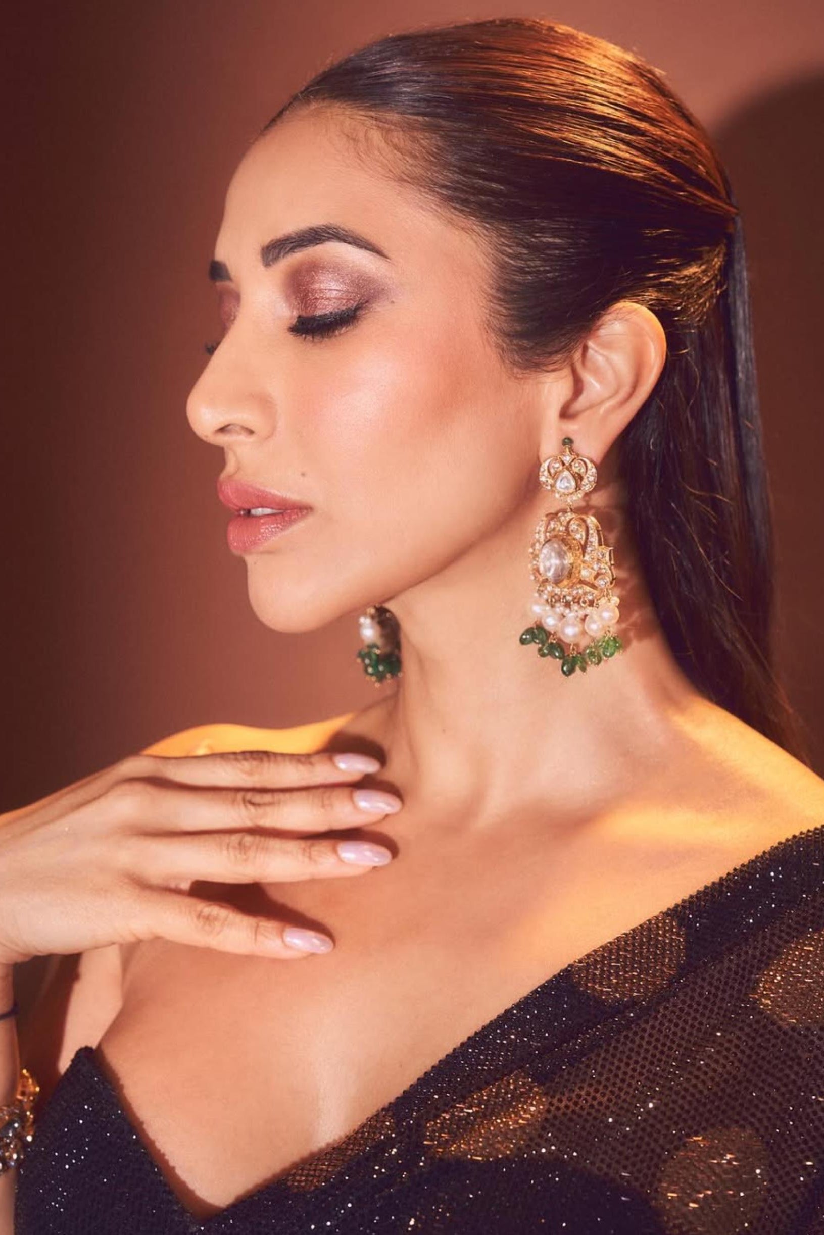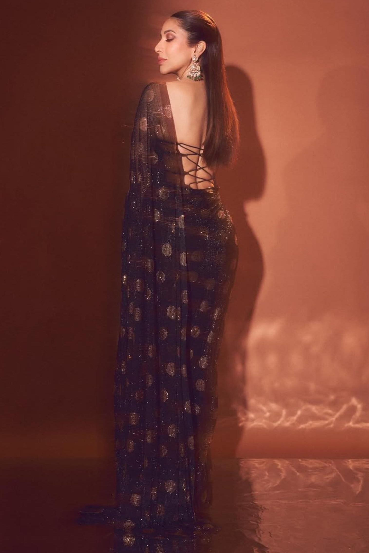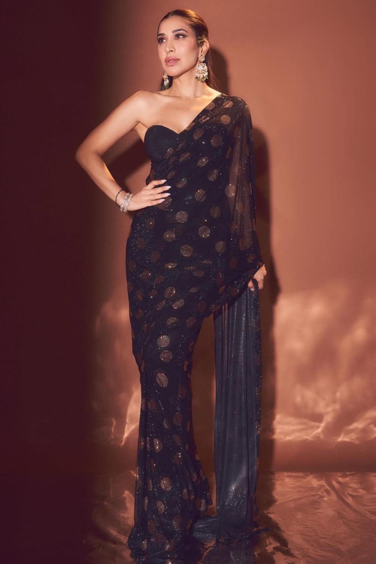 The black polka sequin ruffle saree is crafted for statement-making occasions. Layered ruffles give this ruffle saree dramatic volume while maintaining elegance. Sequin detailing adds shimmer, enhancing the festive appeal of the ruffle saree. Paired with a sculpted blouse, this ruffle saree balances fluidity with structure. Ideal for receptions and cocktail weddings, this ruffle saree offers confidence, glamour, and contemporary style. Designed for women who love bold silhouettes, this ruffle saree ensures unforgettable impact.