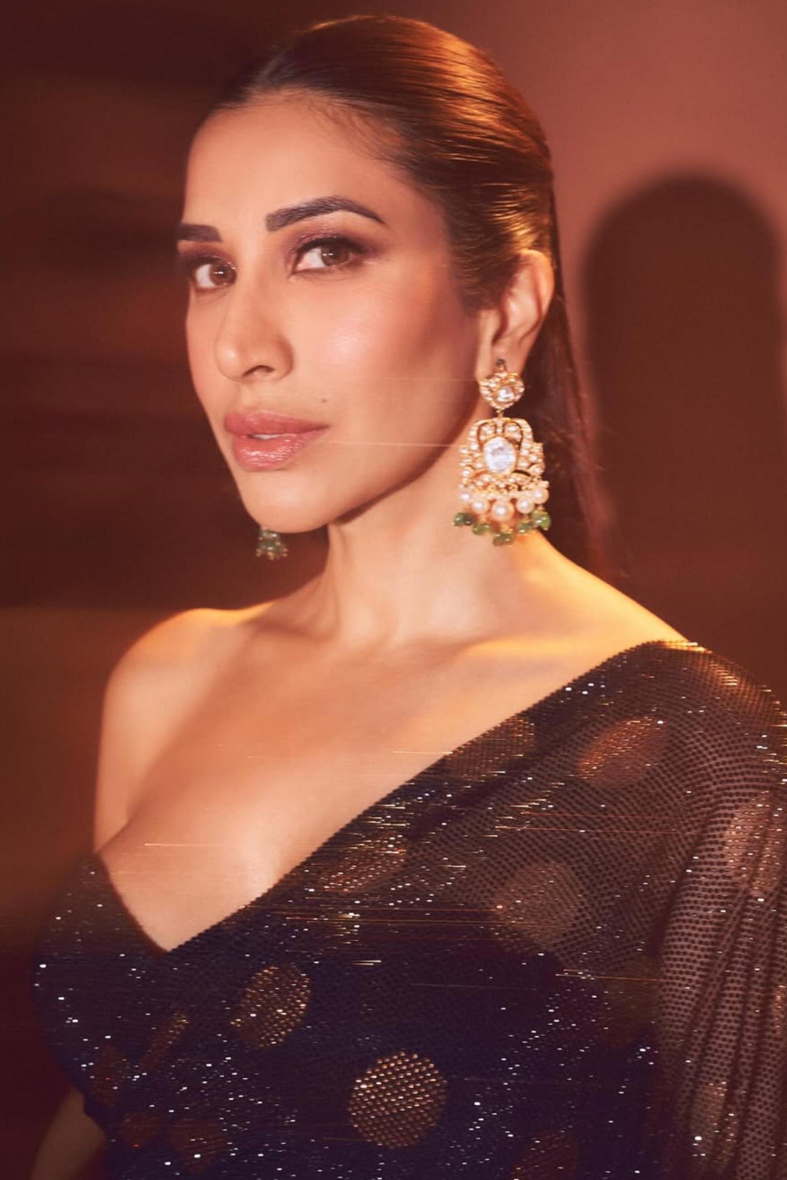 Designed for bold, glamorous evenings, this black polka sequin ruffle saree is perfect for cocktail receptions and sangeet nights. The sculpted strapless blouse adds a modern edge, while cascading ruffles create movement and drama. A striking choice for fashion-forward wedding celebrations.