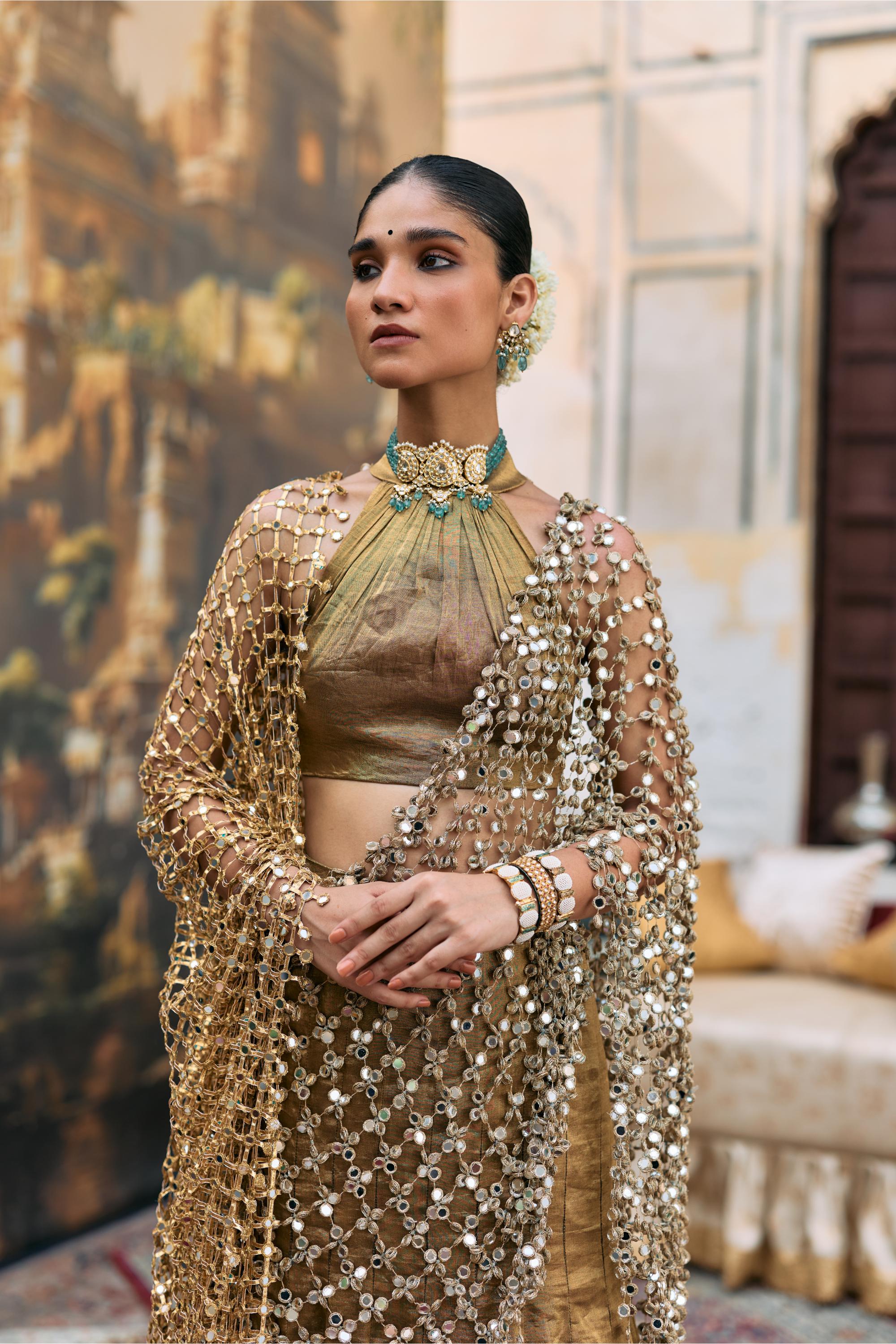 Fabric: Tissue, crepe tissue, crepe mirror jaal, mirror gota jaal