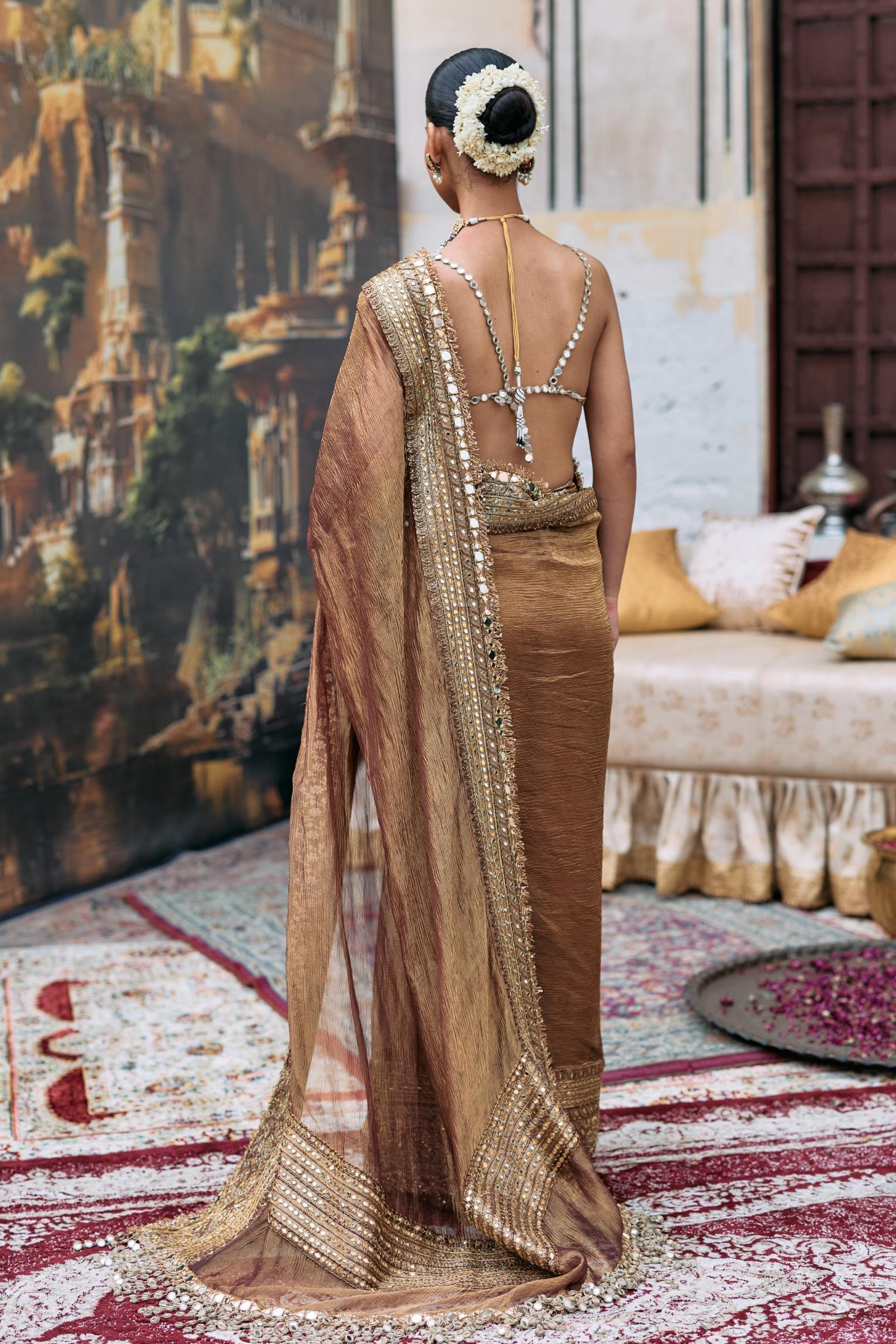 The Brown Manjusha Crushed Tissue Saree Set is curated for refined wedding receptions and sophisticated festive evenings. Its earthy brown tone enhances the antique embroidery, offering understated luxury. Paired with a scoop-shape bra top detailed with mirror lace accents, this crushed tissue saree balances bold tailoring with fluid elegance. Perfect for cocktail celebrations and evening ceremonies, this crushed tissue saree delivers timeless texture with a contemporary silhouette.