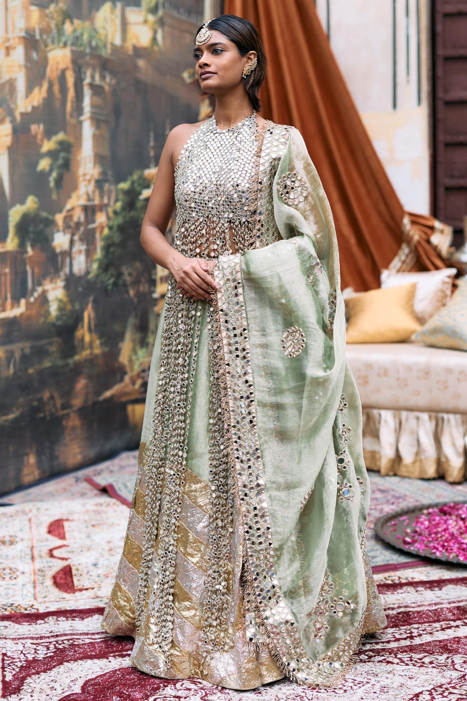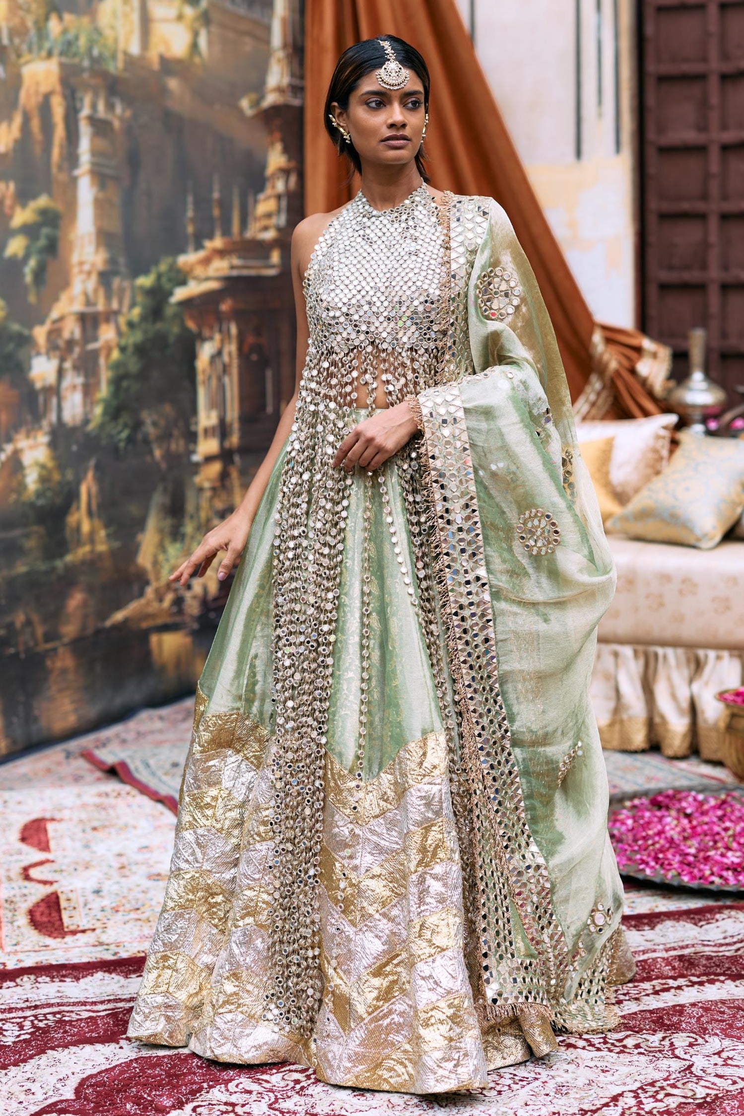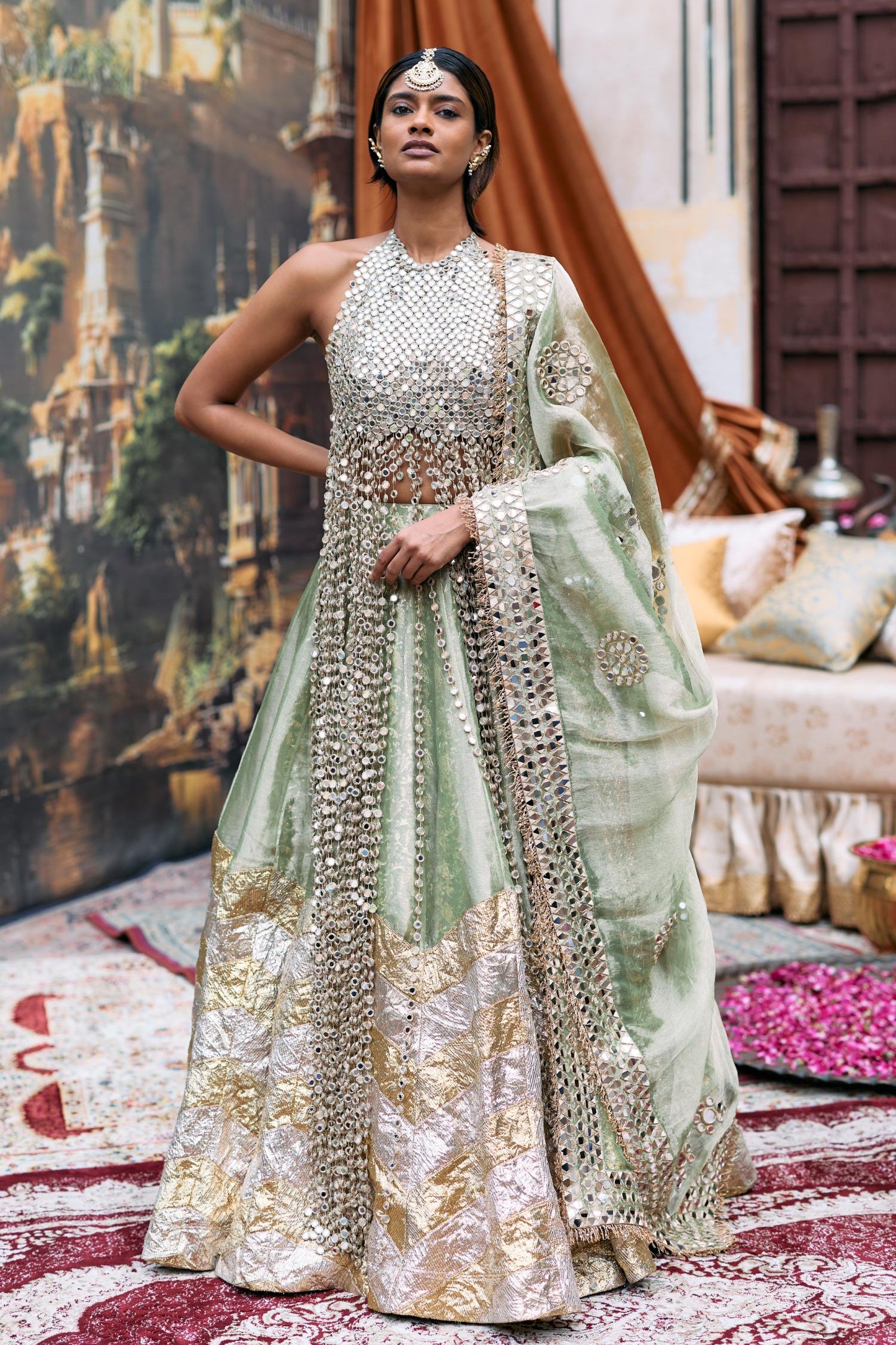 A poetic ode to Indian grandeur, the Green Kanak Lehenga Set by Itrh fuses regal artistry with timeless charm. Crafted in rich green tones, this ensemble shines with intricate zardozi embroidery and delicate mirror accents. Perfect for wedding festivities or sangeet nights, this piece balances tradition and modern finesse, making you the epitome of grace. Pair it with heritage jewelry and a statement potli to complete a truly royal look that embodies celebration and confidence.