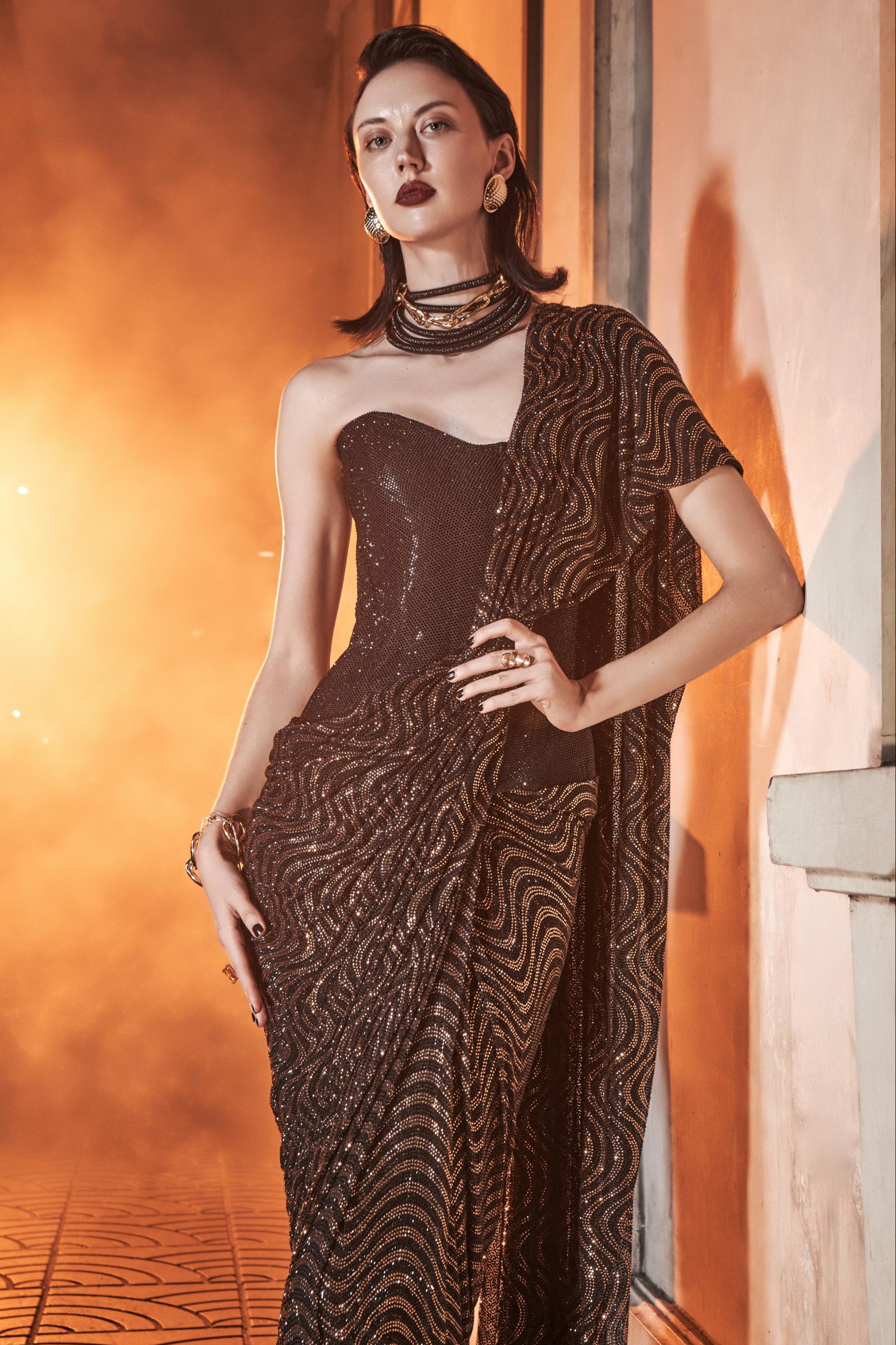 The Marquise Saree Set features a sculptural peplum corset and wavy black-gold saree.Perfect for stylish receptions and high-fashion nights.