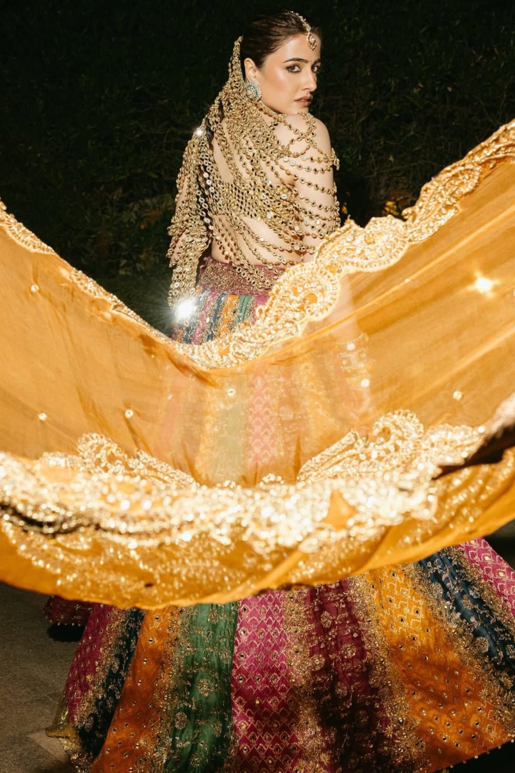 The multicolor kalidar lehenga set featuring a harness and dupatta is crafted for modern wedding festivities. Designed with a flowing kalidar silhouette, this lehenga set brings drama and elegance to festive dressing. The harness detail adds a contemporary touch, elevating the visual appeal of the lehenga set. Rich colours enhance the vibrancy of the lehenga set, making it ideal for sangeet and mehendi celebrations. Comfortable yet impactful, this lehenga set allows easy movement while maintaining structure. Perfect for women who enjoy bold festive fashion, this lehenga set blends tradition with modern design seamlessly.
