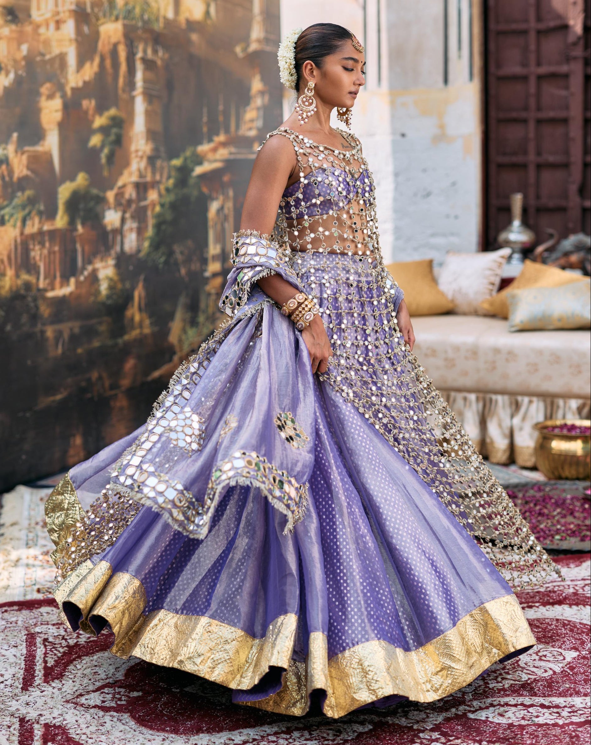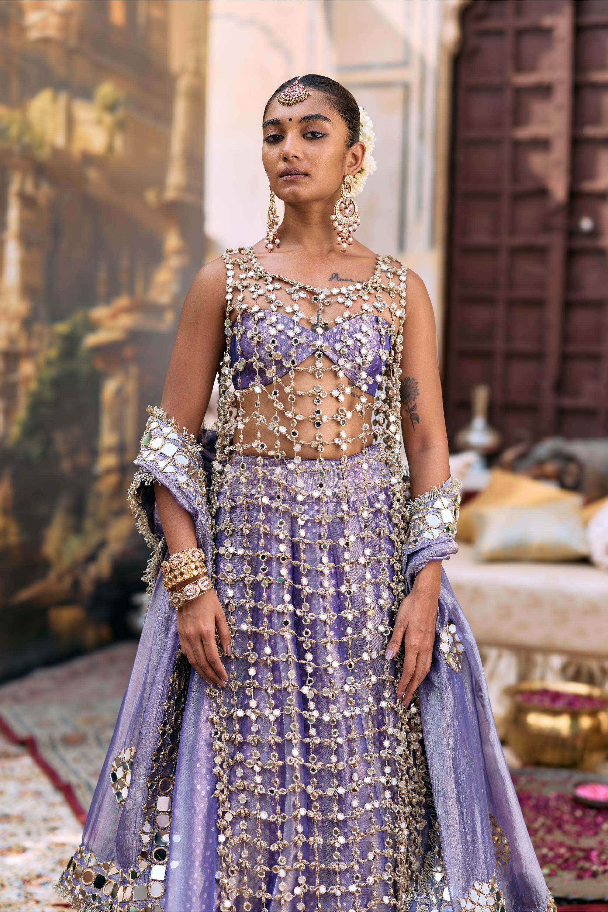 Itrh’s Purple Prabha Lehenga Set with Dupatta embodies grace and grandeur. Adorned with reflective embellishments, this ensemble features a delicate dupatta that adds traditional elegance to its contemporary appeal. Ideal for wedding ceremonies or festive occasions, it merges royal allure with comfort. The detailed handwork makes this piece a refined choice for brides seeking an opulent yet modern aesthetic.