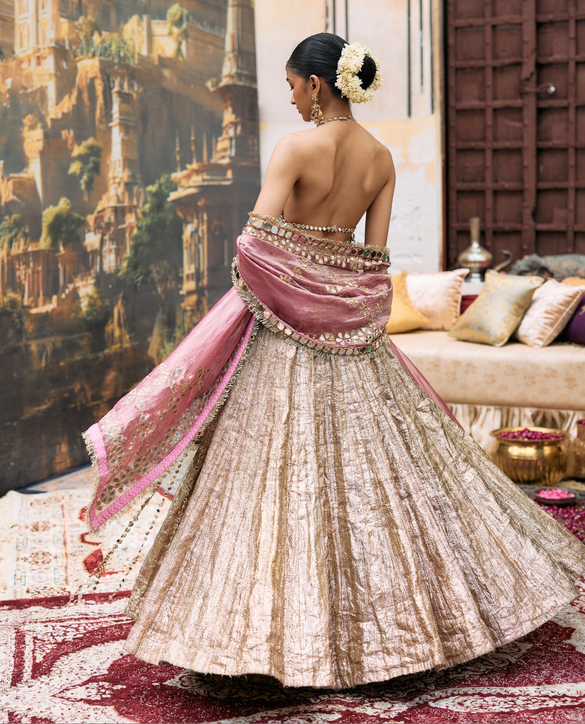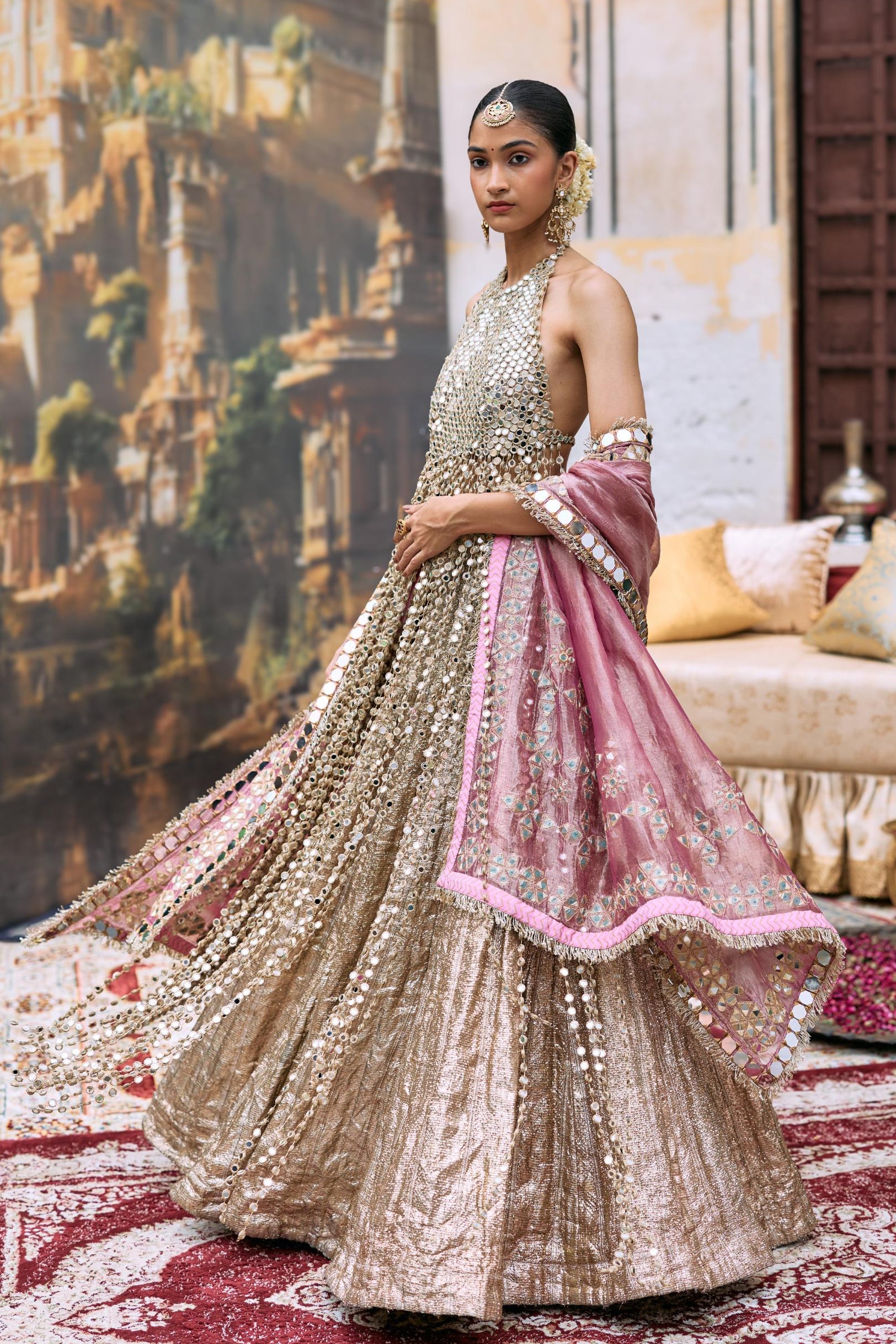 The Silver Mridula Lehenga Set by Itrh is an ethereal pick for receptions or sangeet evenings. The shimmering silver hue brings celestial grace, while the intricate embellishments create a radiant glow under soft lighting. This look blends modern metallic tones with traditional Indian artistry, making it perfect for those who prefer subtle grandeur. Style it with diamond jewelry or minimal accessories for a refined, goddess-like appearance.
