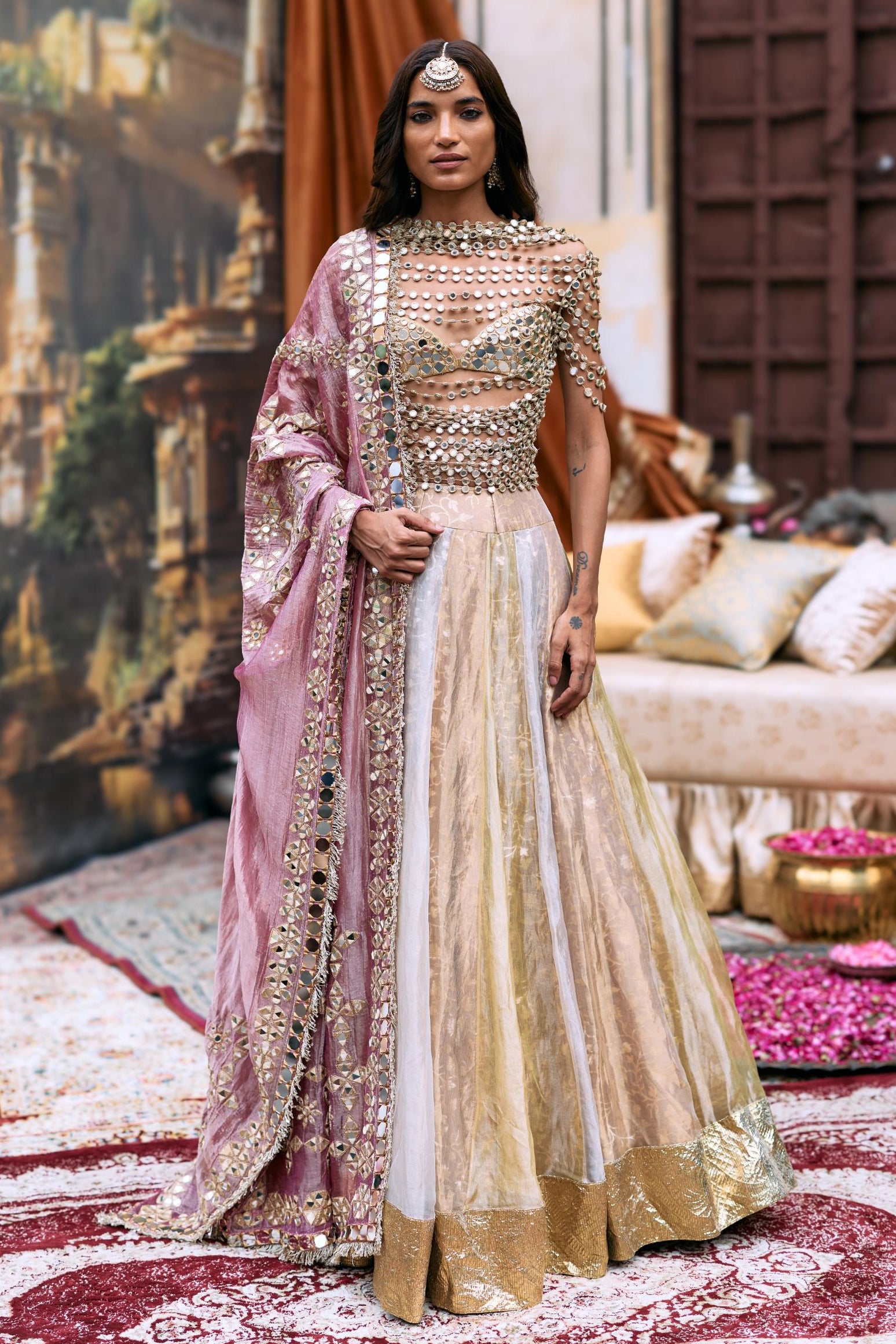 Components: 4 pieces (Lehenga, bralette, dupatta, mirror harness)