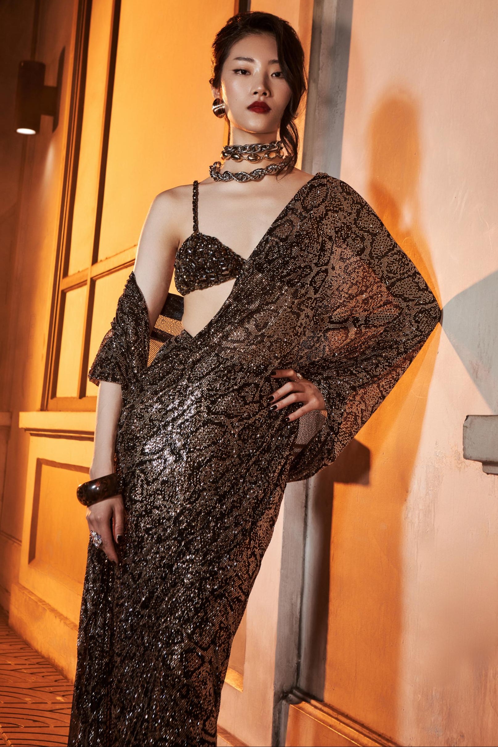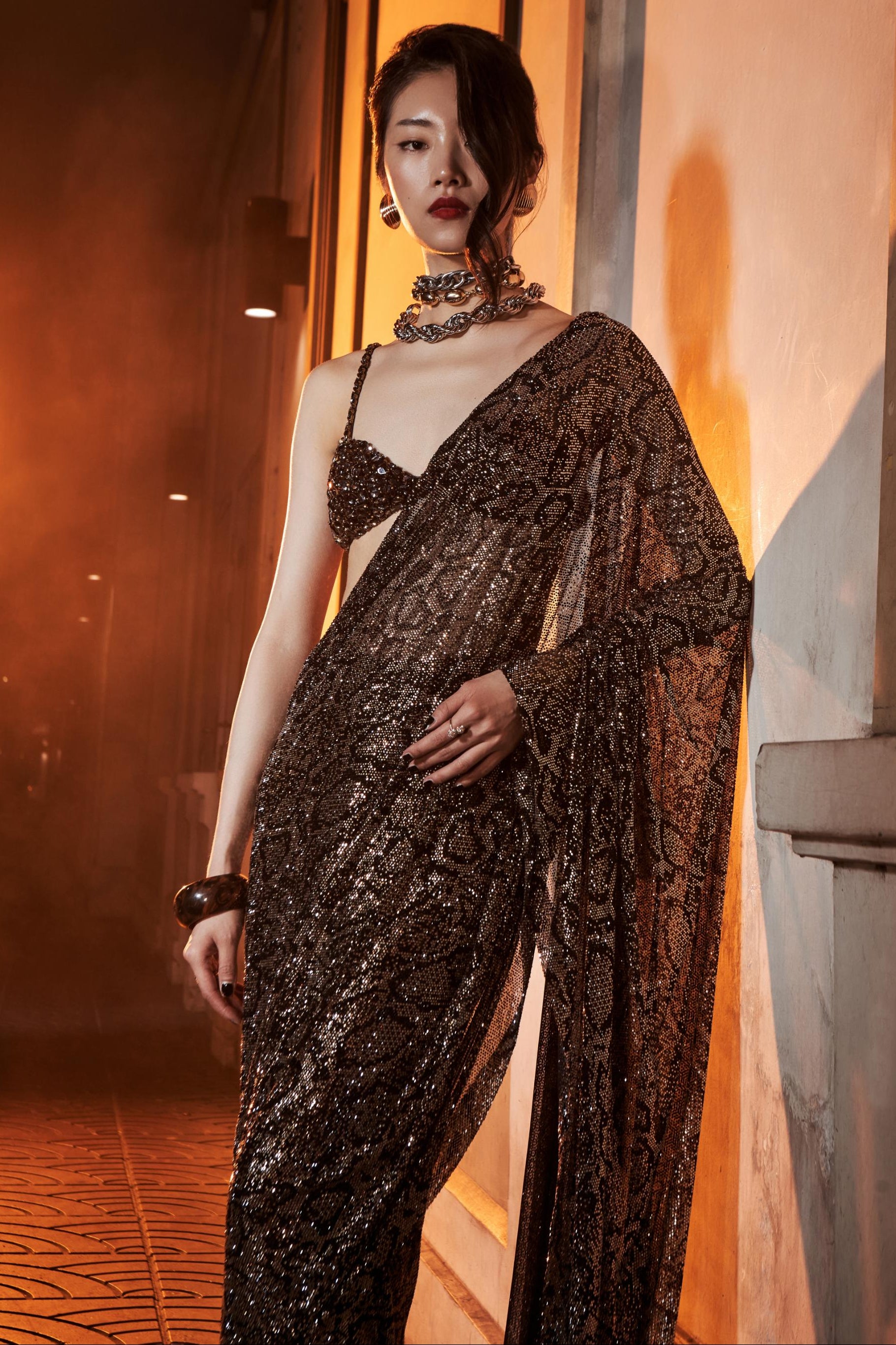 The Suki Saree Set is sleek and luminous, pairing a stone-embroidered blouse with a black-silver chevron saree.Ideal for cocktails and receptions.