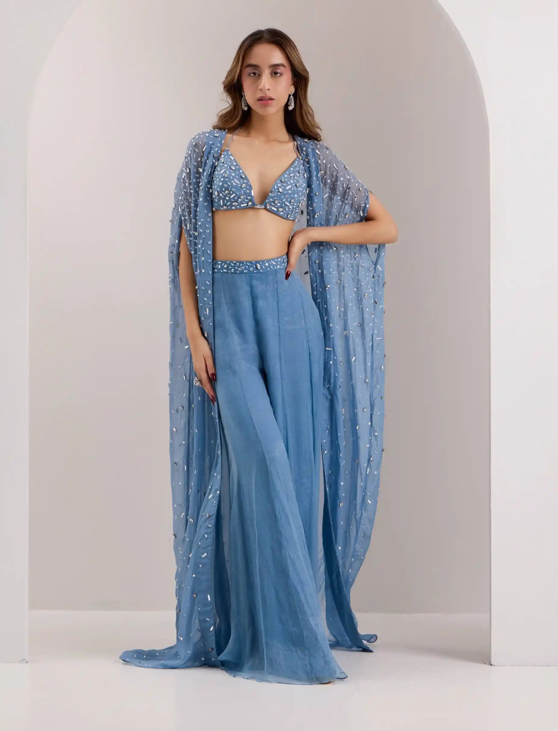 Introducing the ivelle bralette, floor-length cape, and palazzo set in an enchanting blue hue. This stunning ensemble features exquisite mix crystal embroidery that adds a touch of sparkle and sophistication. The bralette offers a chic and flattering fit, while the floor-length cape drapes elegantly, creating a captivating silhouette that enhances your style.