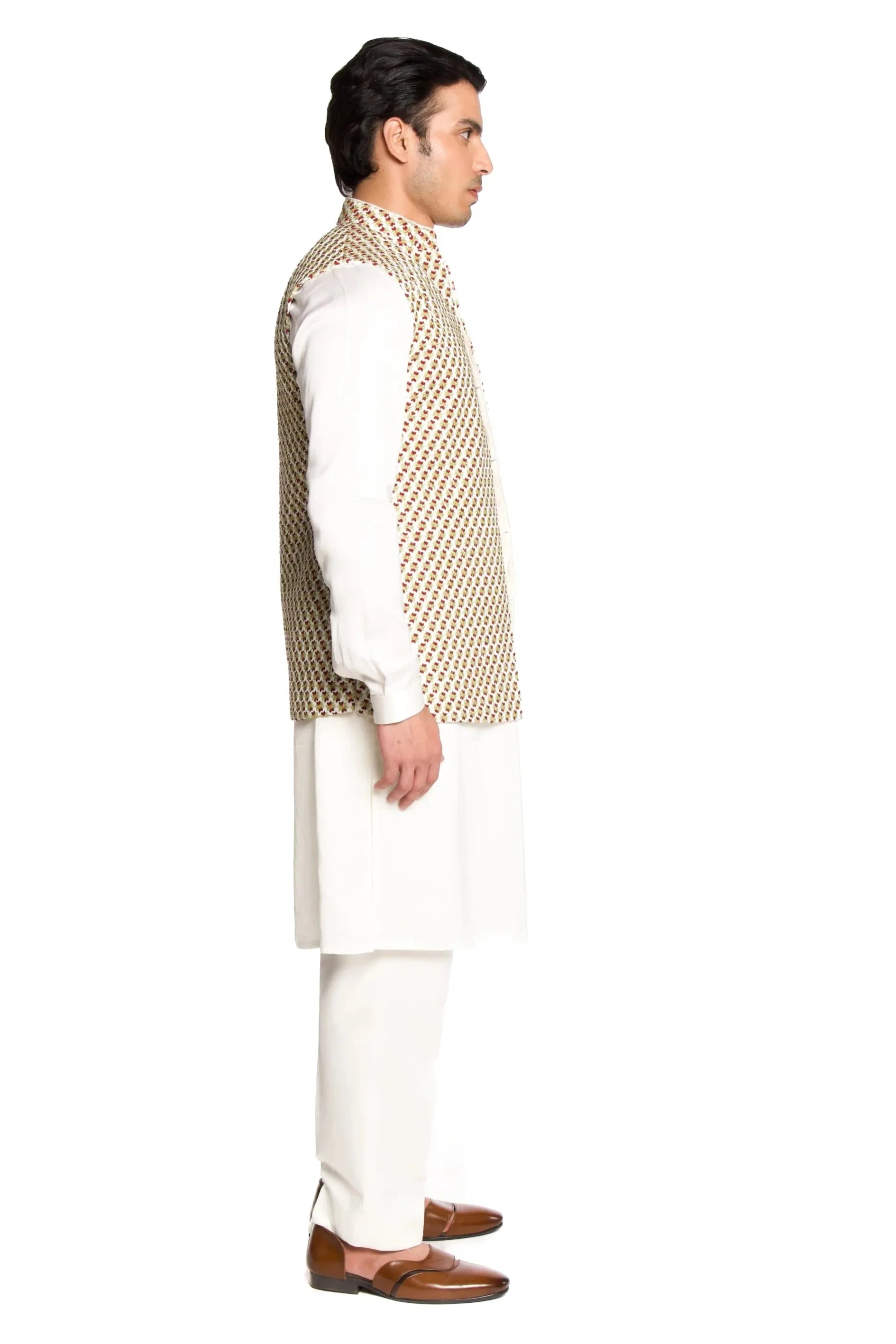 Embrace timeless elegance with the Ivory All Over Kashmiri Embroidered Bundi Set, a masterpiece that celebrates the intricate art of Kashmiri embroidery. This exquisite ivory bundi features all-over Kashmiri embroidery, with delicate floral and paisley motifs that create a stunning visual impact. The rich, traditional designs are meticulously embroidered, adding depth and texture to the luxurious ivory fabric. Perfect for weddings, festivals, or formal celebrations, this bundi set exudes sophistication and charm.