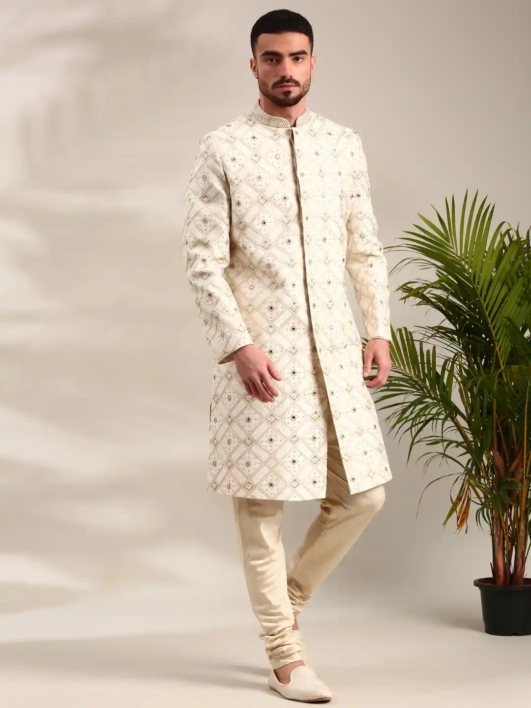 The ivory chanderi embroidered sherwani set is an exquisite choice for cultural events or performances. Its elegant embroidery and soft fabric beautifully highlight your style while paying homage to tradition. This ensemble not only allows you to showcase your heritage but also keeps you comfortable throughout the event. Pair it with traditional footwear and minimal accessories to complete your look, ensuring you make a memorable impression as you celebrate your culture!