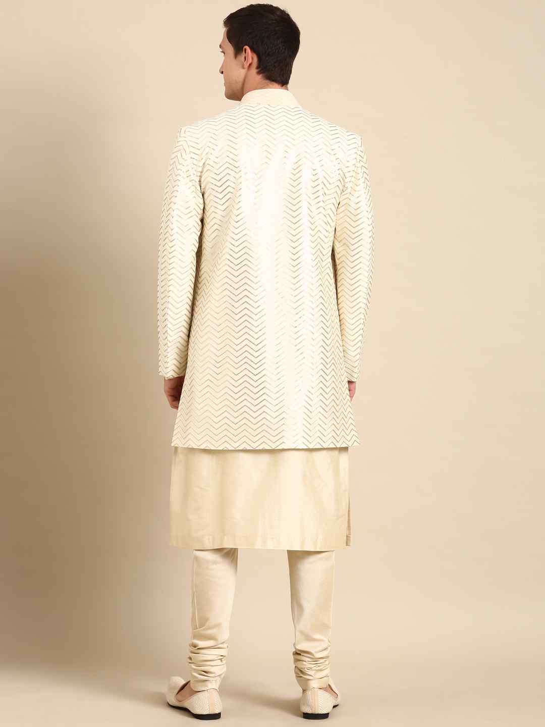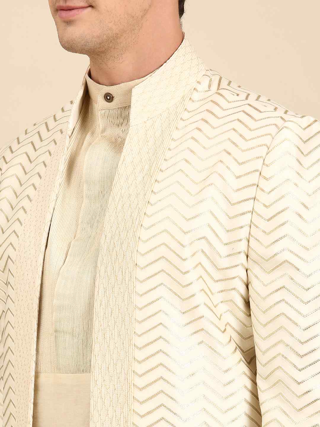 Discover understated elegance with our Ivory Chanderi Silk Long Open Jacket. Crafted from luxurious Chanderi silk, this jacket features a refined ivory hue that exudes sophistication and versatility. The long, open design adds a contemporary touch, making it perfect for layering over both formal and casual outfits. Ideal for enhancing your wardrobe with a touch of grace and modernity, this jacket effortlessly combines timeless craftsmanship with chic, minimalist style.Ivory chanderi silk long open jacket.