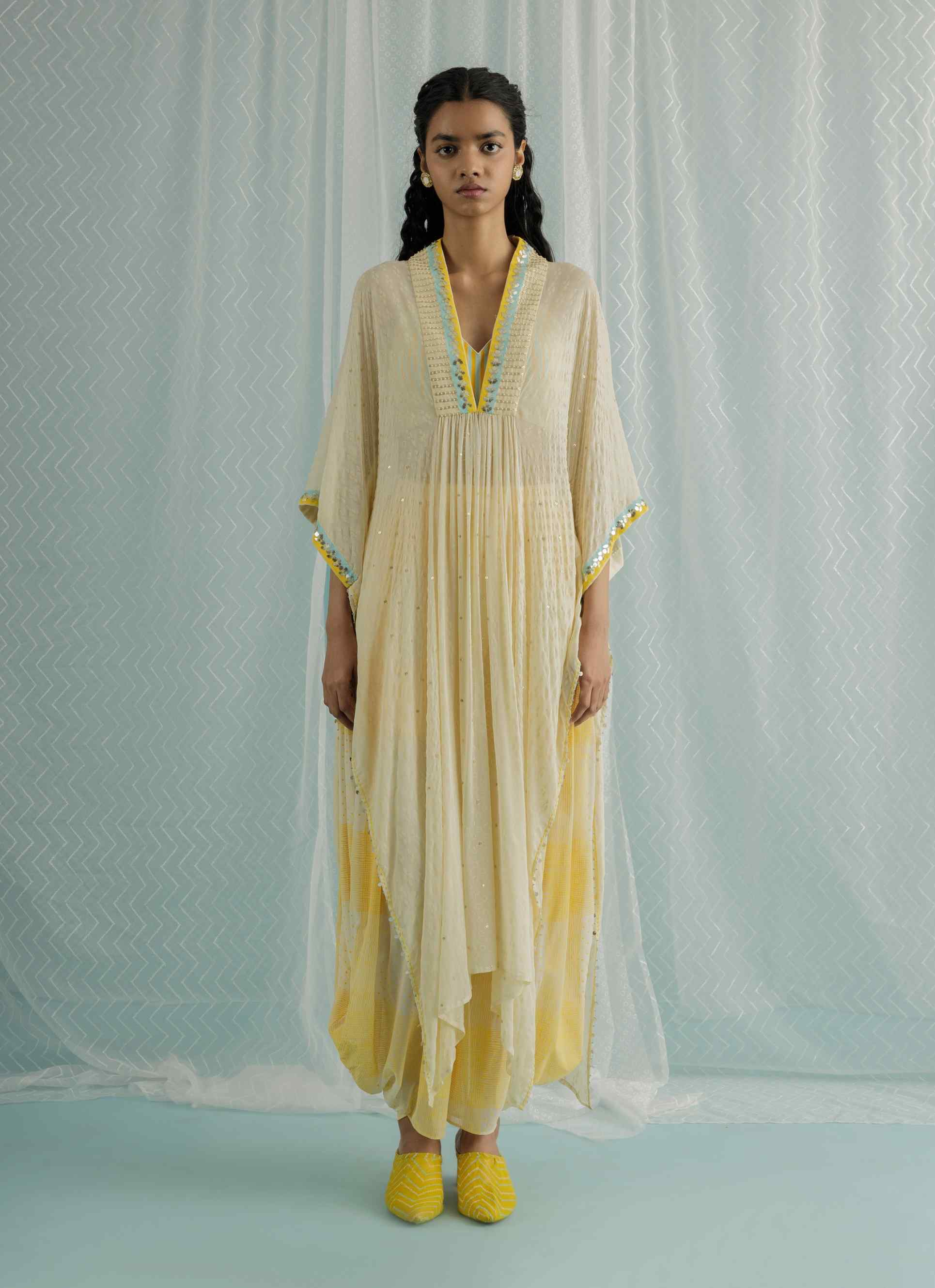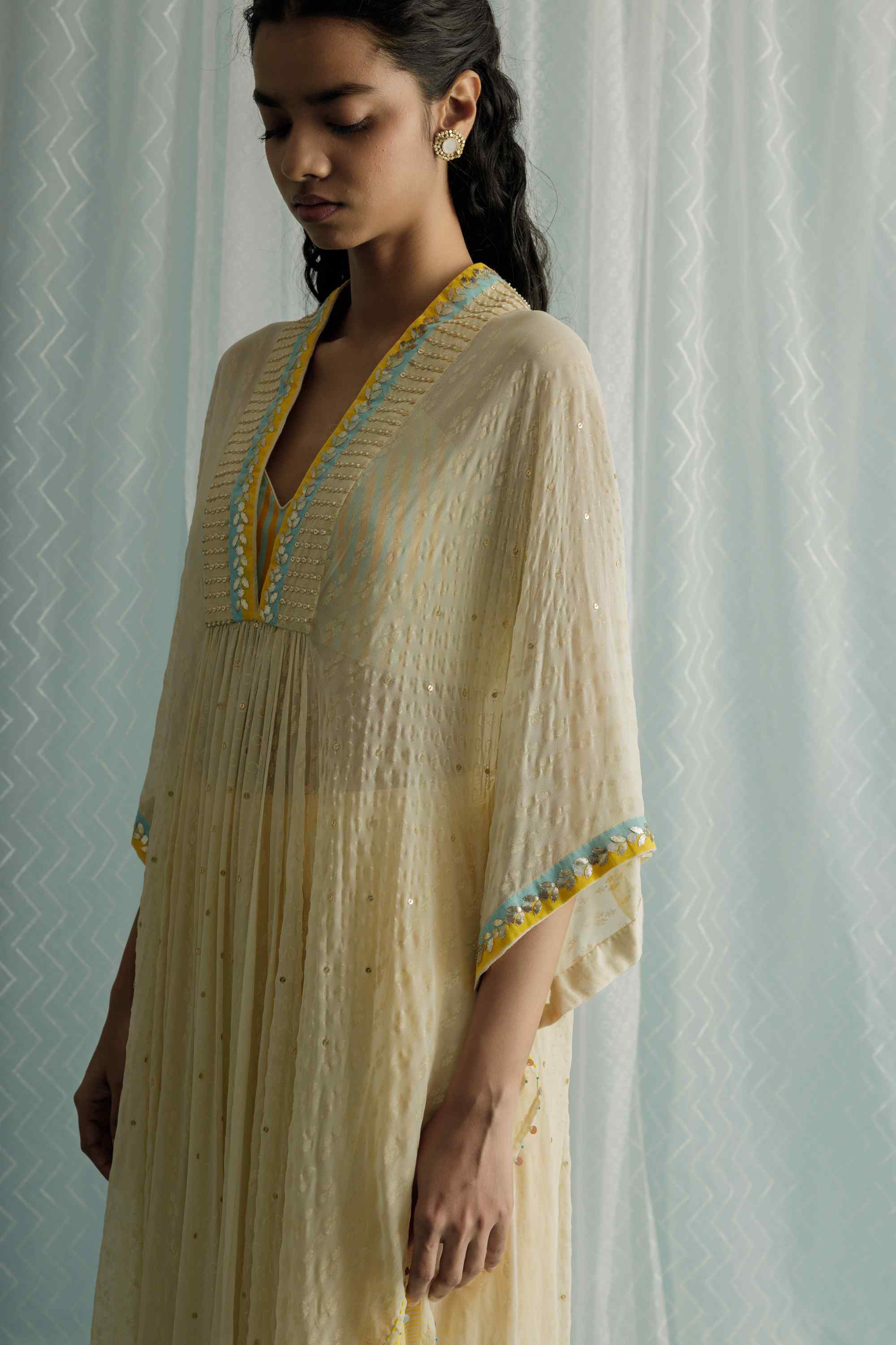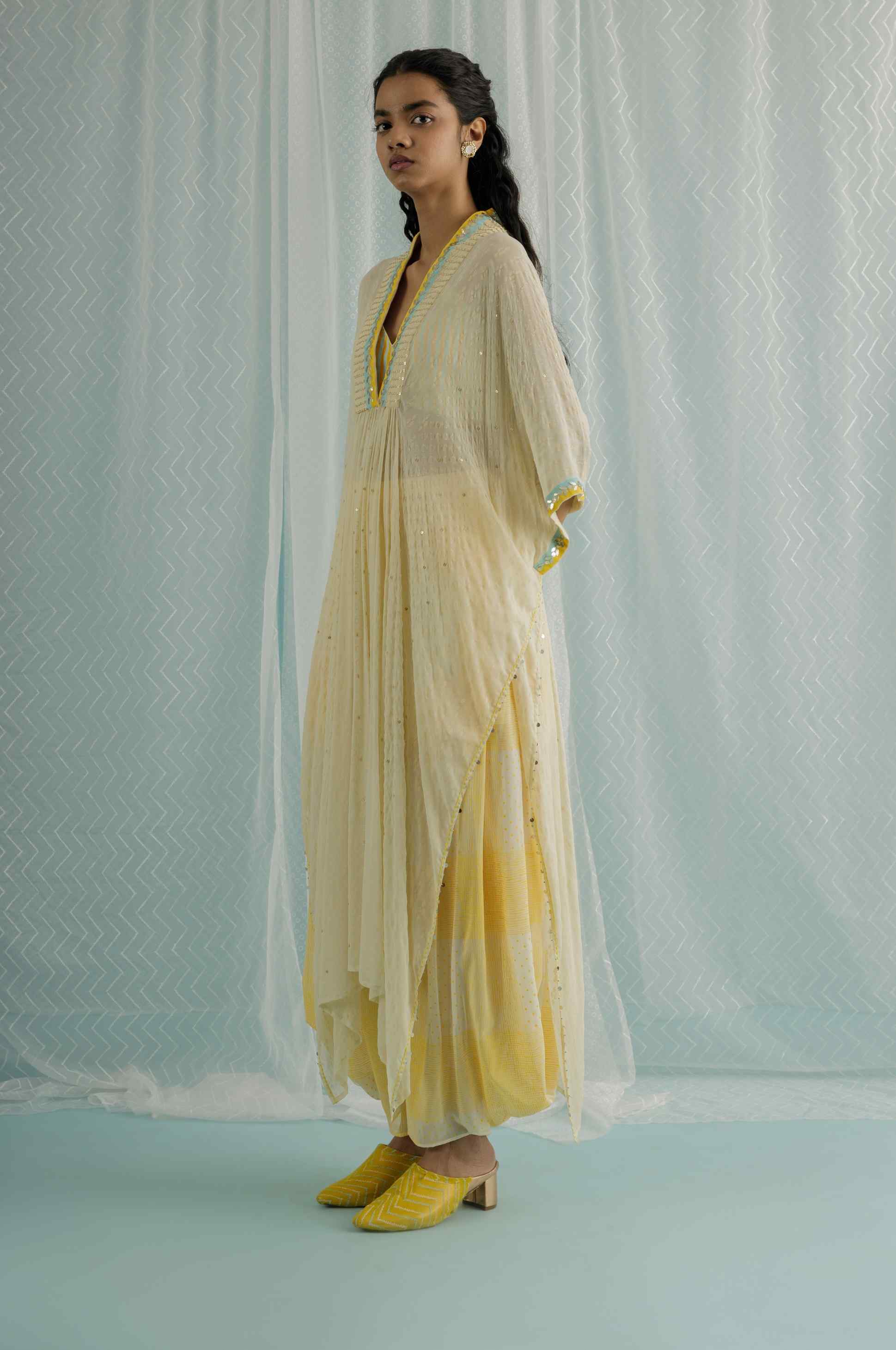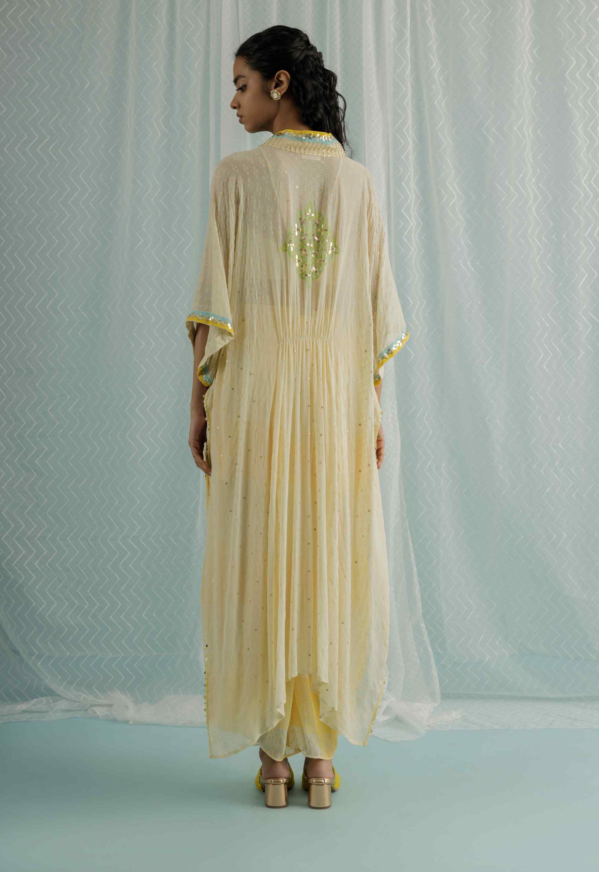 Experience effortless elegance with our ivory georgette kaftan, a masterful blend of style and comfort. This captivating kaftan features custom block printing in refreshing shades of ice blue and yellow, meticulously enhanced with hand embroidery that includes gota, sequin, and bead work. The intricate detailing adds a sophisticated touch to its flowing silhouette. Complemented by a chic stripe printed blouse and stylish printed low crotch trousers, this ensemble offers a contemporary and unique look. Ideal for special occasions or upscale events, this kaftan seamlessly combines traditional craftsmanship with modern design.