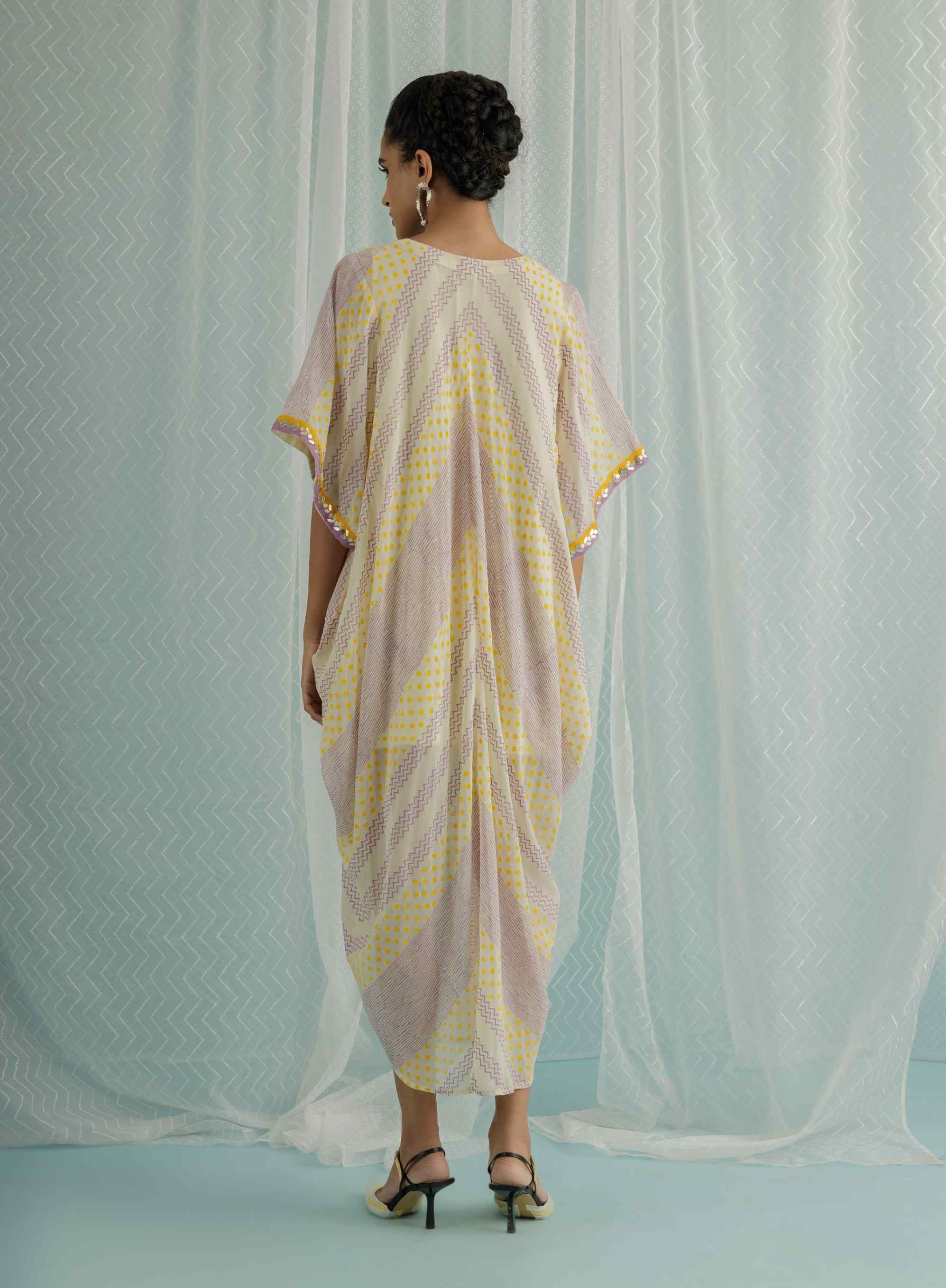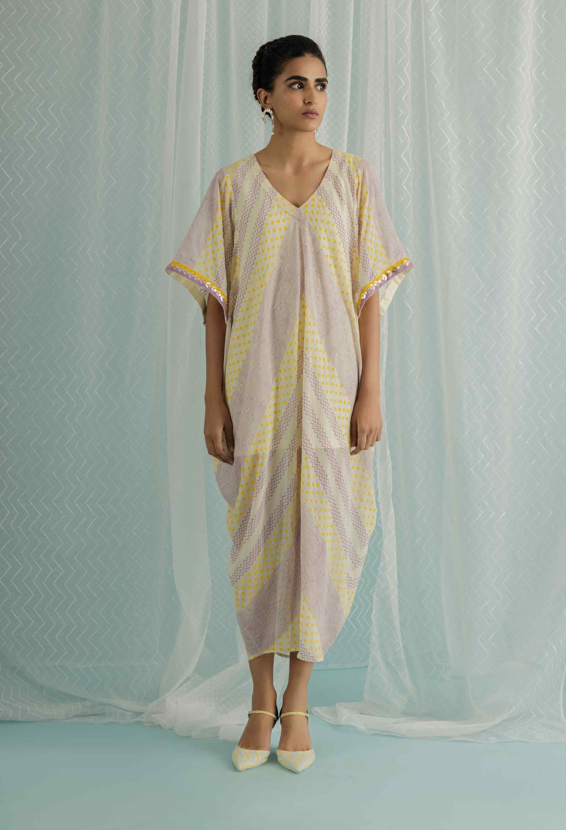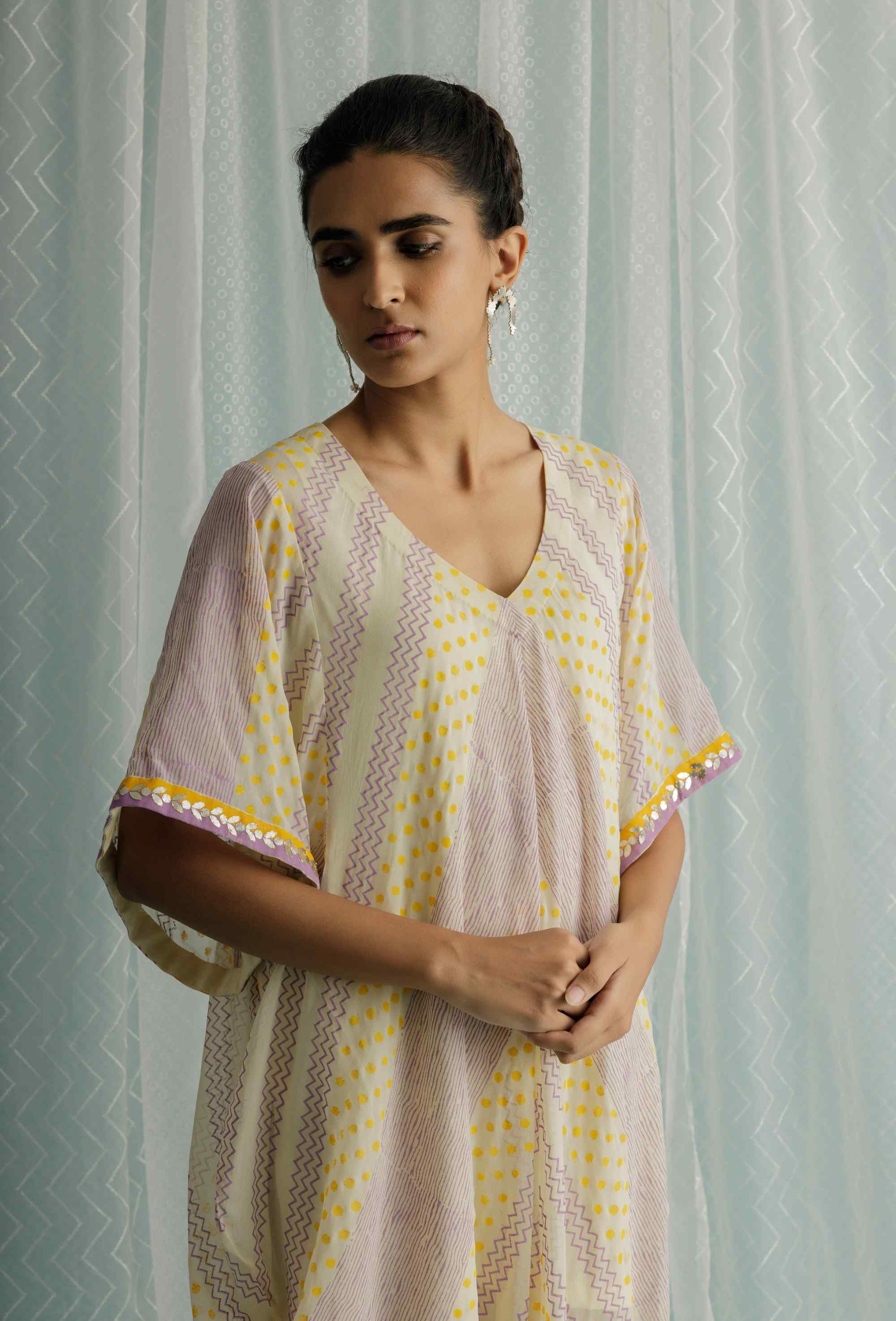 Discover the timeless beauty of our ivory georgette dress, a stunning piece adorned with custom block printing in delicate shades of lilac and yellow. This exquisite dress features intricate gota embroidery on the sleeve hems, adding a touch of traditional elegance to its modern design. The dress includes a separate inner lining, ensuring a flattering fit and maintaining its graceful flow. Perfect for special occasions or a refined evening look, this dress combines comfort with sophisticated style.