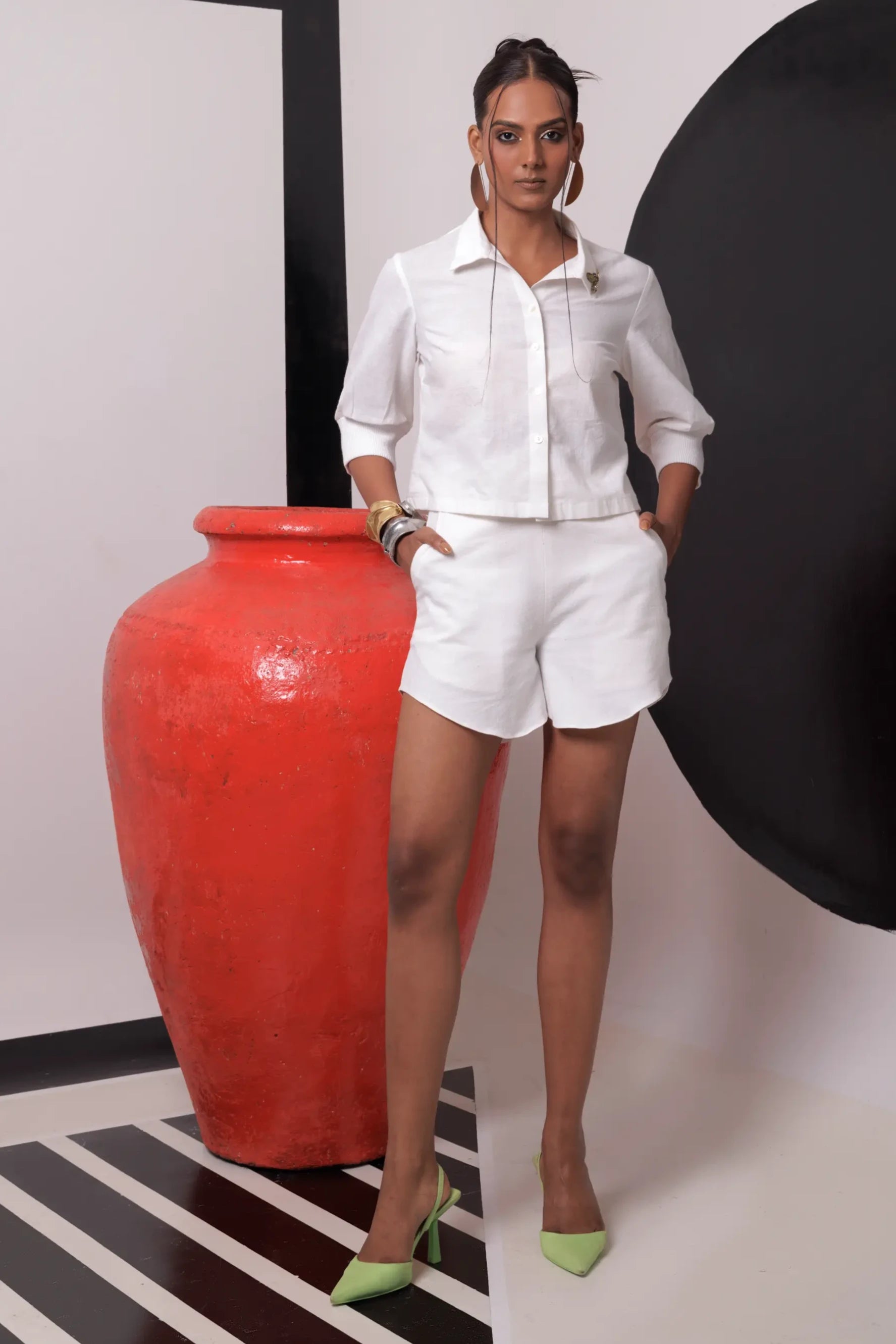 Embrace the warm weather with our Ivory Crop Shirt paired with Shorts, a stylish ensemble that embodies casual elegance. The lightweight, breathable fabric of the crop shirt ensures comfort while adding a trendy flair to your outfit. Its versatile ivory hue complements a wide range of colors and styles, making it a staple piece for your summer wardrobe.