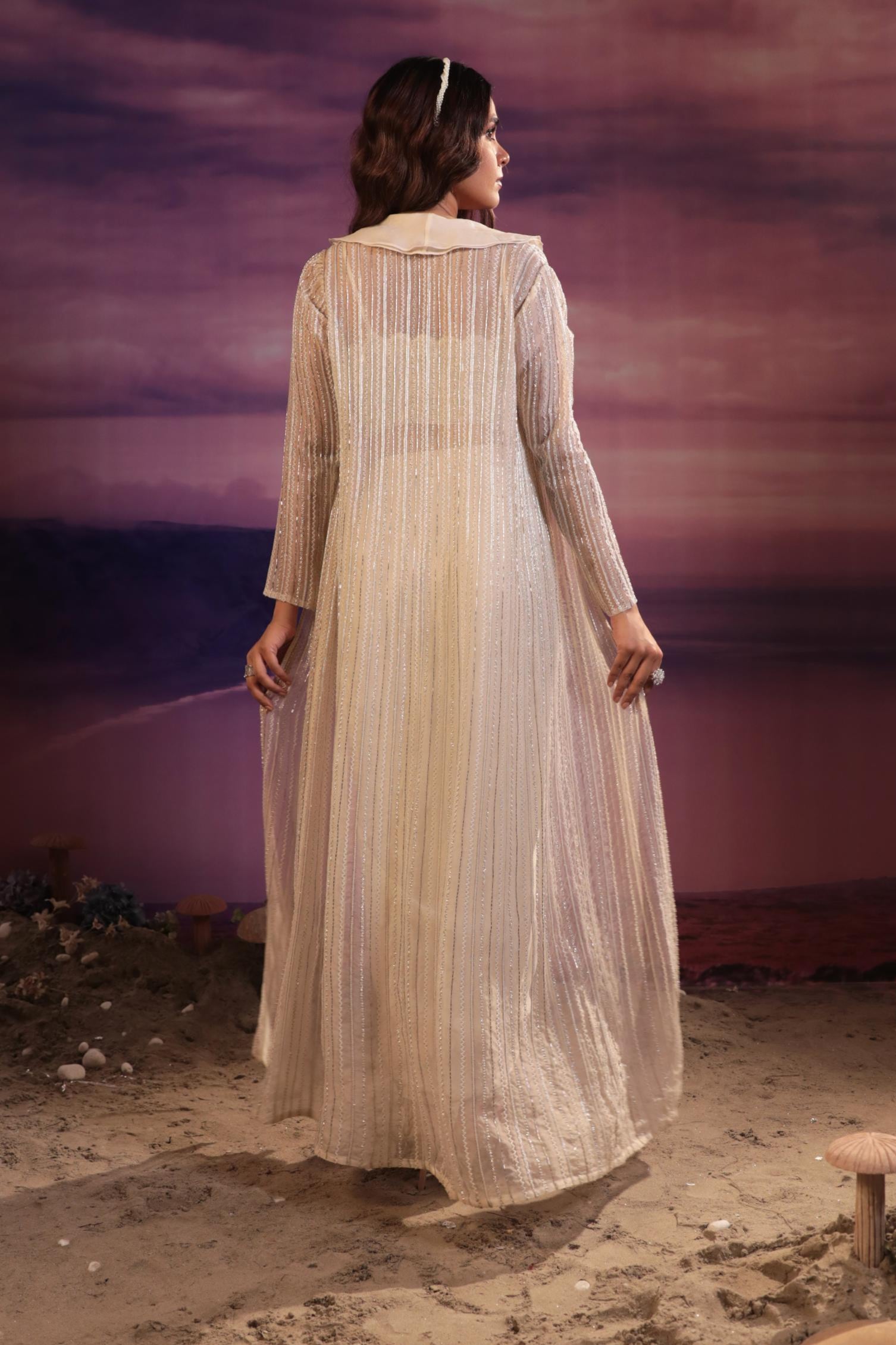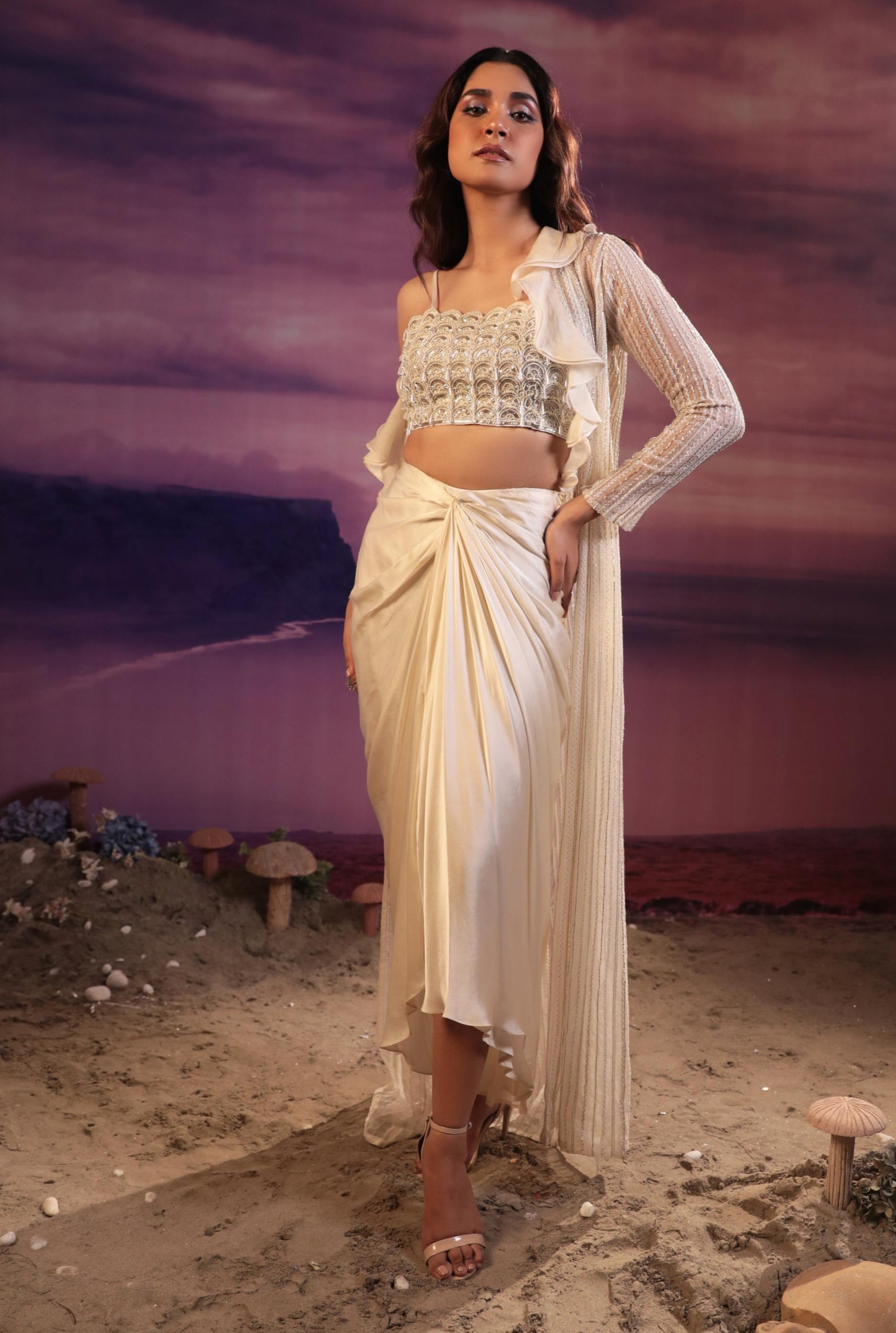 Make a statement with this elegant ensemble featuring a jacket with vertical lines, intricate scalloped embroidery, and crystal drops that add a touch of shimmer. Paired with a stylish knot skirt, this look exudes sophistication and modern charm. Perfect for weddings, receptions, or evening celebrations.
