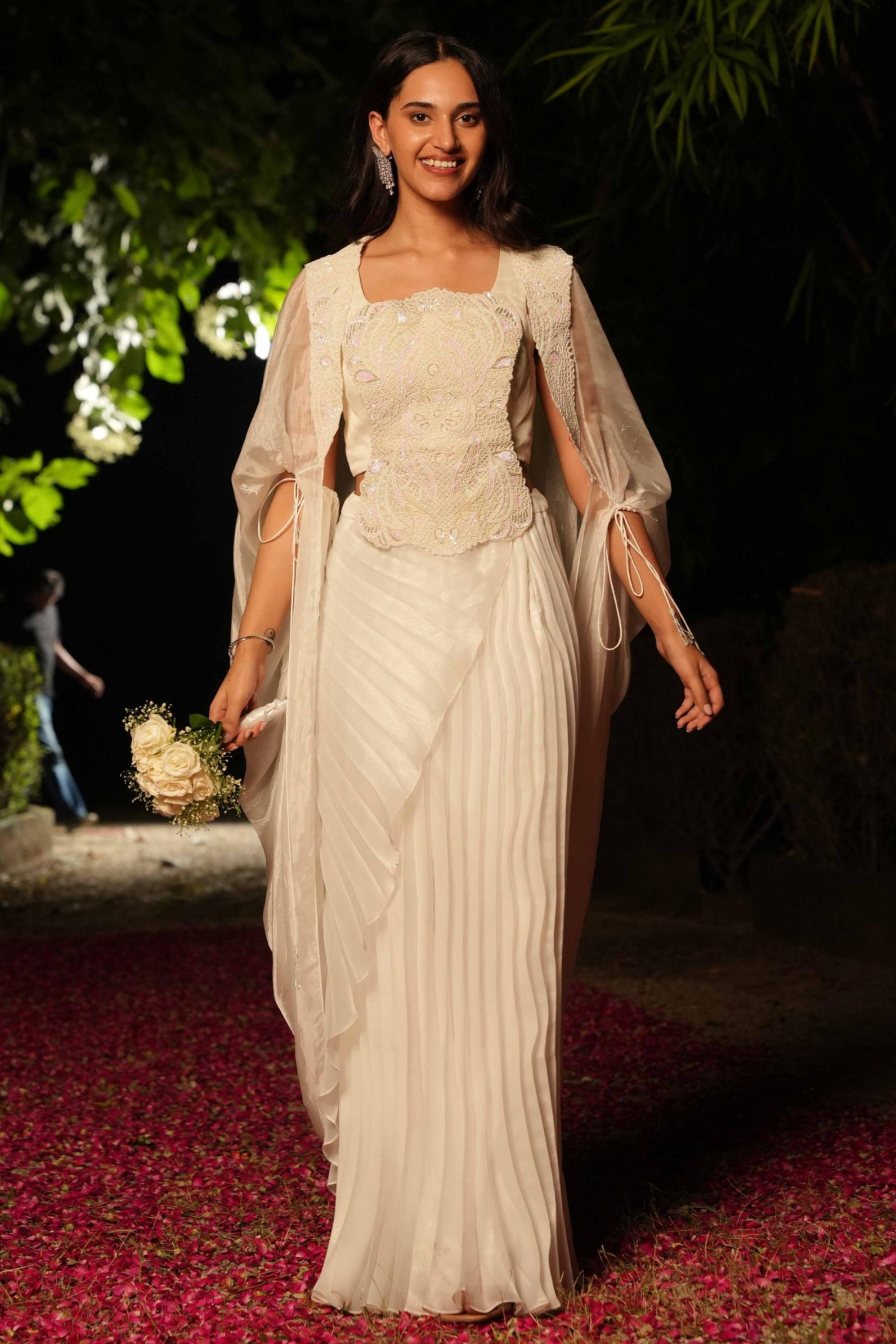 The Ivory Dil Se Zaraa Cape Set is an effortless blend of softness, structure, and soul. Designed in a serene ivory tone, this ensemble features a delicately embellished base paired with a flowing, sheer cape—capturing quiet strength and poetic movement. The Zaraa set speaks to the modern woman who values both presence and poise, making it ideal for intimate celebrations or ceremonial elegance. Pair it with statement earrings and minimal makeup for a look that feels effortlessly divine and deeply dil se.