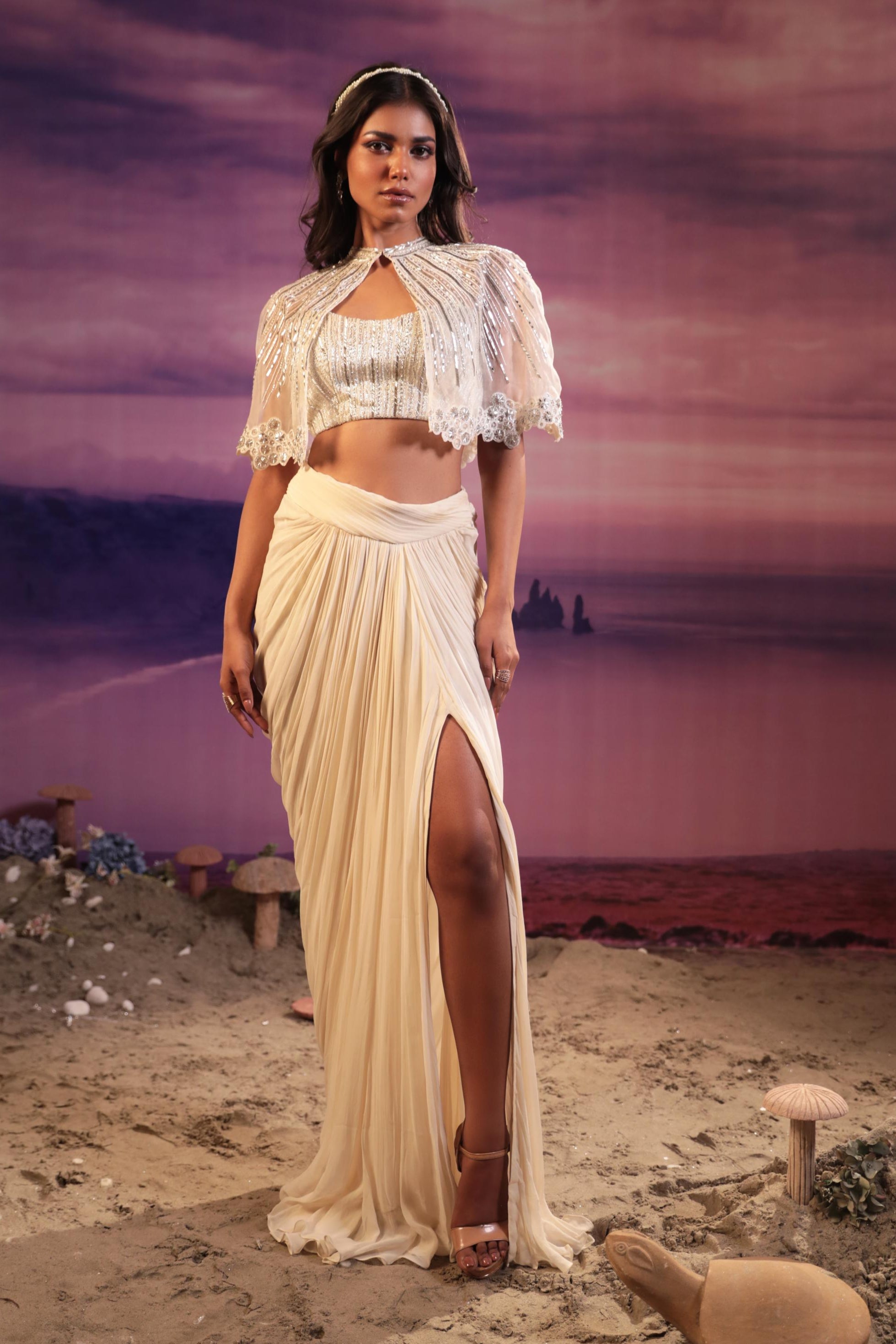Create a bold and chic look with this stunning ensemble featuring an embroidered blouse paired with a cape showcasing geometric lines all over. The drape skirt with a high slit adds a touch of allure and modern sophistication. Perfect for cocktail parties or formal events, this outfit combines style and elegance effortlessly.