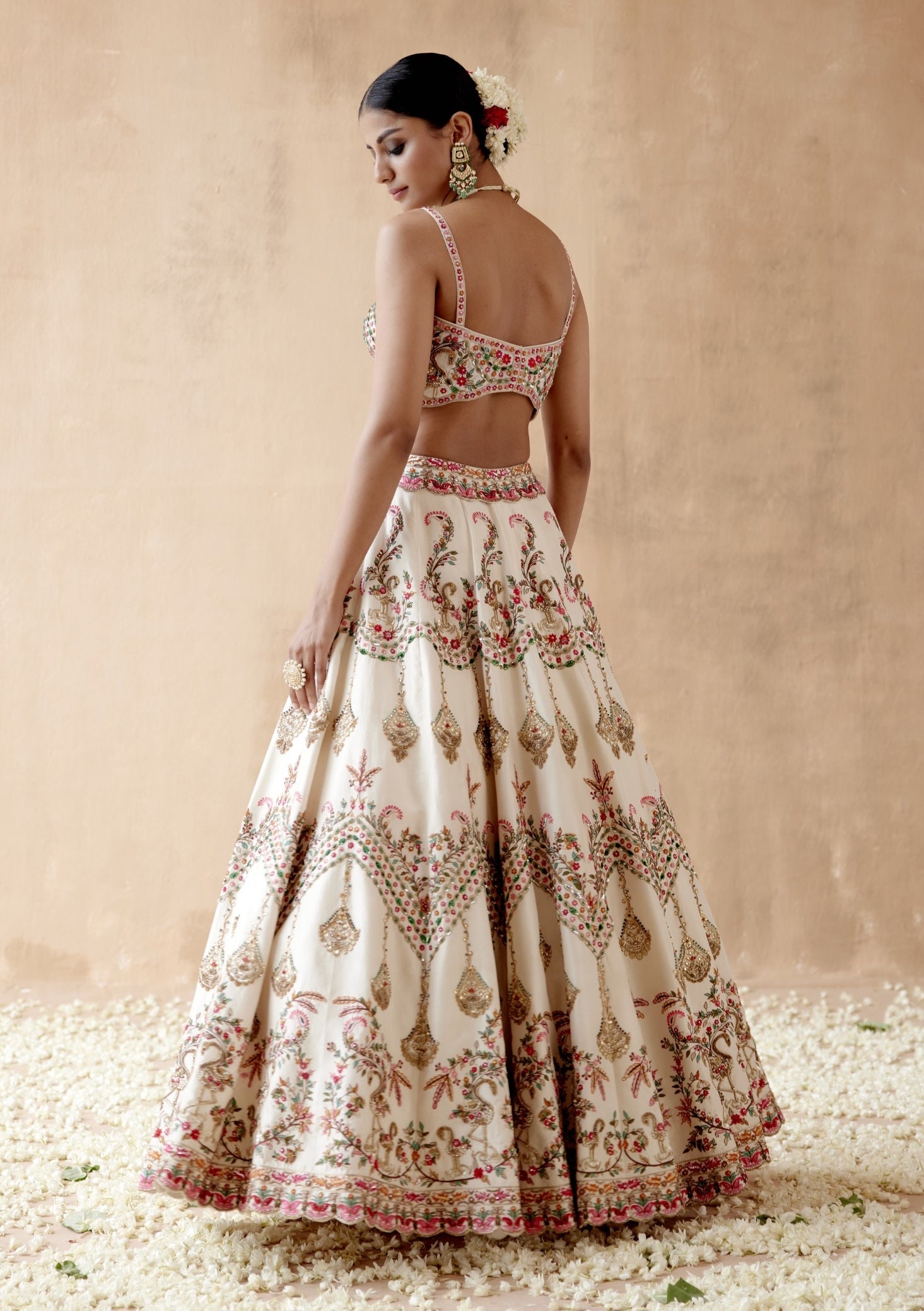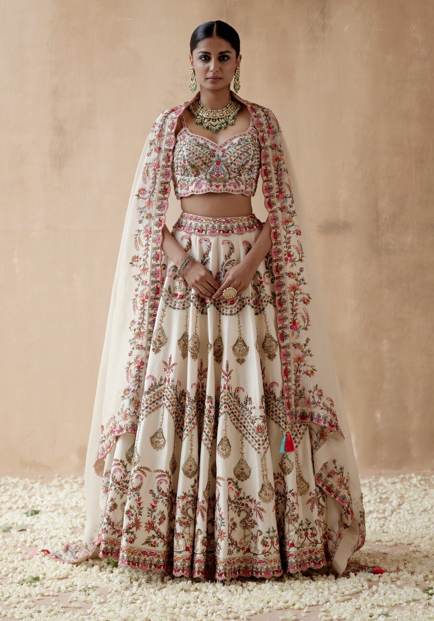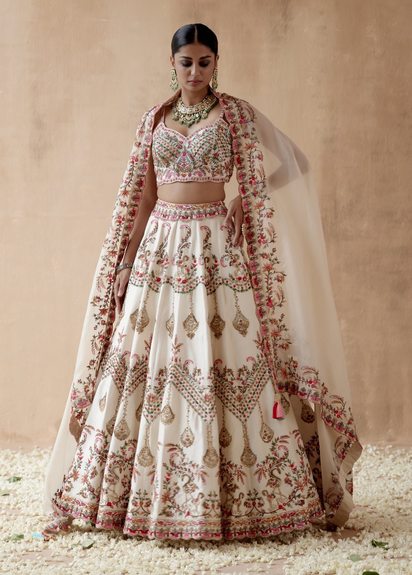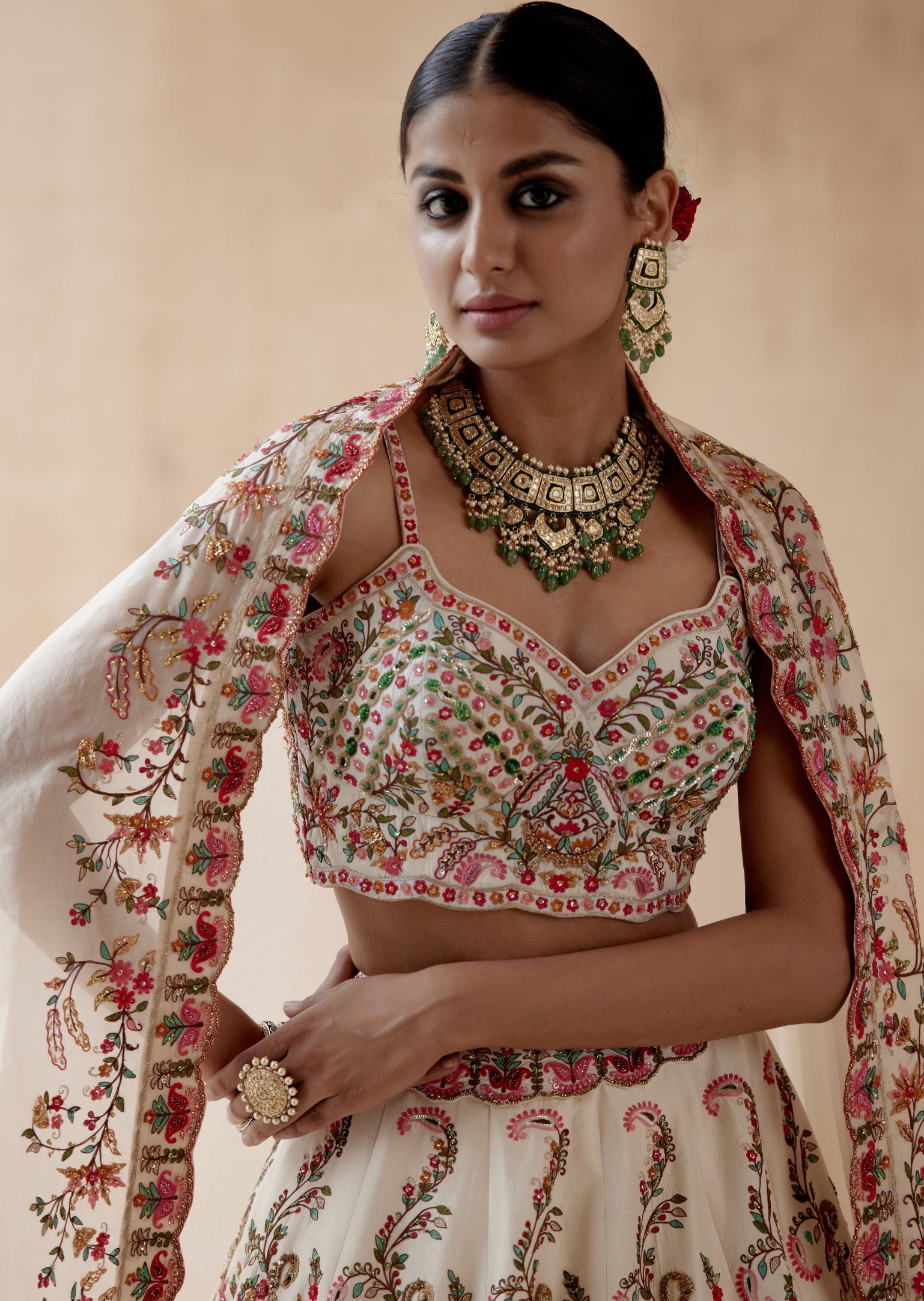 Experience timeless elegance with our exquisite ivory dupion silk lehenga set, adorned with delicate floral thread embroidery and highlighted by a range of sophisticated embellishments. This refined ensemble is paired with a meticulously embroidered blouse and a matching dupatta, creating a seamless and graceful look. Ideal for weddings, formal events, and special occasions, this lehenga set combines classic charm with luxurious texture, offering a truly elegant and unforgettable appearance.