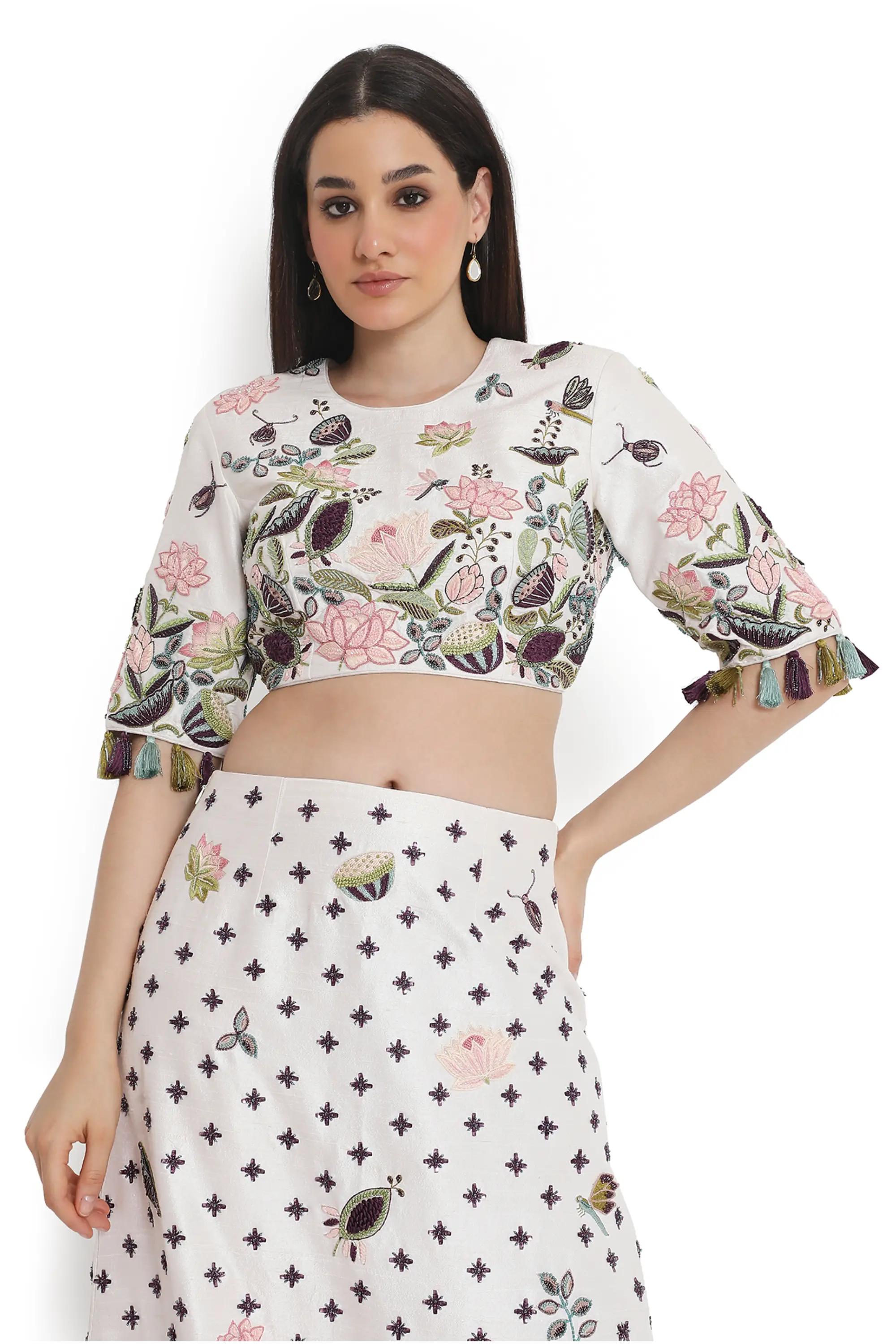 Radiate elegance with this exquisite ivory ensemble, featuring a finely embroidered dupion silk choli that combines traditional artistry with contemporary design. Paired with a matching embroidered dupion silk skirt, this outfit offers a regal yet understated charm. Perfect for weddings, festive gatherings, and special occasions, this set showcases timeless craftsmanship and luxurious fabric, making it a standout addition to your wardrobe.