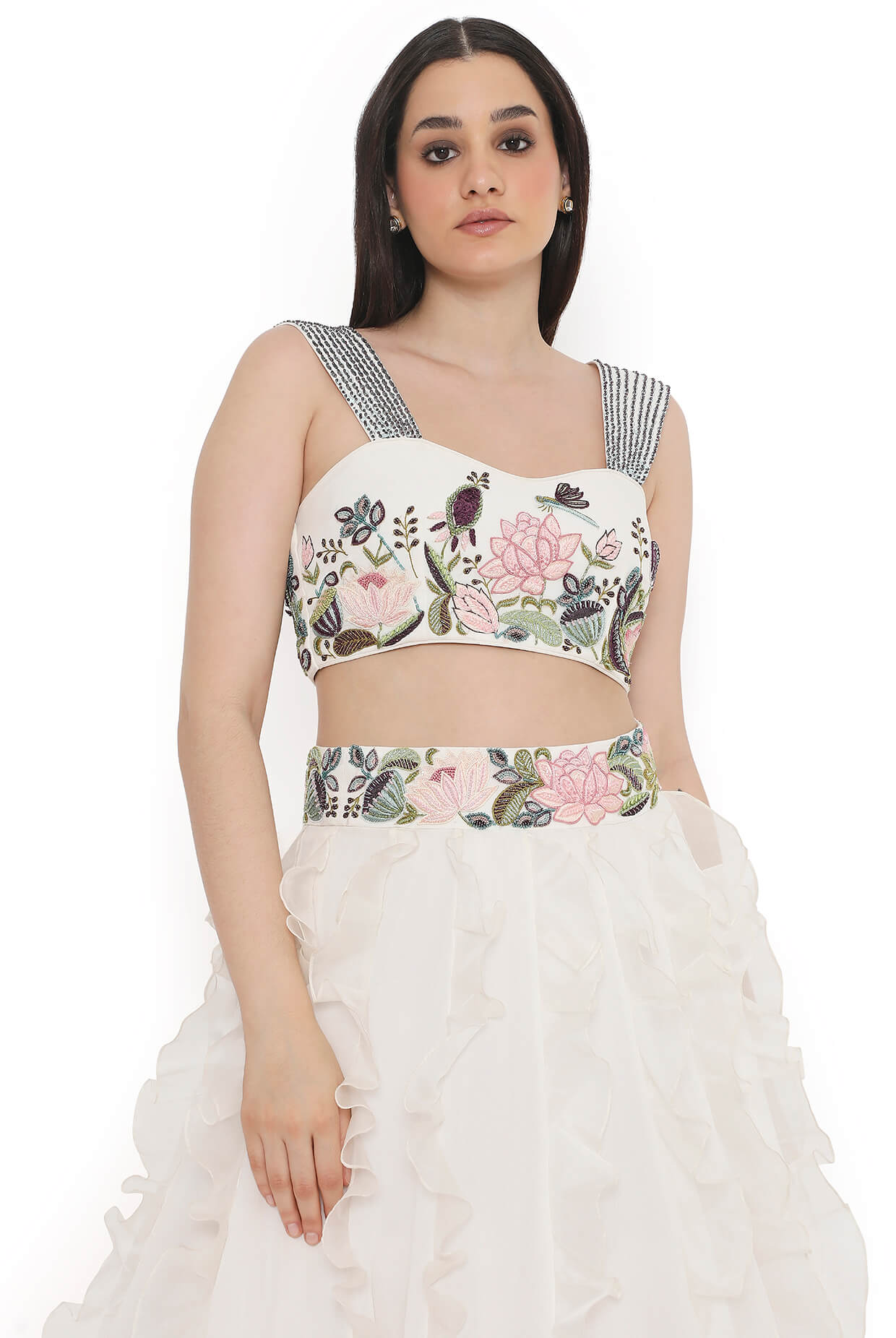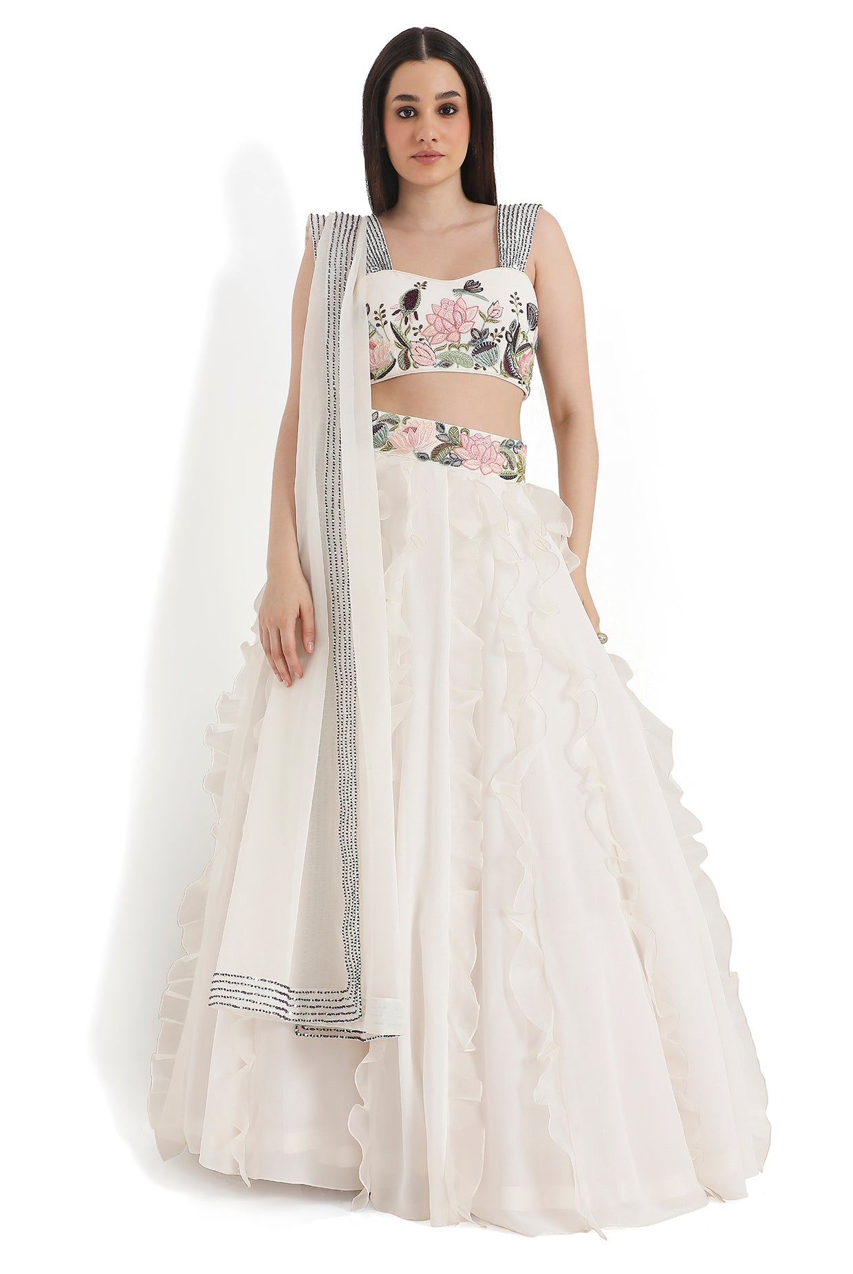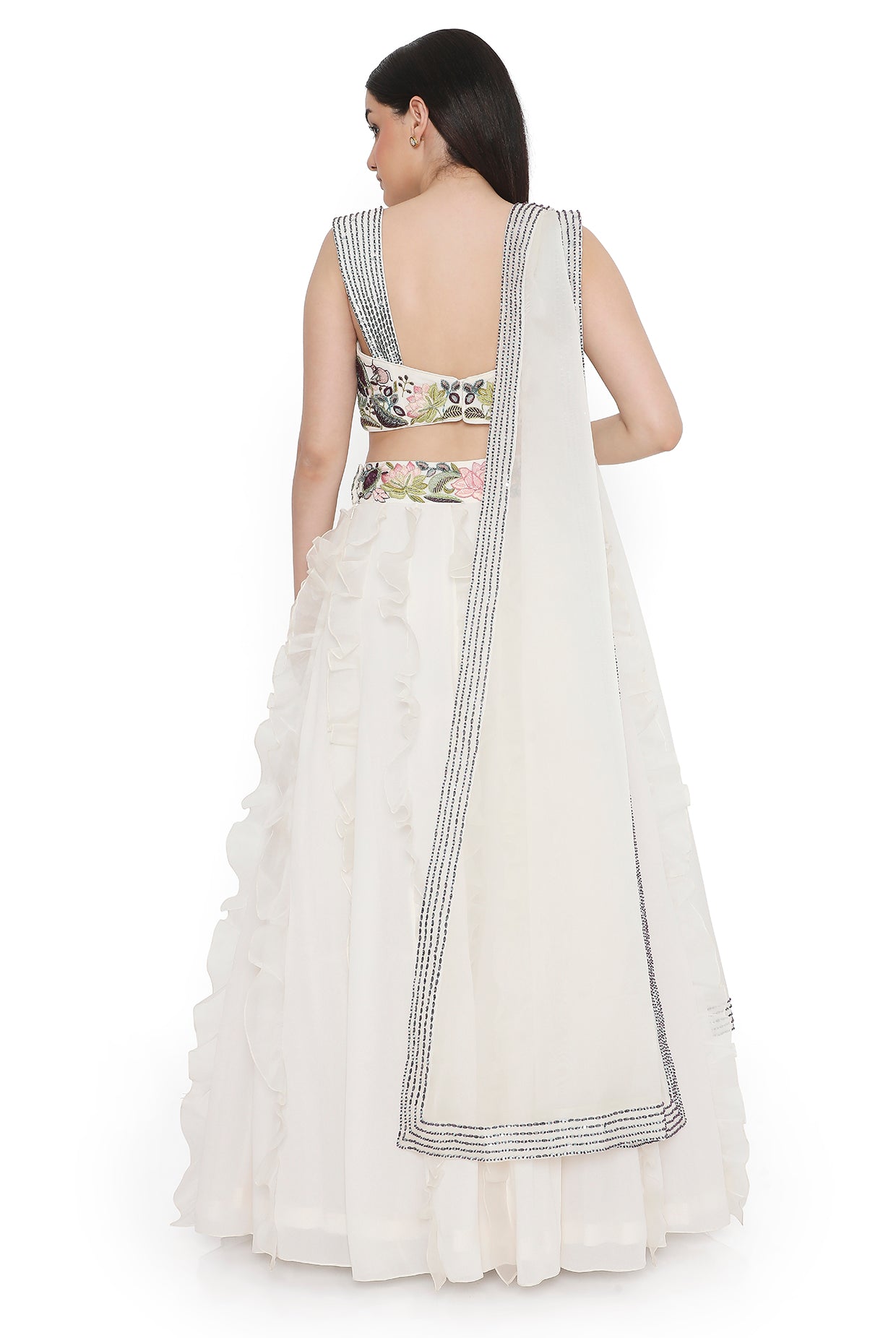 Ivory embroidered choli and ruffle lehenga with dupatta