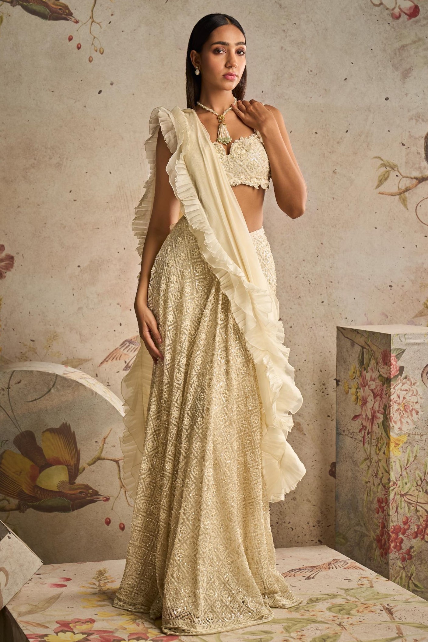 Step into refined elegance with the Ivory Finesse Icon Saree Skirt set, a beautifully crafted ensemble that combines traditional charm with modern sophistication. Featuring an ivory sharara paired with a matching top, this set showcases intricate detailing and a flattering silhouette, perfect for weddings, festive occasions, and special celebrations. Elevate your ethnic wardrobe with this graceful outfit that embodies finesse and timeless style.