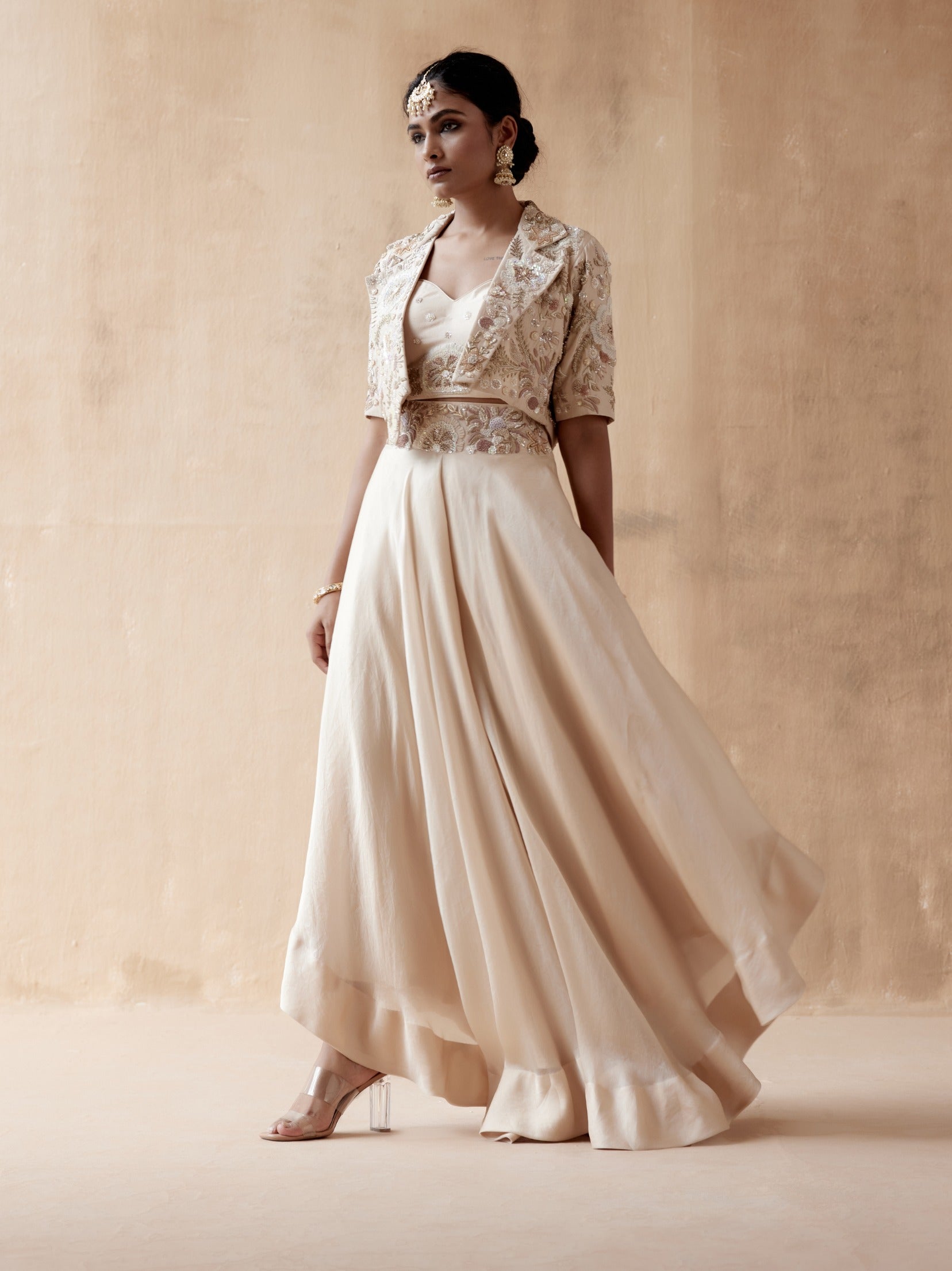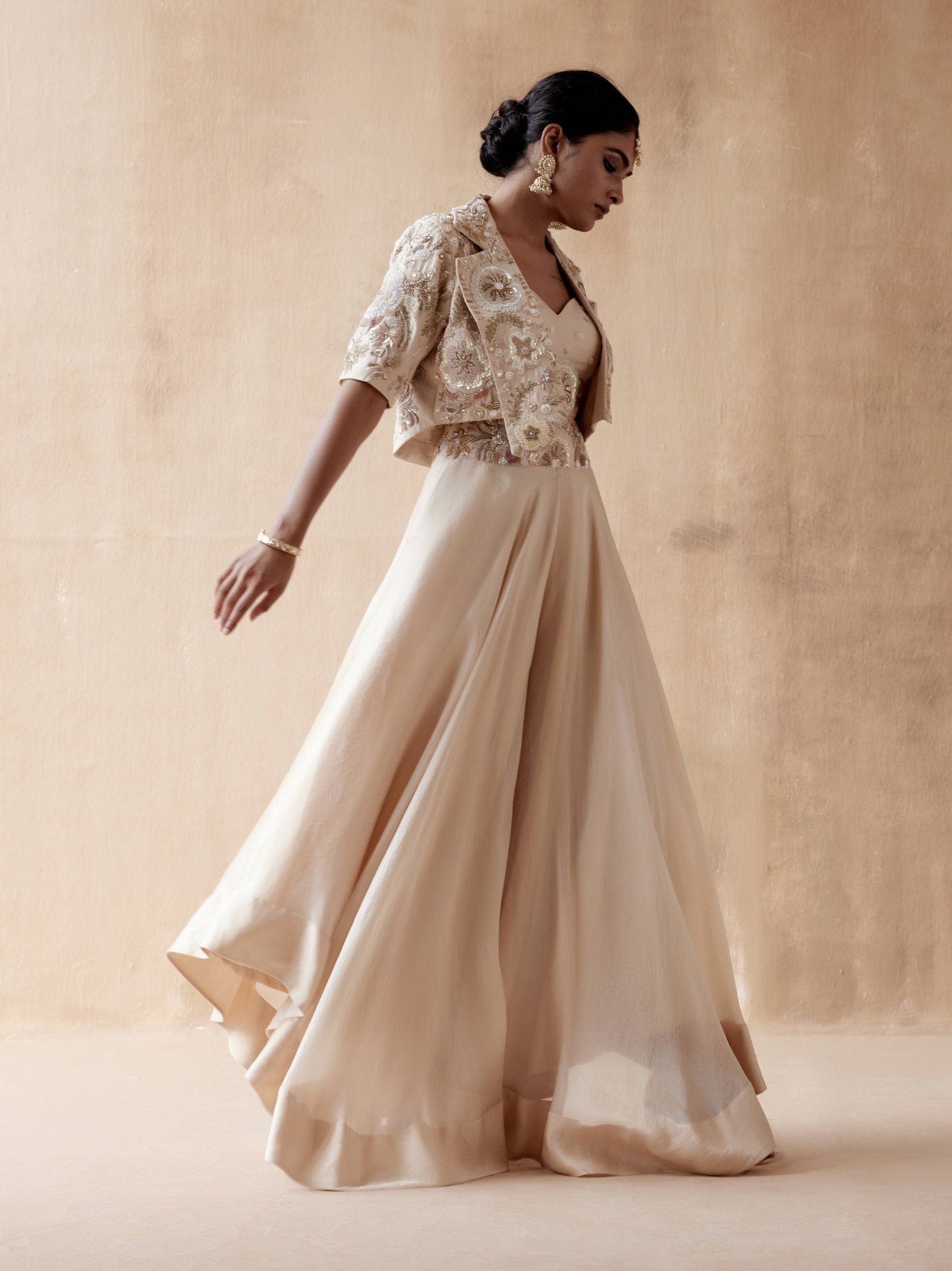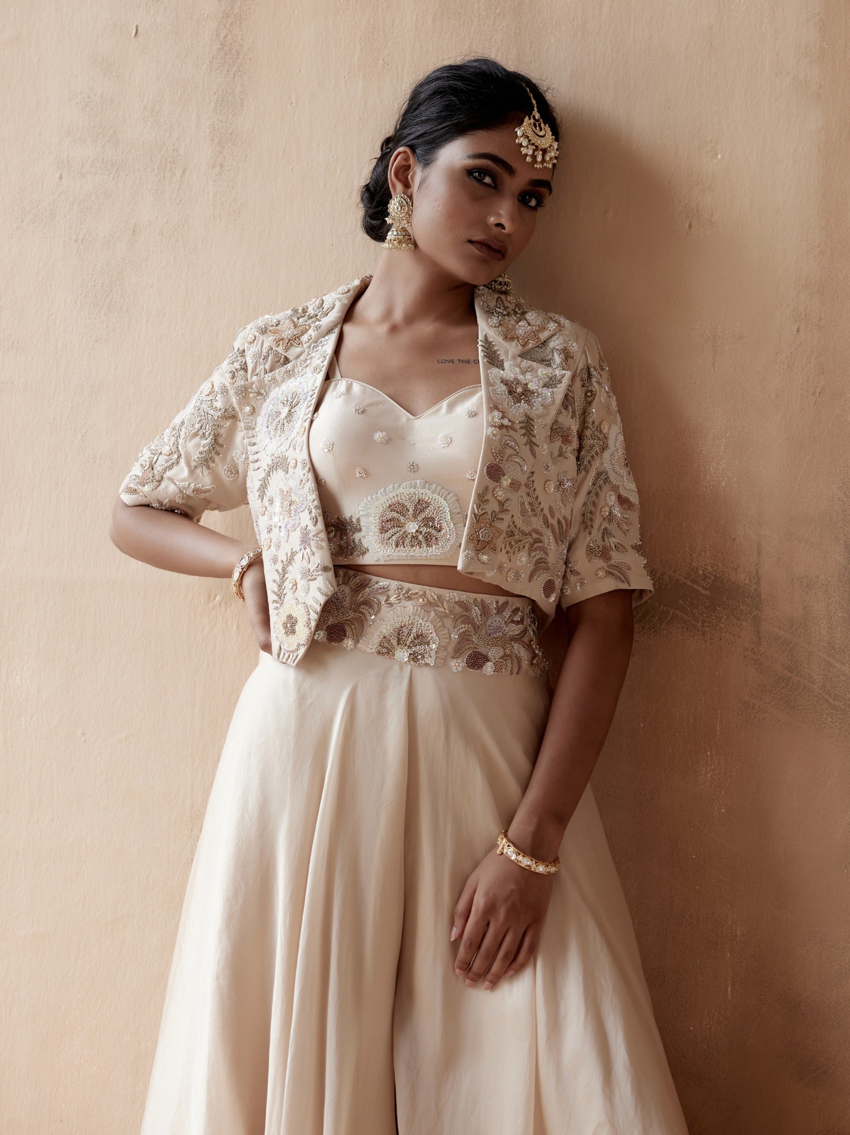 Step into sophistication with our elegant ivory jacket, adorned with exquisite floral thread embroidery and highlighted with a range of delicate embellishments. This refined jacket is perfectly paired with a coordinating blouse and a flowing organza sharara, creating a harmonious and stylish ensemble. Ideal for special occasions and festive events, this outfit seamlessly combines classic charm with contemporary flair, offering a timeless look that is both graceful and fashion-forward.