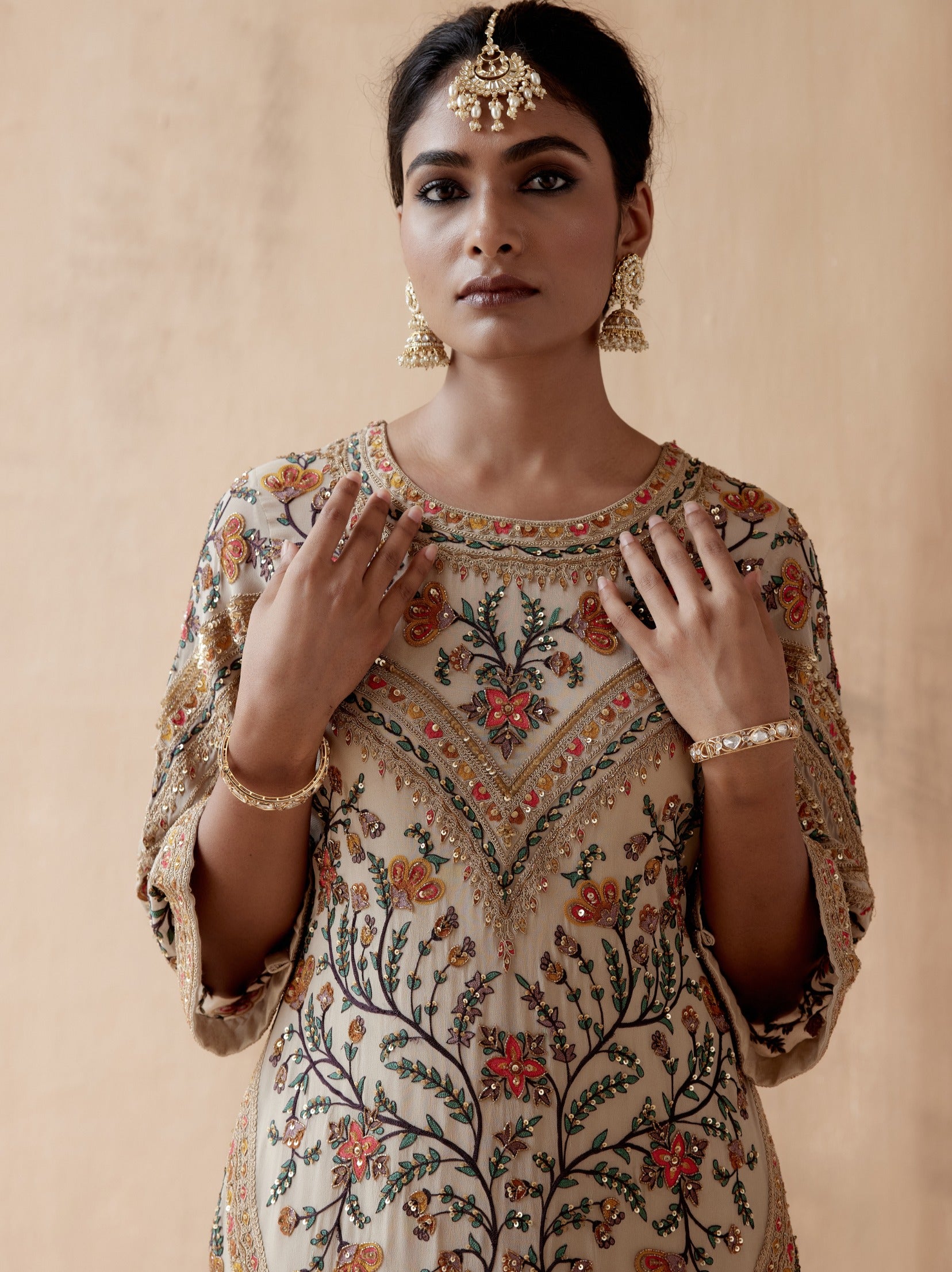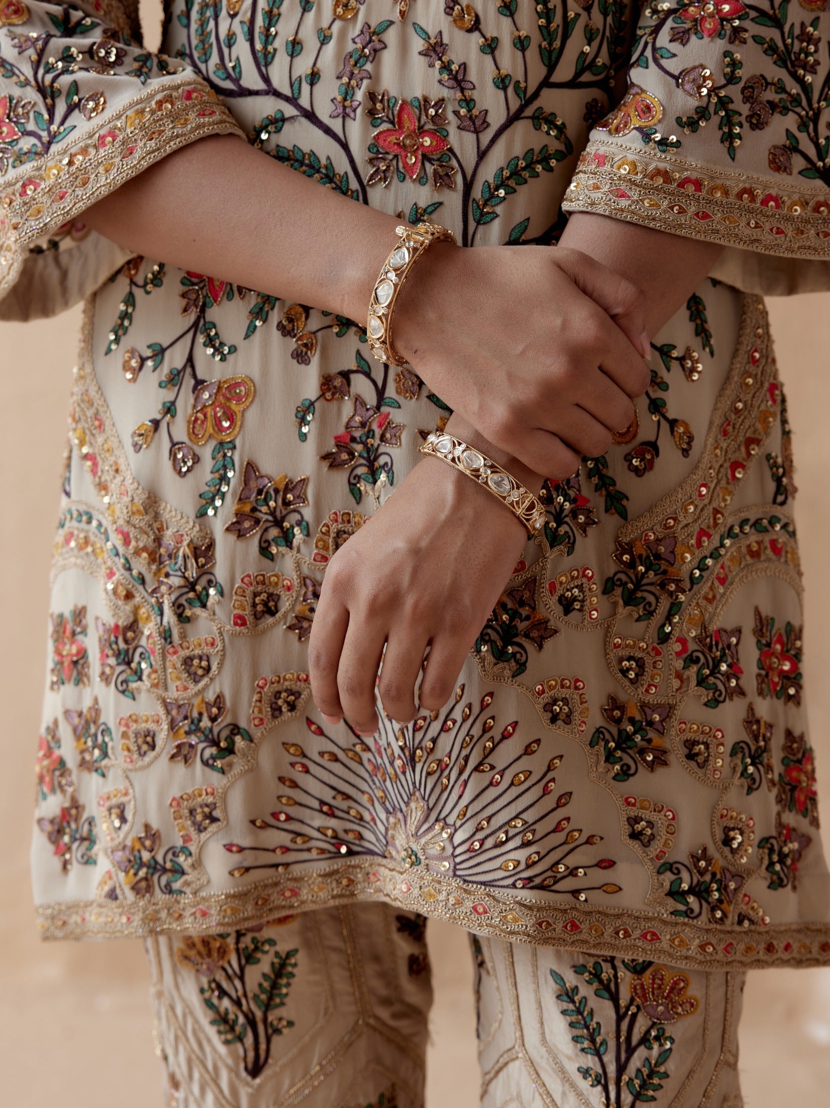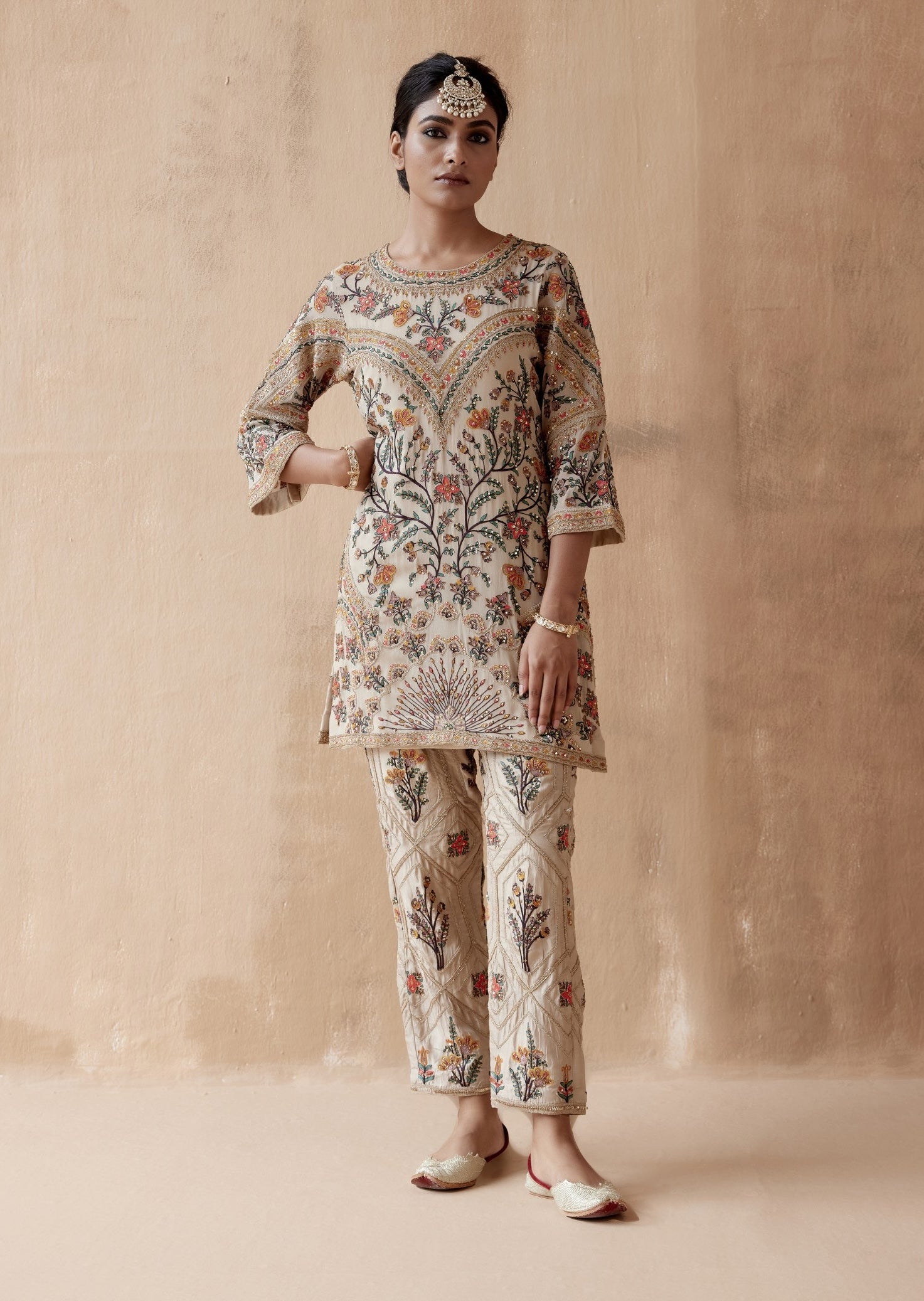 Elevate your style with our chic ivory kurta, featuring delicate floral thread embroidery and adorned with a variety of sophisticated embellishments. This elegant kurta is paired with matching pants, creating a refined and cohesive ensemble suitable for any occasion. The combination of intricate embroidery and subtle detailing ensures a timeless look that seamlessly blends classic charm with modern elegance. Perfect for both casual and formal events, this outfit adds a touch of grace and sophistication to your wardrobe.