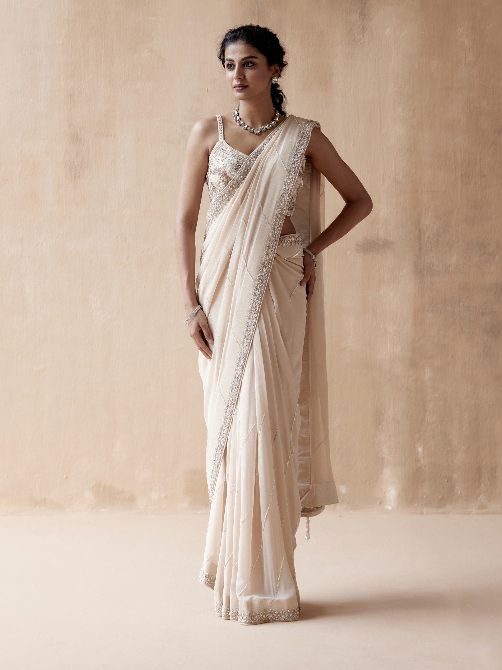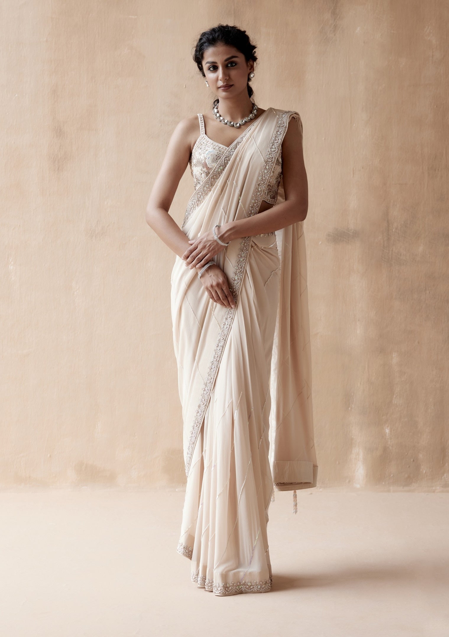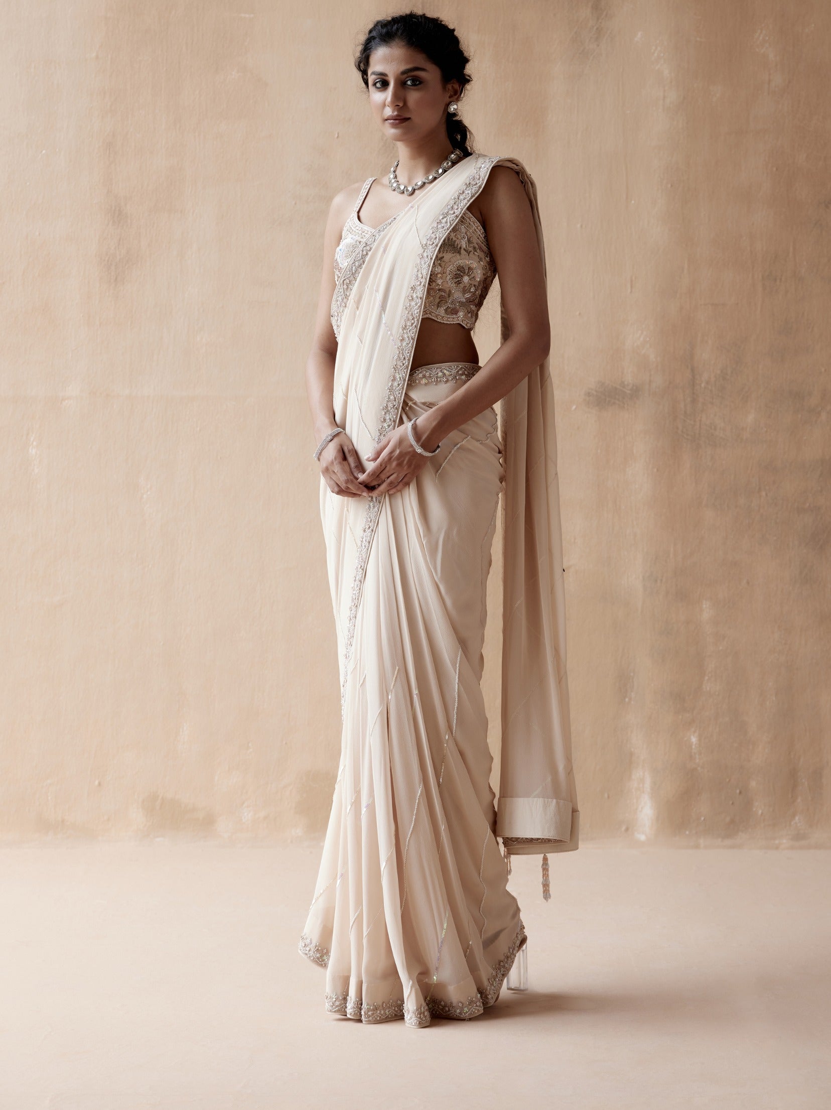 Discover timeless sophistication with our exquisite ivory saree, a masterpiece adorned with intricate floral thread embroidery. This stunning ensemble features delicate floral patterns meticulously crafted with premium threads, highlighted by a range of elegant embellishments. The result is a saree that radiates grace and charm, perfect for any special occasion. Each detail is thoughtfully designed to offer a blend of classic beauty and contemporary flair, making this saree a must-have for your wardrobe.