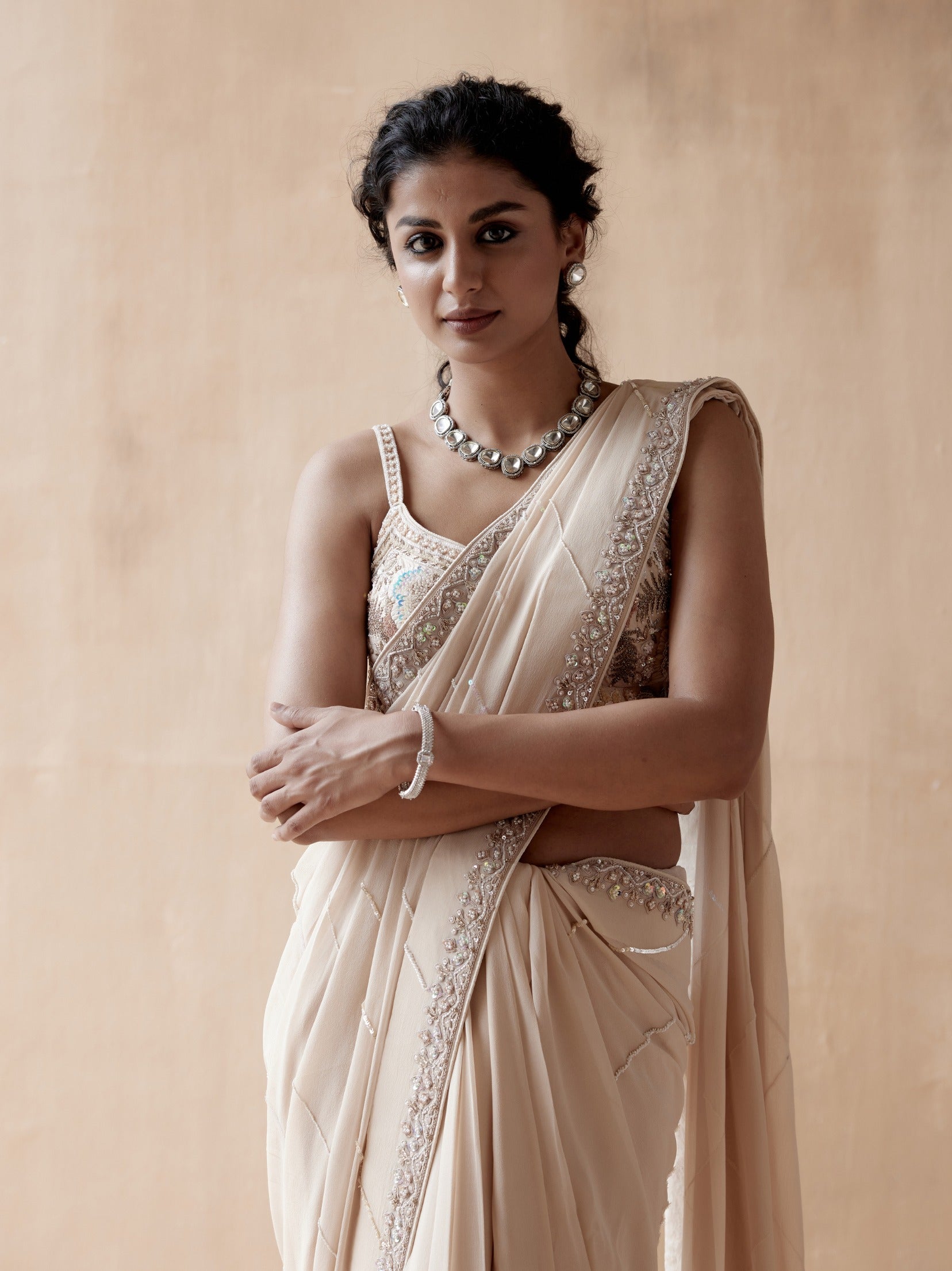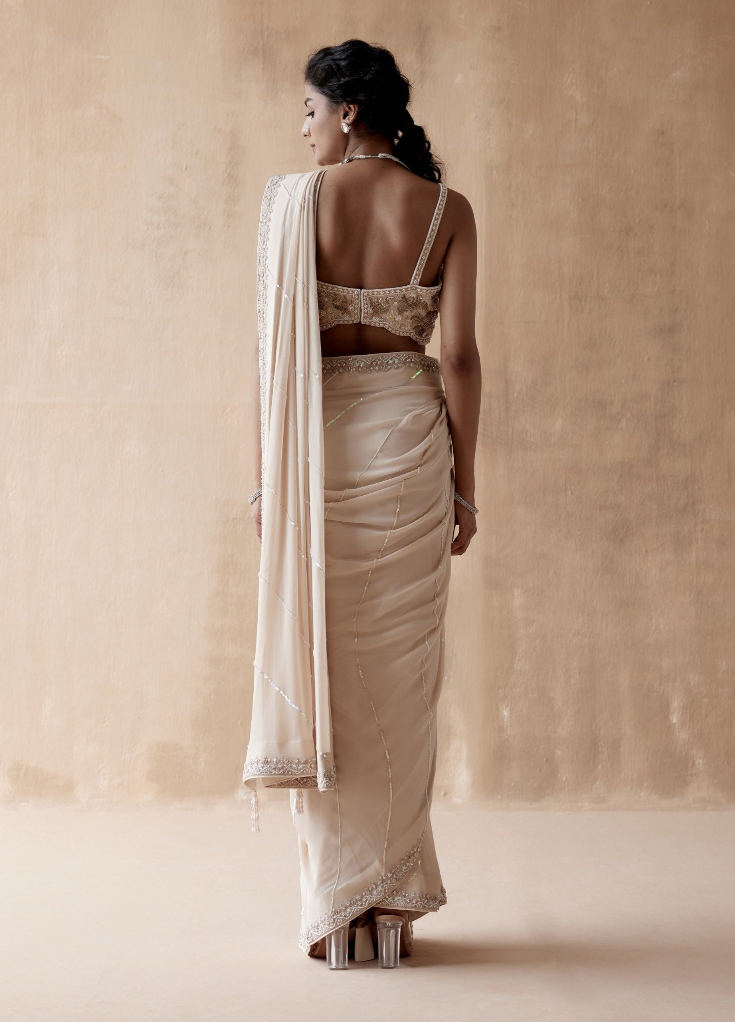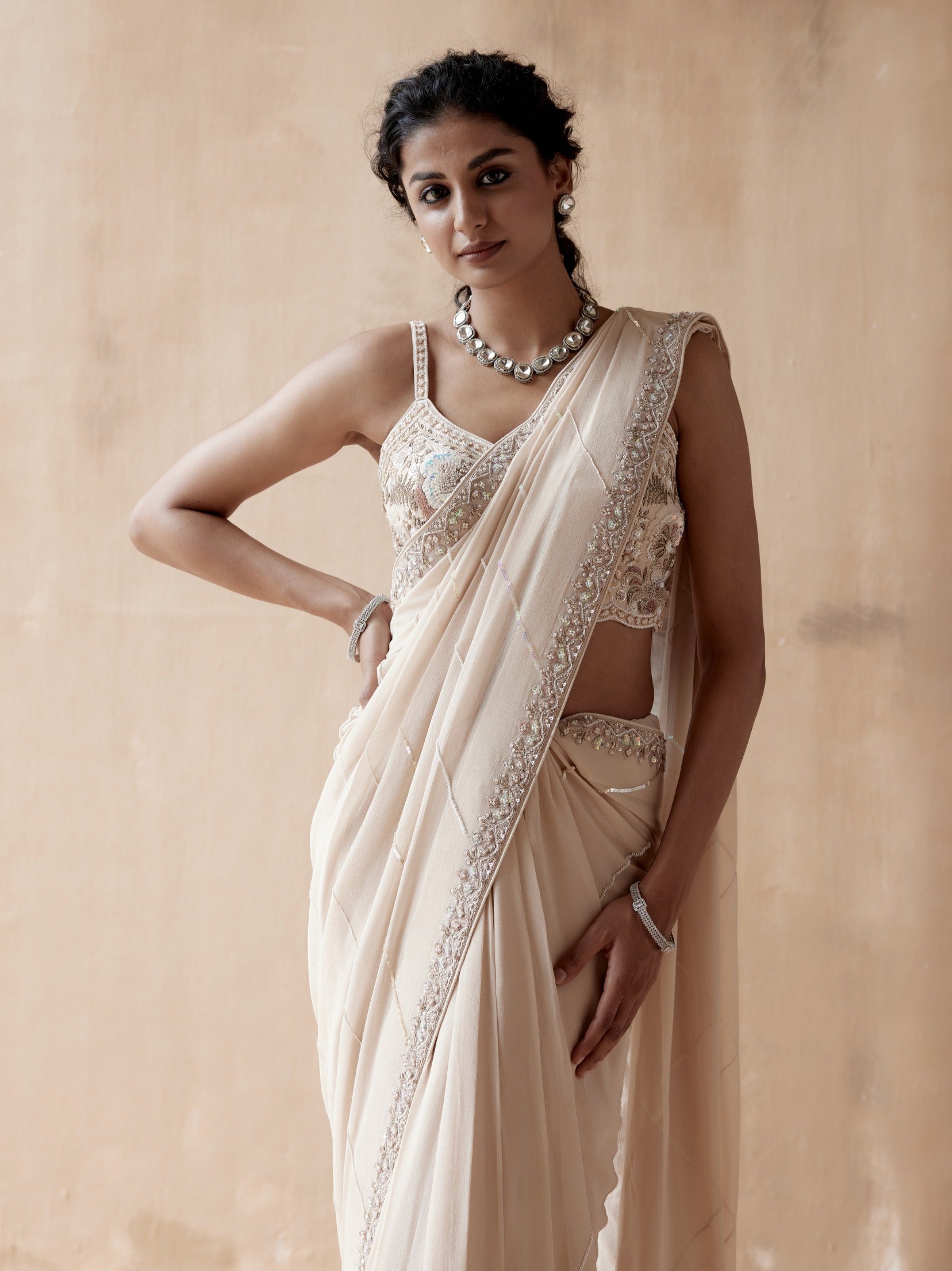 Discover timeless sophistication with our exquisite ivory saree, a masterpiece adorned with intricate floral thread embroidery. This stunning ensemble features delicate floral patterns meticulously crafted with premium threads, highlighted by a range of elegant embellishments. The result is a saree that radiates grace and charm, perfect for any special occasion. Each detail is thoughtfully designed to offer a blend of classic beauty and contemporary flair, making this saree a must-have for your wardrobe.