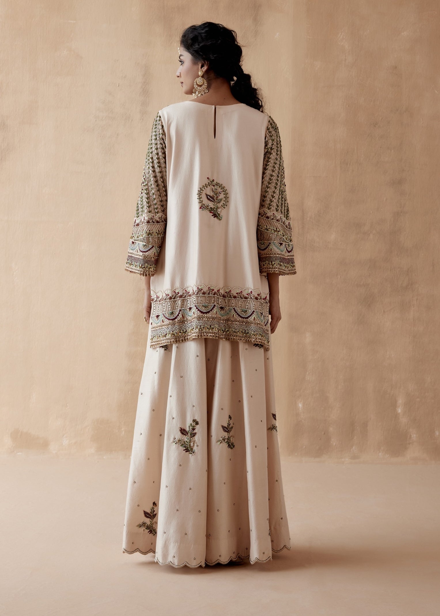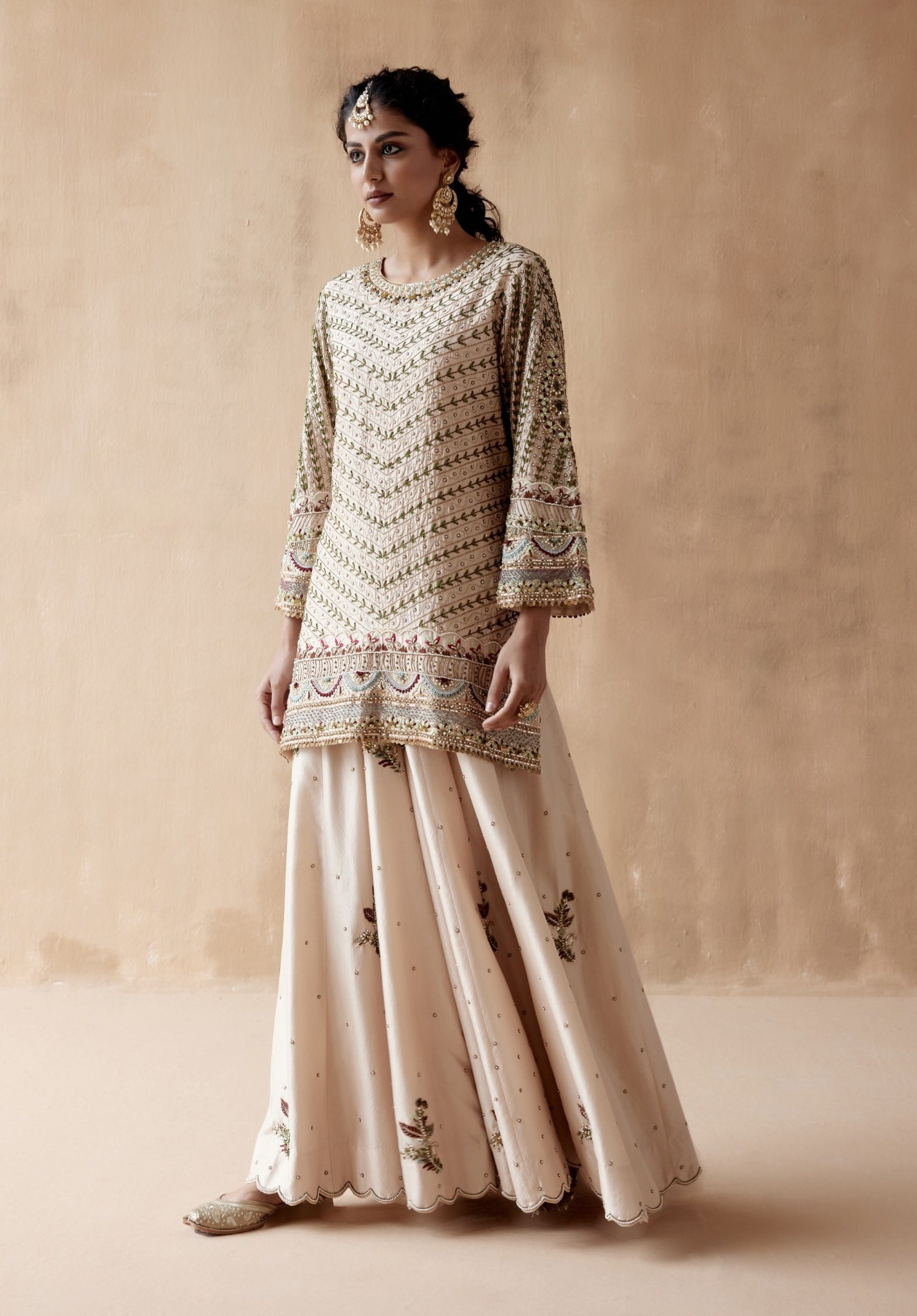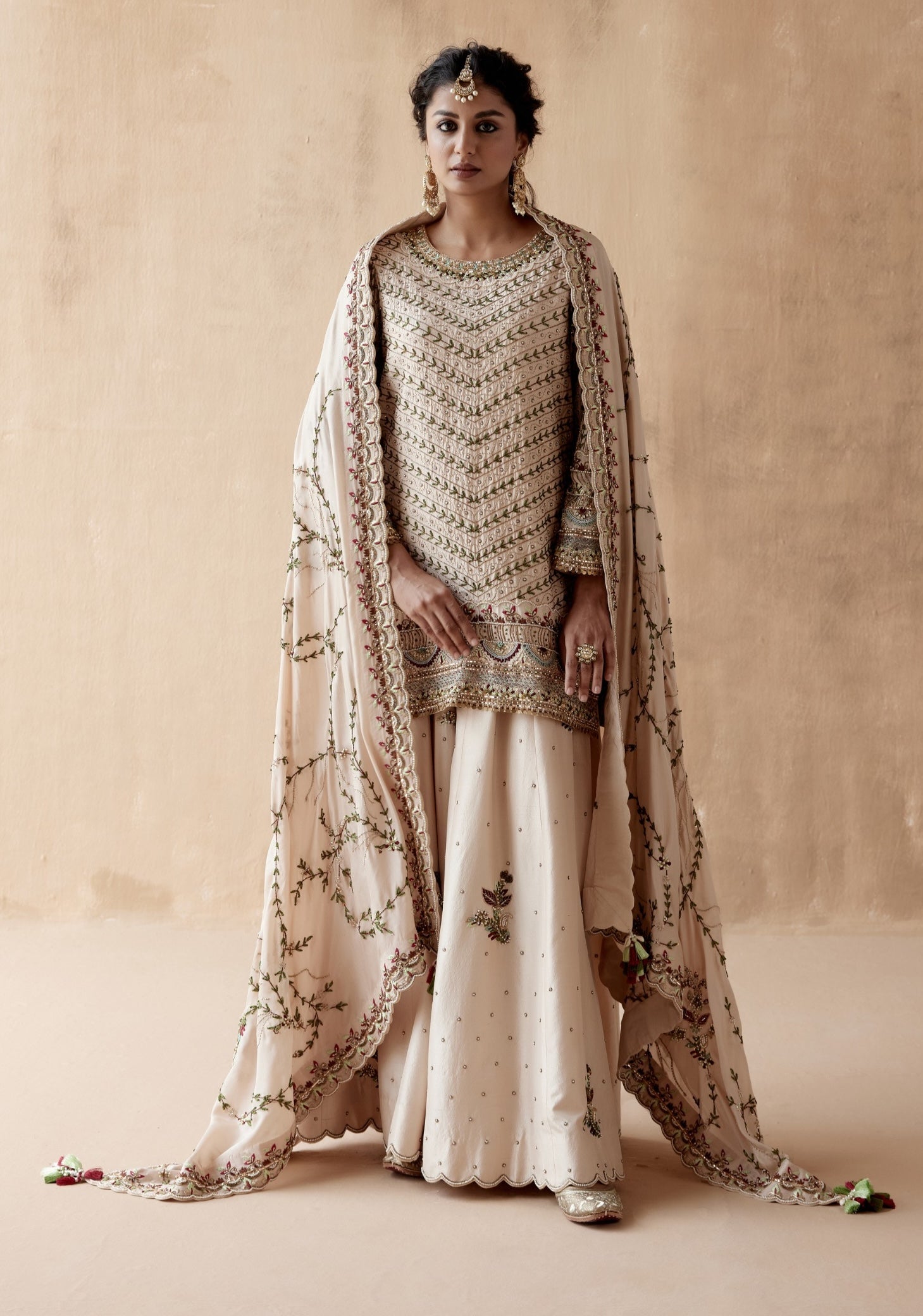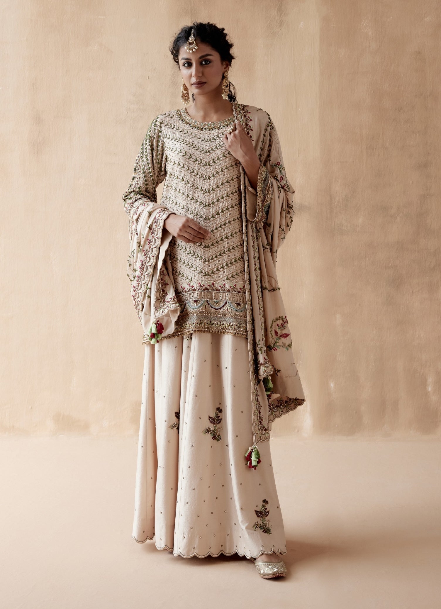 Elevate your style with our stunning ivory kurta, featuring exquisite floral thread embroidery and adorned with a variety of sophisticated embellishments. This refined kurta is paired with a coordinating sharara for a chic and cohesive look. Completing the ensemble is a heavily embroidered dupatta that adds an extra layer of opulence and sophistication. Perfect for special occasions and festive events, this outfit combines classic elegance with intricate details to create a truly captivating and timeless appearance.