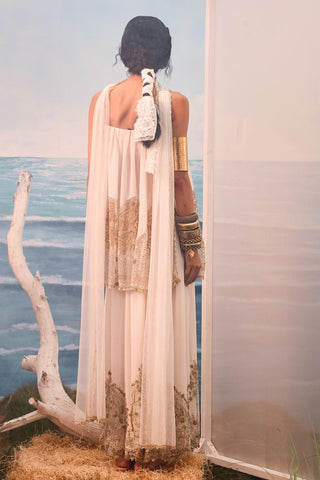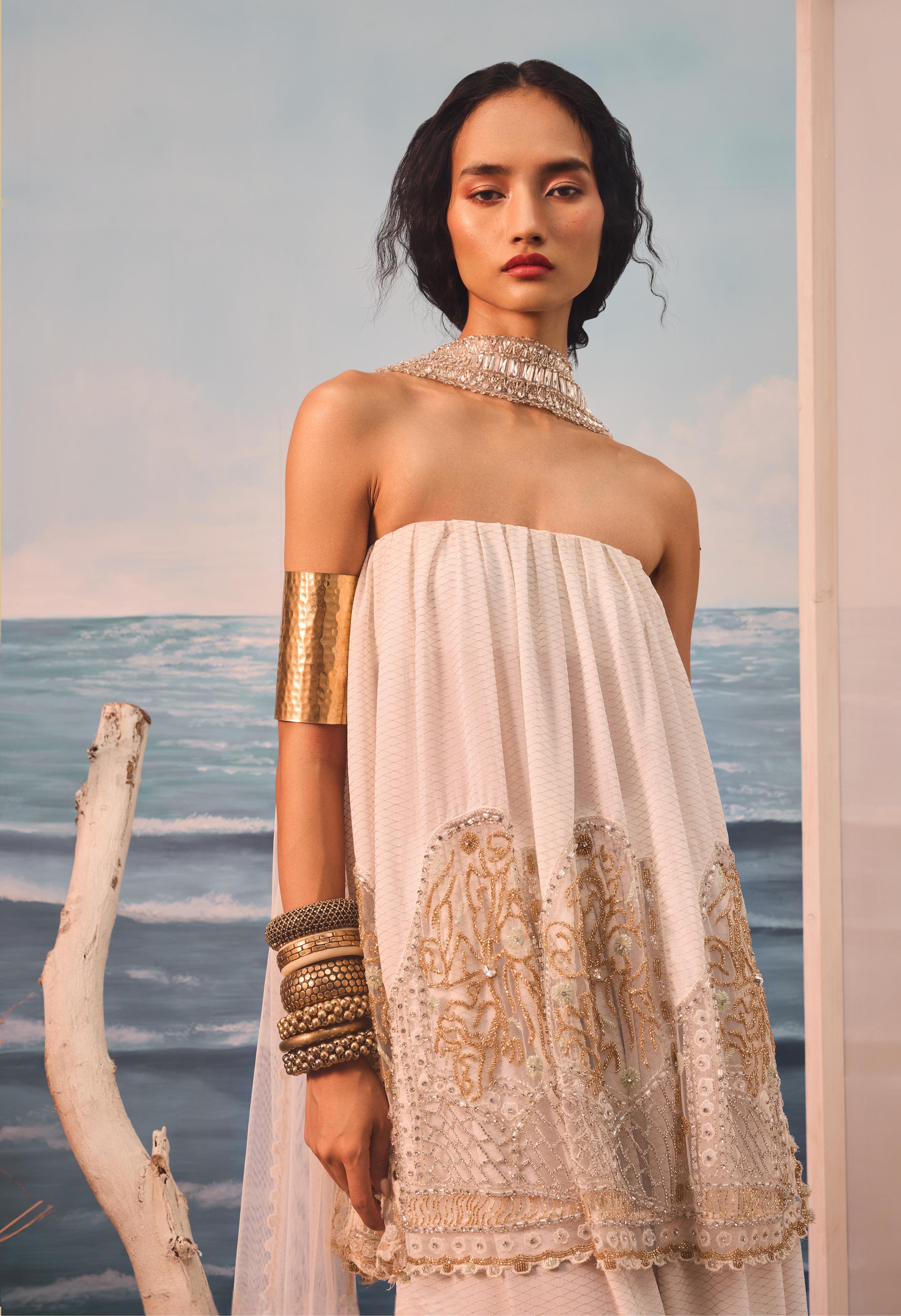 Immerse yourself in a world of opulence with this regal lehenga, where a dreamy palette meets exquisite craftsmanship. Inspired by the fusion of Art Deco and Indian tradition, this ensemble showcases Matsya's signature tarnished silver gota patti and intricate zari work. The lehenga and halter-neck blouse are elegantly crafted from luxurious Chanderi fabric, while the tasseled dupatta, made from sumptuous organza, adds an additional layer of sophistication. This lehenga effortlessly blends delicate embroidery with timeless style, making it a perfect choice for those who appreciate both heritage and modern elegance.