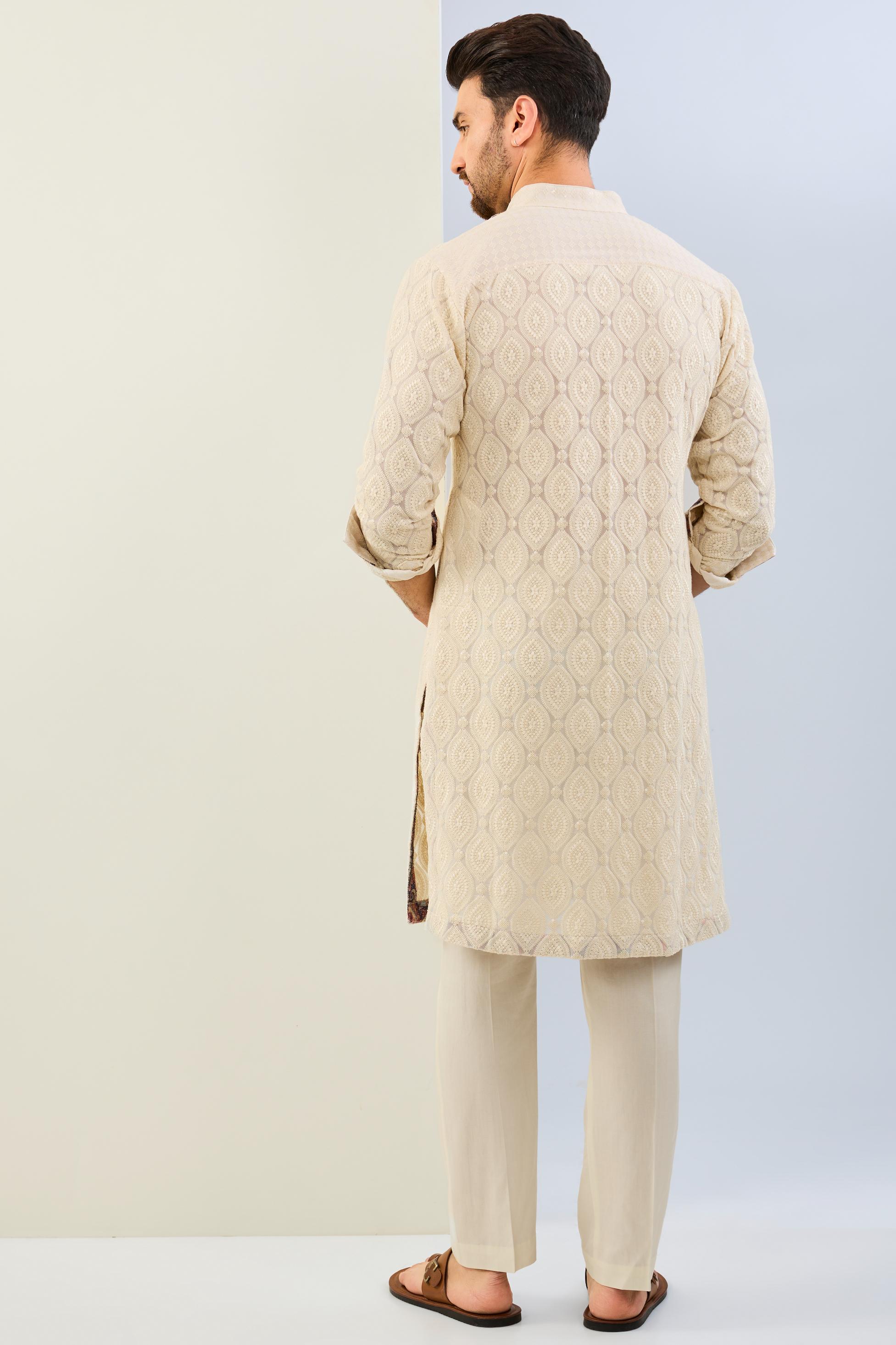 Experience timeless elegance with this ivory georgette embroidered kurta, featuring exquisite print detailing that adds a sophisticated touch to its flowing, lightweight fabric. The delicate embroidery enhances the kurta's charm, making it a perfect blend of traditional craftsmanship and contemporary design. Paired with matching cotton silk pants, this ensemble offers both comfort and style, with the soft cotton silk fabric providing a luxurious feel. Ideal for weddings, festive occasions, or evening gatherings, this ivory georgette kurta and pant set is a versatile addition to any wardrobe, radiating grace and understated luxury.