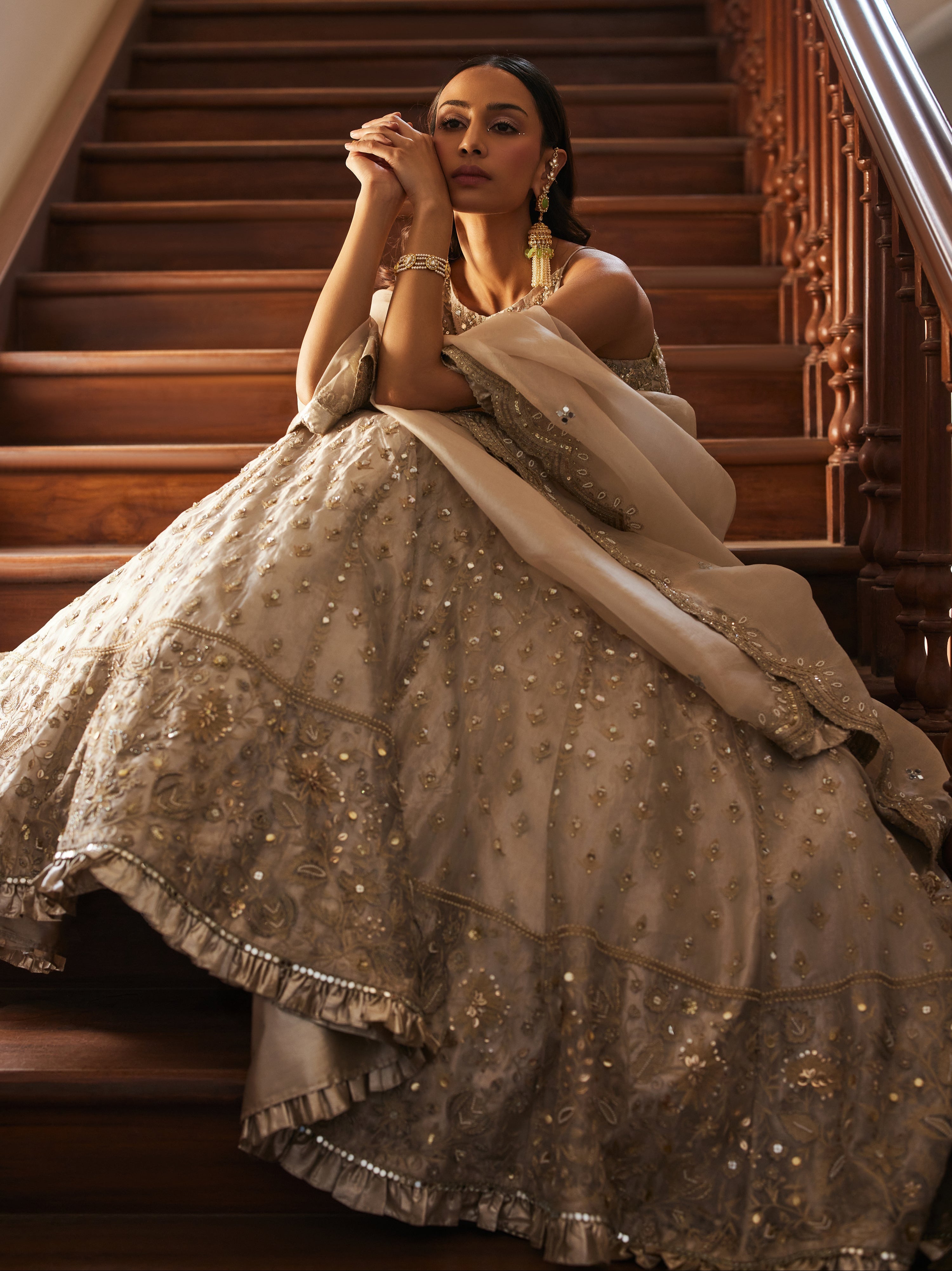 The Ivory Gold Twin Flames Lehenga Set is the epitome of timeless elegance and regal charm. Featuring delicate gold embroidery on a soft ivory base, this ensemble exudes sophistication with every detail. The flowing lehenga paired with a finely crafted blouse creates a graceful, flattering silhouette perfect for weddings, receptions, or festive celebrations. A harmonious blend of tradition and modern luxury, this set is designed for those who love understated glamour with a majestic touch.