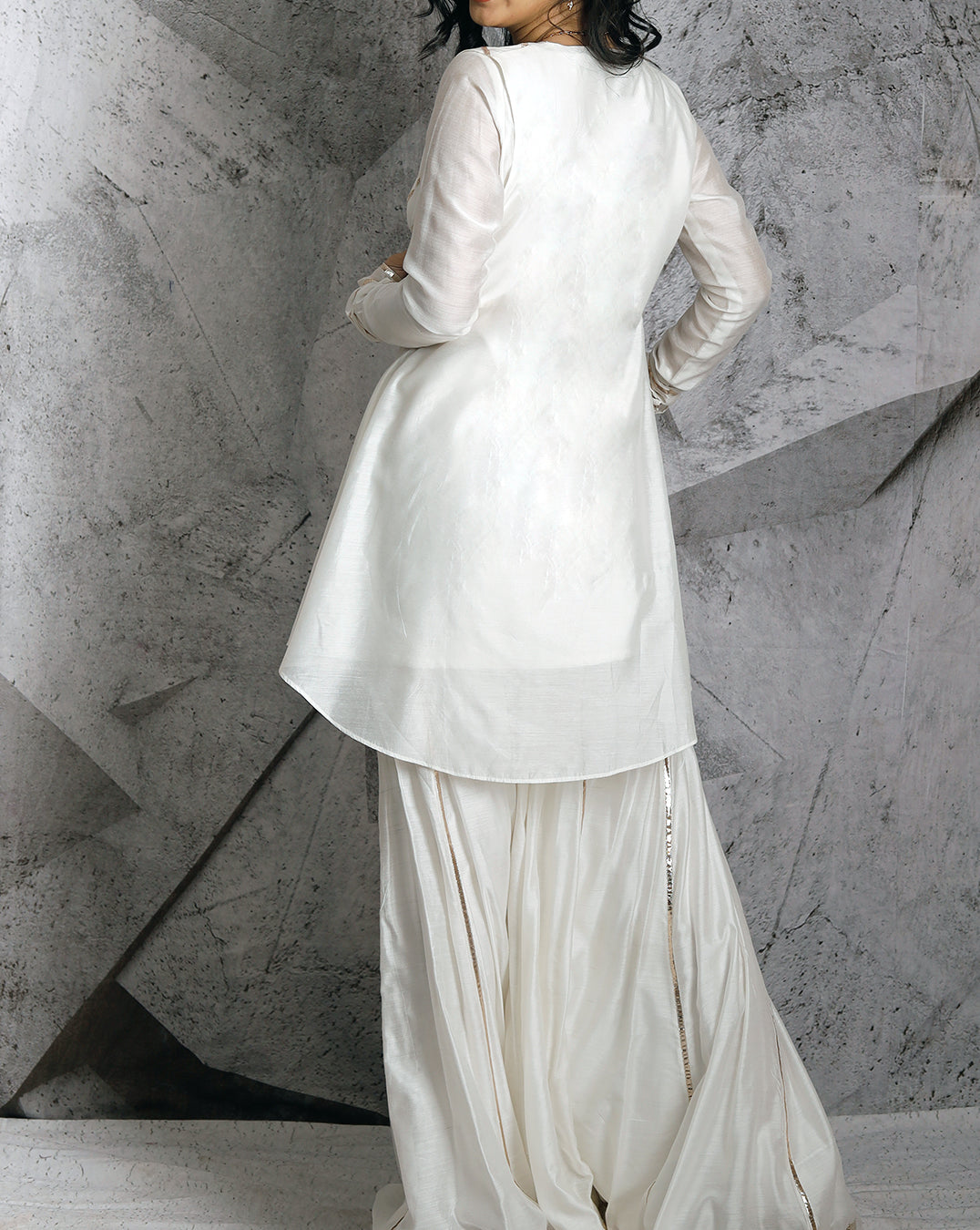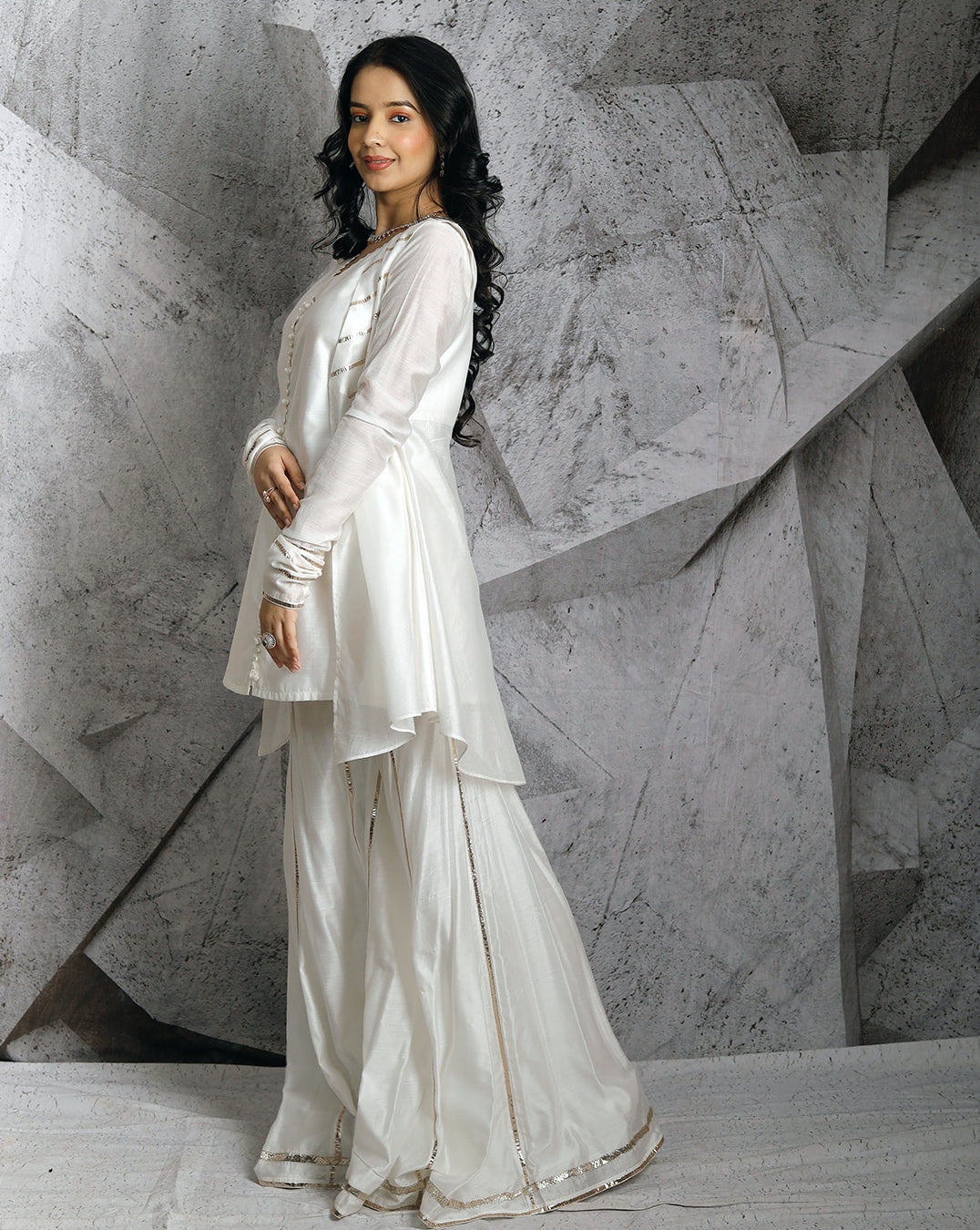 Experience the timeless elegance of this outfit, where the eternal grace of ivory meets the subtle shine of gota embellishments. Crafted from luxurious chanderi fabric, the kurta, jacket, and pants are handloomed with care by skilled women weavers. The rich texture of the chanderi, adorned with delicate gota details, creates a striking avant-garde look that seamlessly blends traditional craftsmanship with contemporary style. This ensemble is a celebration of artisanal artistry and modern sophistication, perfect for making a refined statement at any special occasion.