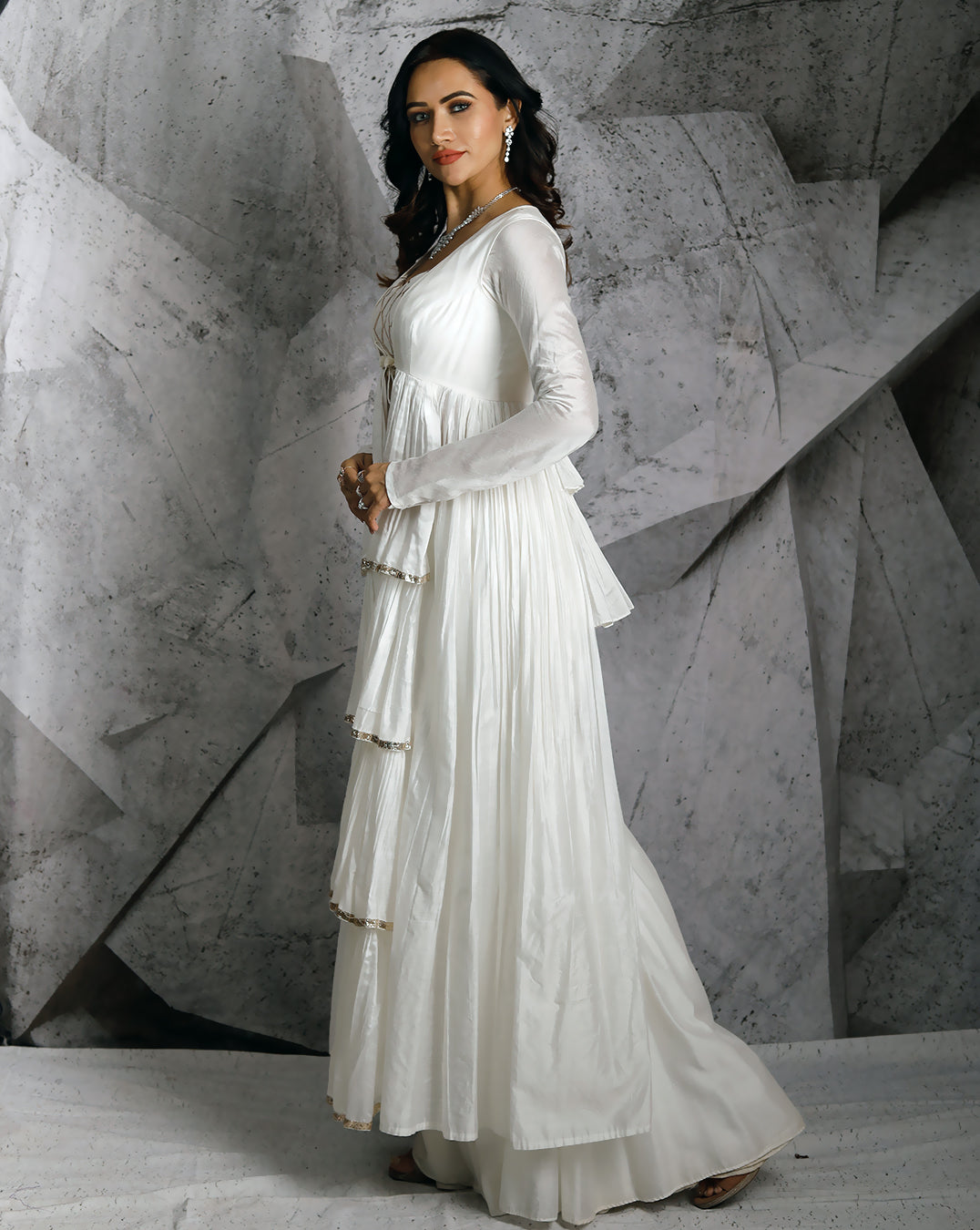 Embrace timeless elegance with this exquisite outfit, where the eternal grace of ivory meets the subtle allure of gota embellishments. Crafted from luxurious handloomed chanderi fabric, each piece—blouse, jacket, and pants—showcases the intricate artistry of skilled women weavers The rich texture of the chanderi, adorned with delicate gota work, creates a strikingly avant-garde look that seamlessly blends traditional craftsmanship with contemporary style. Perfect for making a refined statement at any occasion, this ensemble is a celebration of artisanal heritage and modern sophistication.
