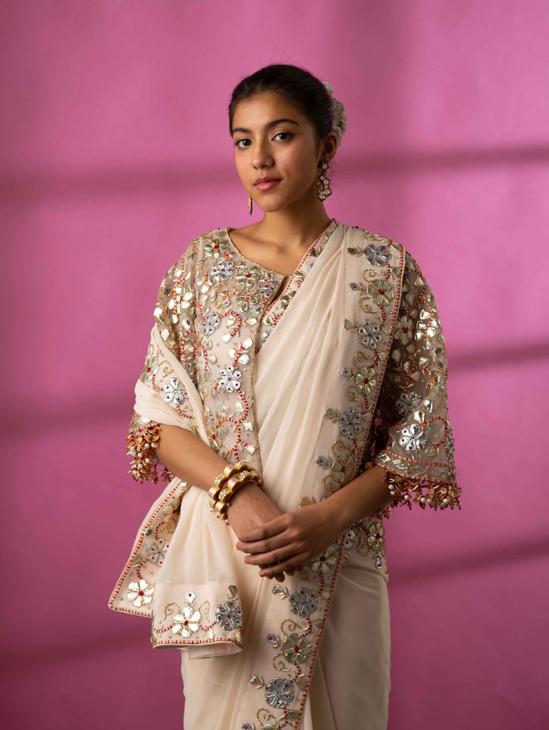 Elevate your elegance with our ivory gota patti saree set, a refined ensemble crafted from luxurious georgette. This sophisticated set features an ivory saree adorned with intricate gota patti embroidery, adding a subtle shimmer and texture to the delicate fabric. Accompanied by a beautifully detailed blouse and a matching cape, the set exudes modern grace and charm. The coordinating petticoat ensures a smooth, flawless drape. Ideal for weddings and formal occasions, this ensemble blends timeless elegance with contemporary flair, ensuring you make a stunning impression.