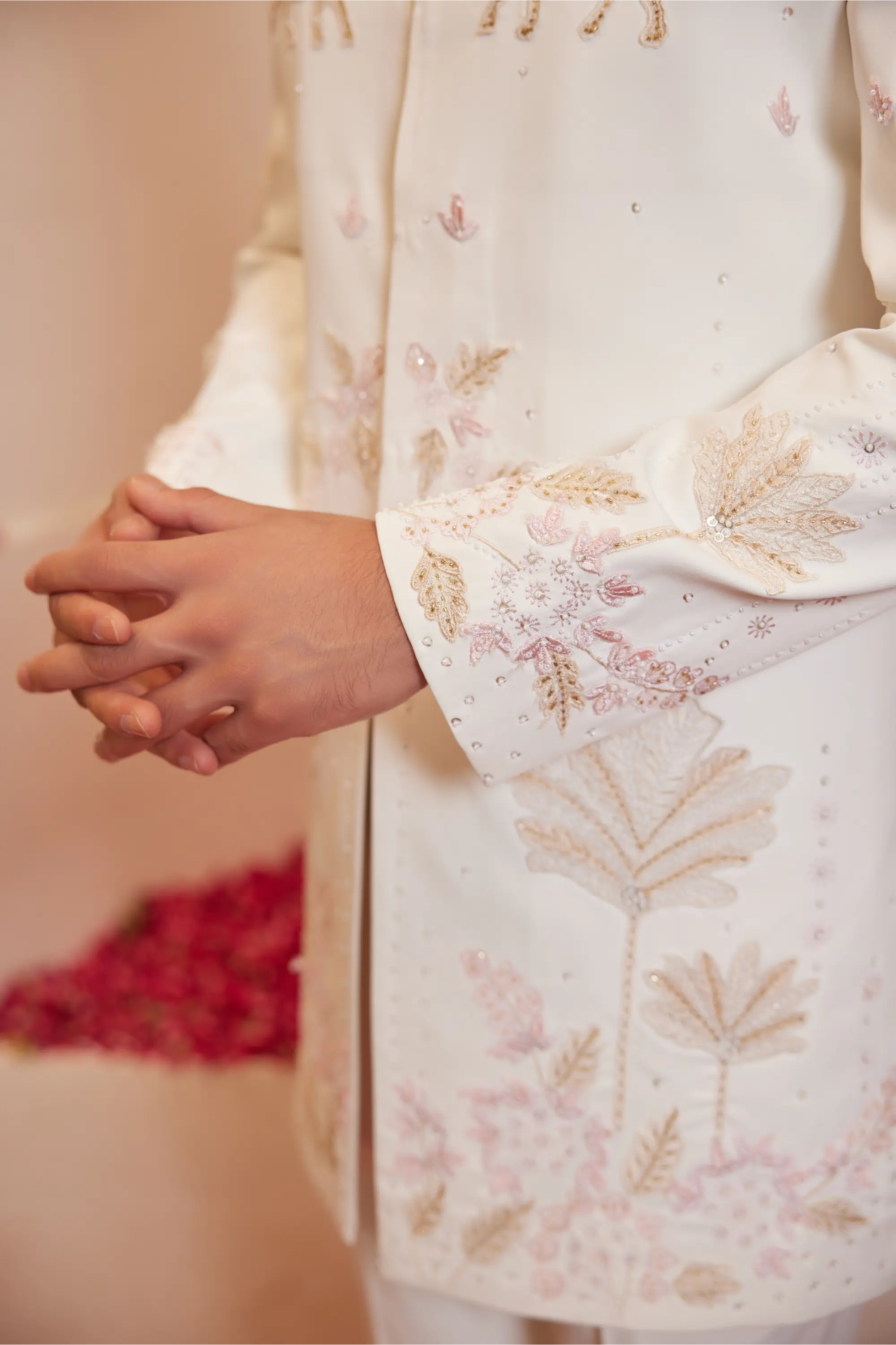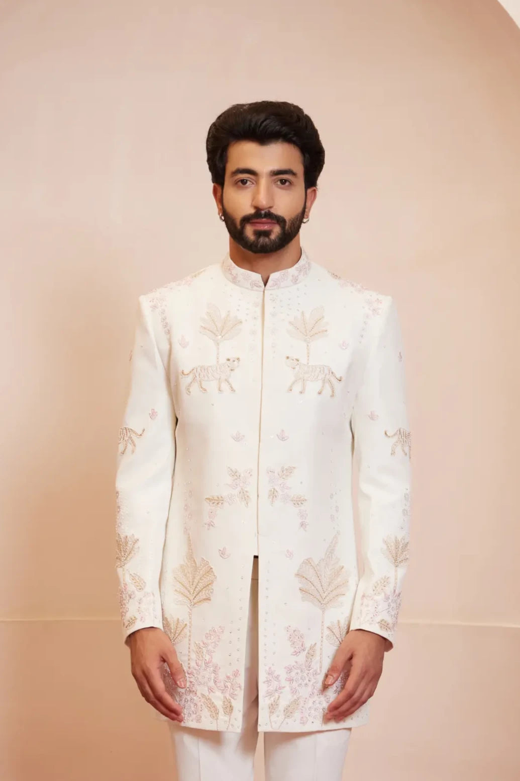 The "Parikshit" Indo jacket in classic ivory Italian TR fabric is adorned with intricate hand embroidery featuring floral, tree, and animal motifs. Crafted with delicate thread work, glass beads, and bead embellishments, this jacket captures the beauty of nature in a sophisticated design. Perfect for special occasions, it combines elegance with an artisanal touch, making a timeless statement.